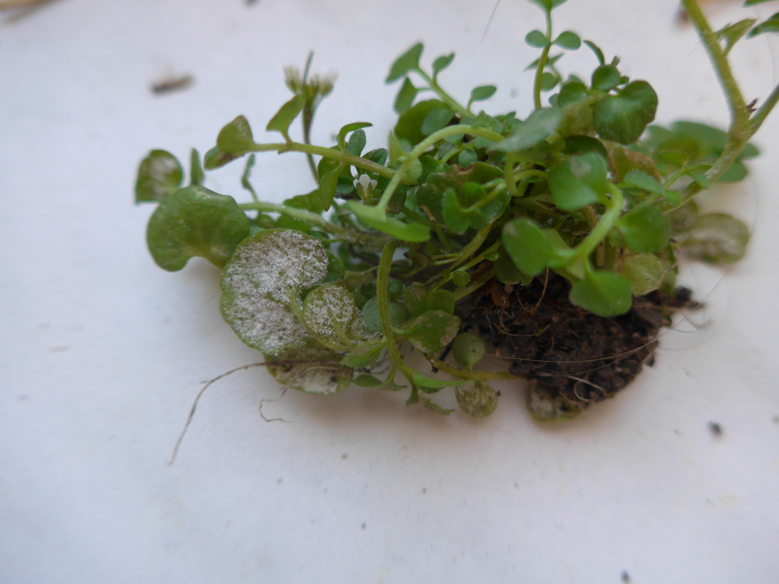 Es fing gut an. Ende März an einer Bushaltestelle fiel mir ein zartes, weißblühendes Pflänzchen auf, was sehr stark mit einem falschen Mehltau befallen war. Die Pflanze konnte sehr schnell als Cardamine hirsuta, das Behaarte Schaumkraut bestimmt werden. Der entsprechende Falsche Mehltau war mittels Klenke/Scholler schnell gefunden. Ich präsentiere Hyaloperonospora nasturtii-aquatici.