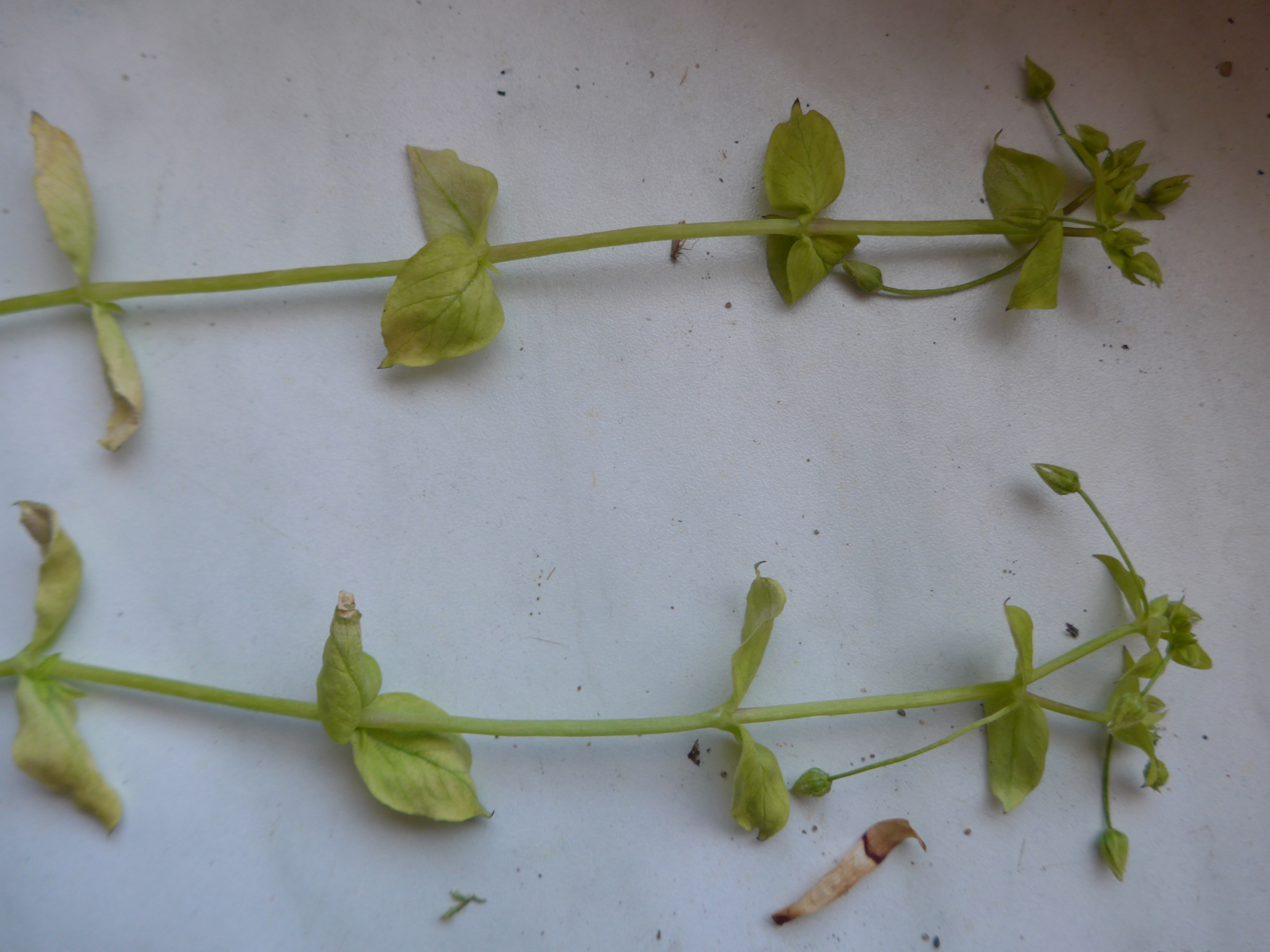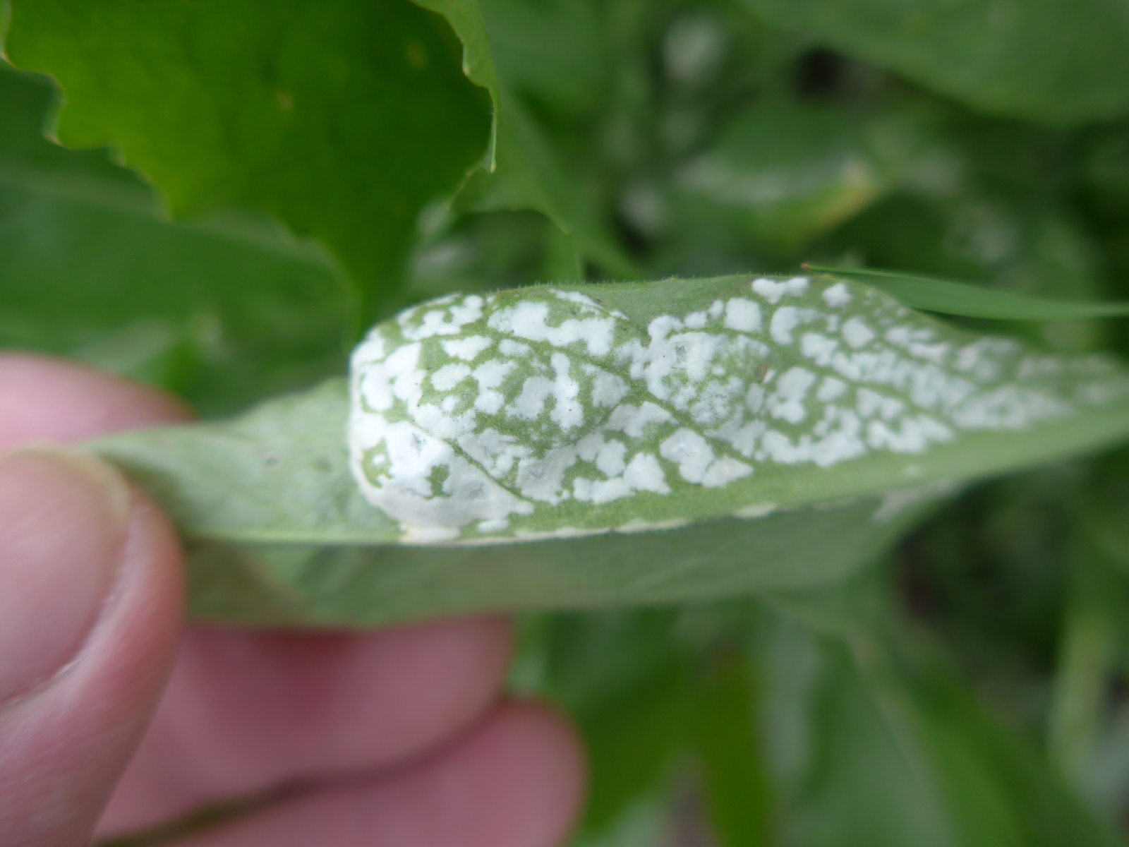 Im Dresdner Raum ist dieser derzeit überall sehr häufig. Peronospora alsinearum an Stellaria media, der allseits beliebten Vogelmiere. Für mich war es sehr überraschend, wie groß und kräftig die Vogelmiere so werden kann; mit immerhin einer Blattänge von 3,5 cm sehr beachtlich. Aufgrund der Größe war ich mir unsicher, ob das nicht doch was anderes sein könnte. War es dann aber doch nicht.
