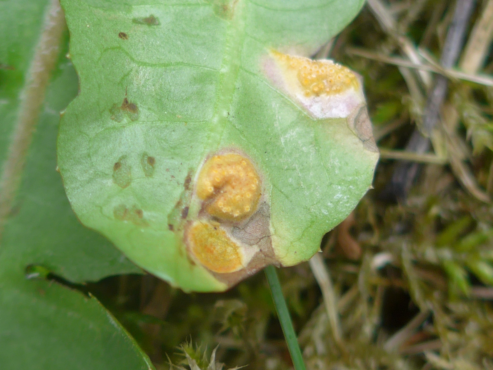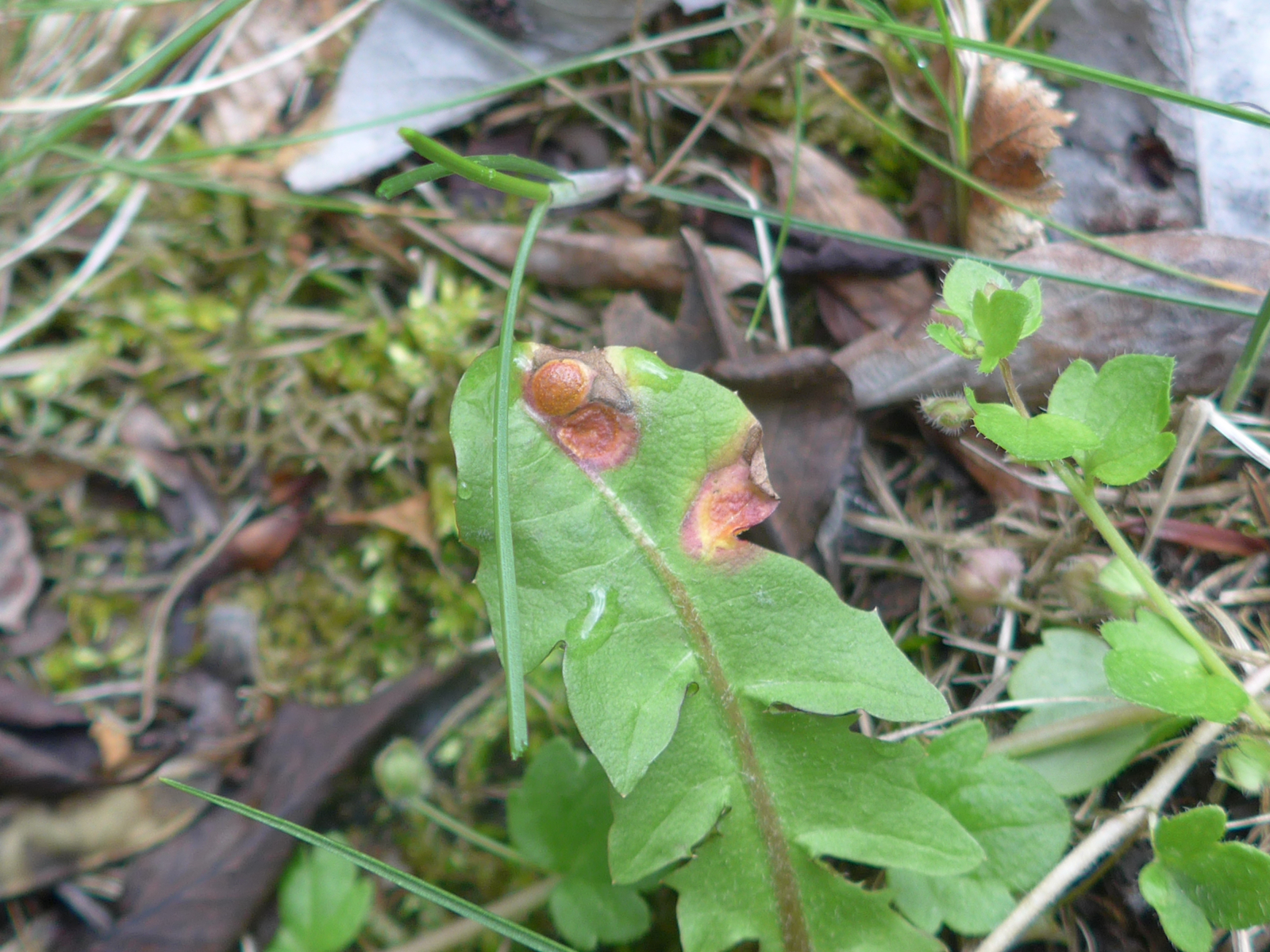 Puccinia cf silvatica an Taraxacum sect. ruderalia, dem Löwenzahn. Das cf lasse ich der Form halber stehen. Der Fund kommt noch unters Mikro.
