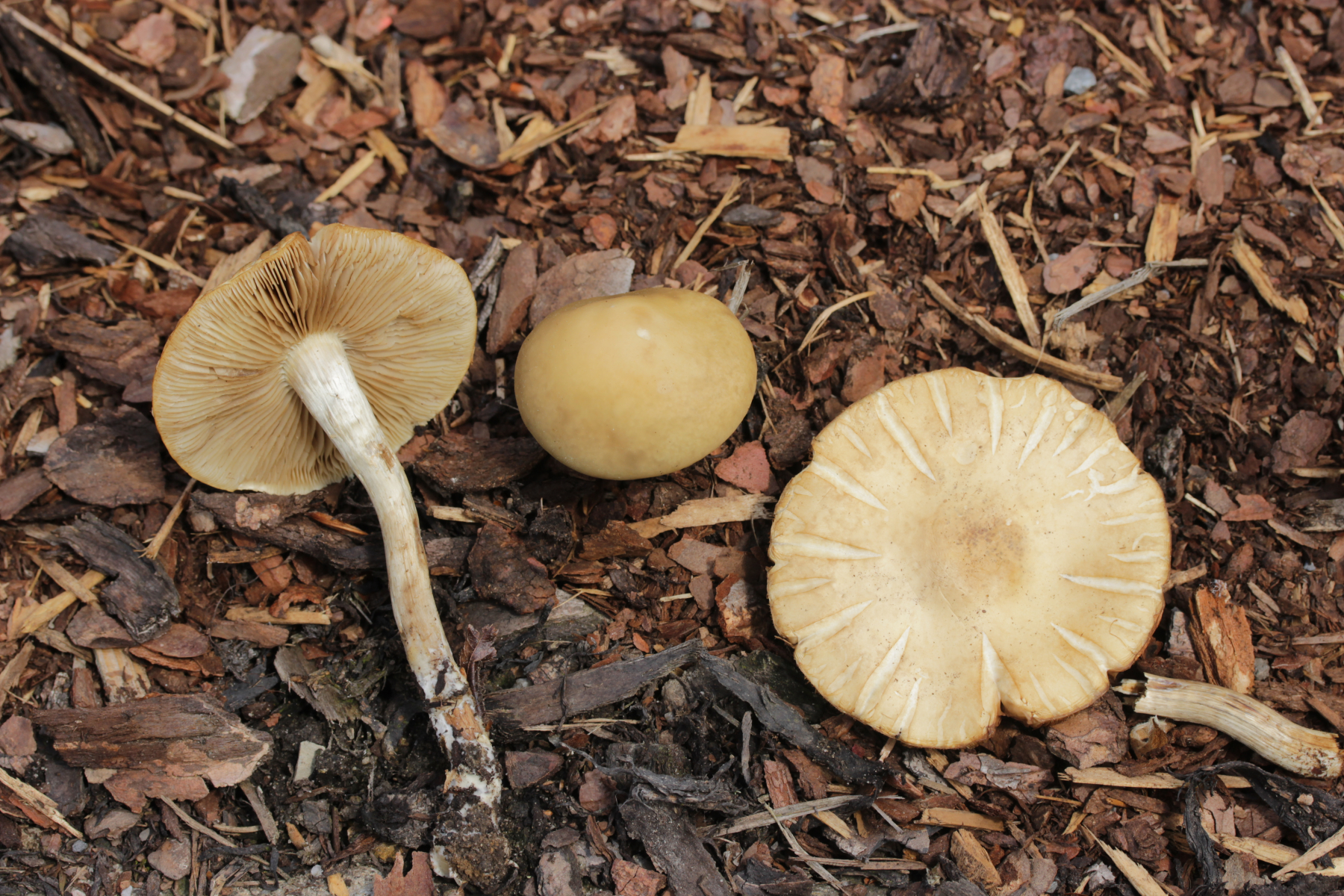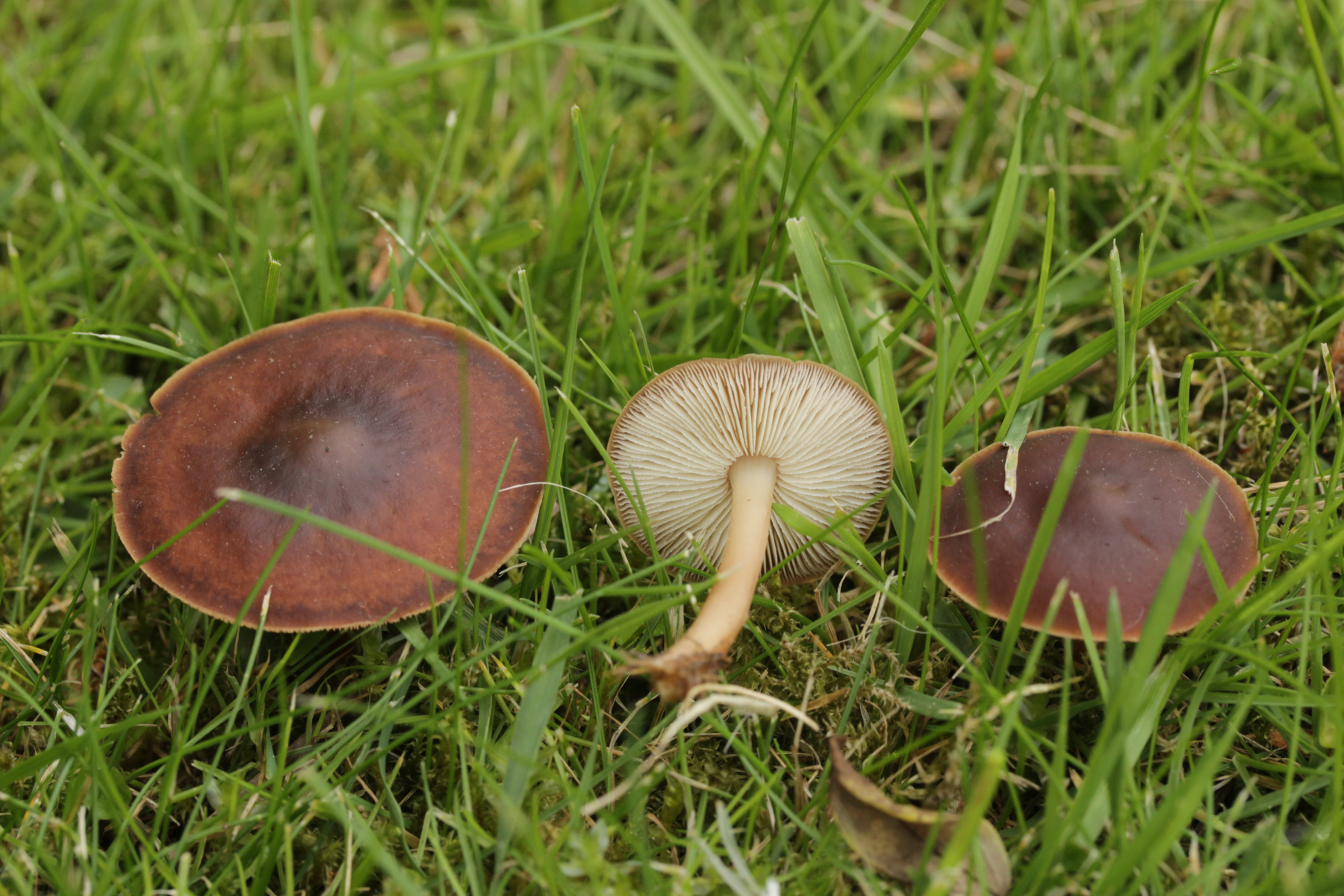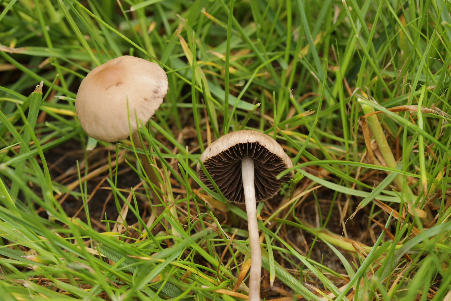 2 = Agrocybe pediades s.l. (Raustieliger Ackerling iwS), dürfte beim Zerreiben mehlartig riechen.
