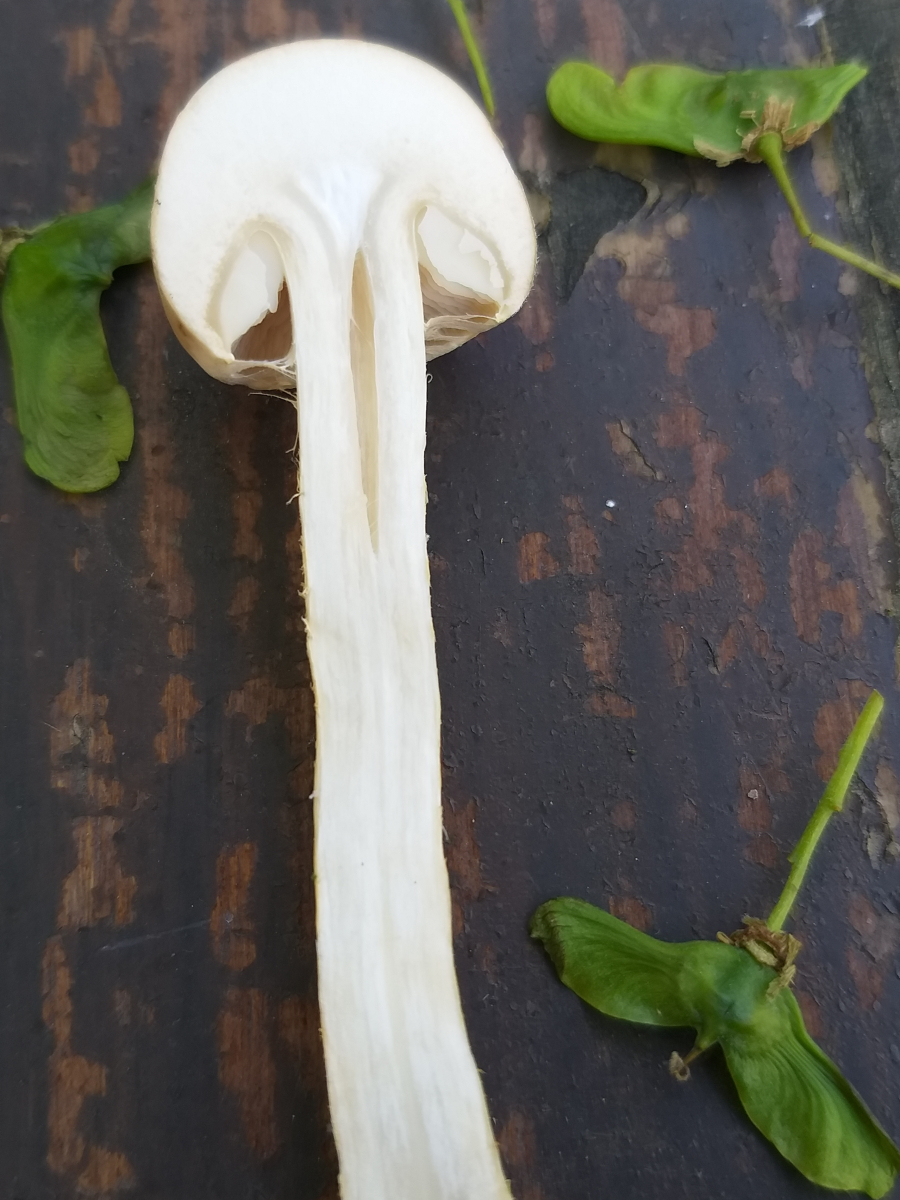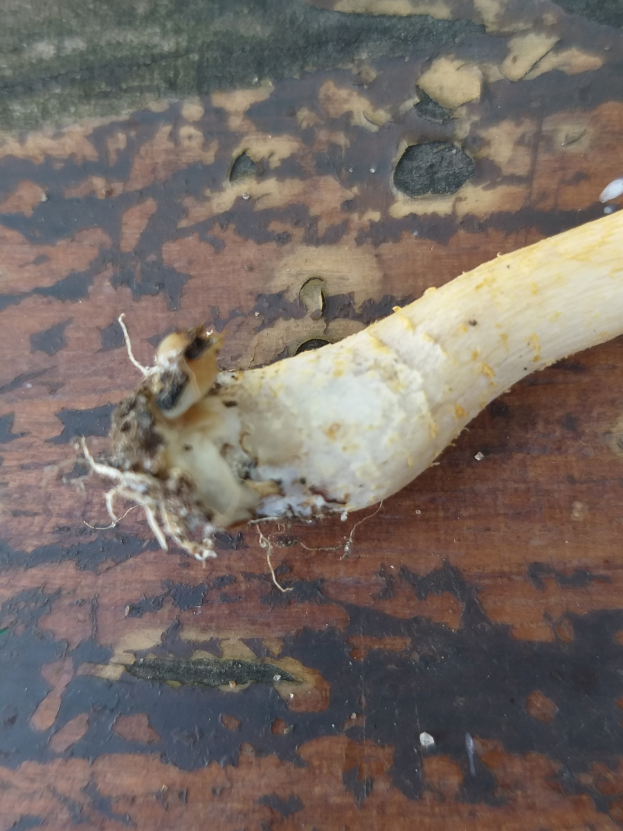 Stiel ca. 70 mm lang ca. 8mm Durchmesser, weiss mit gelben Schüppchen, Basis etwas knollig verdickt mit Mycelresten, Spitze hohl.
