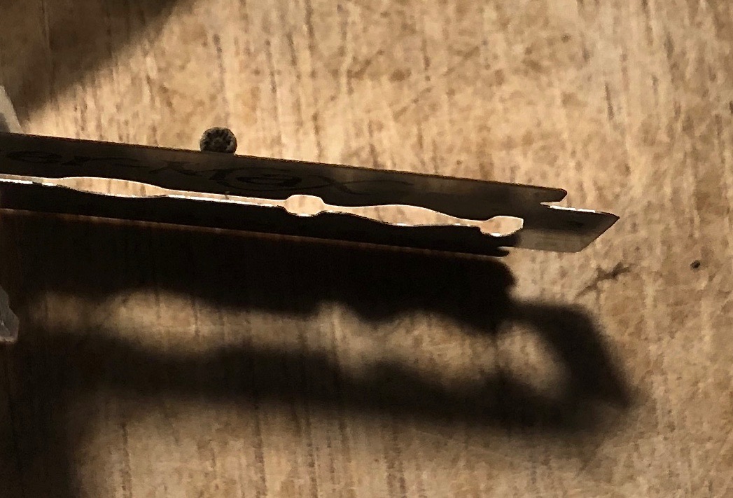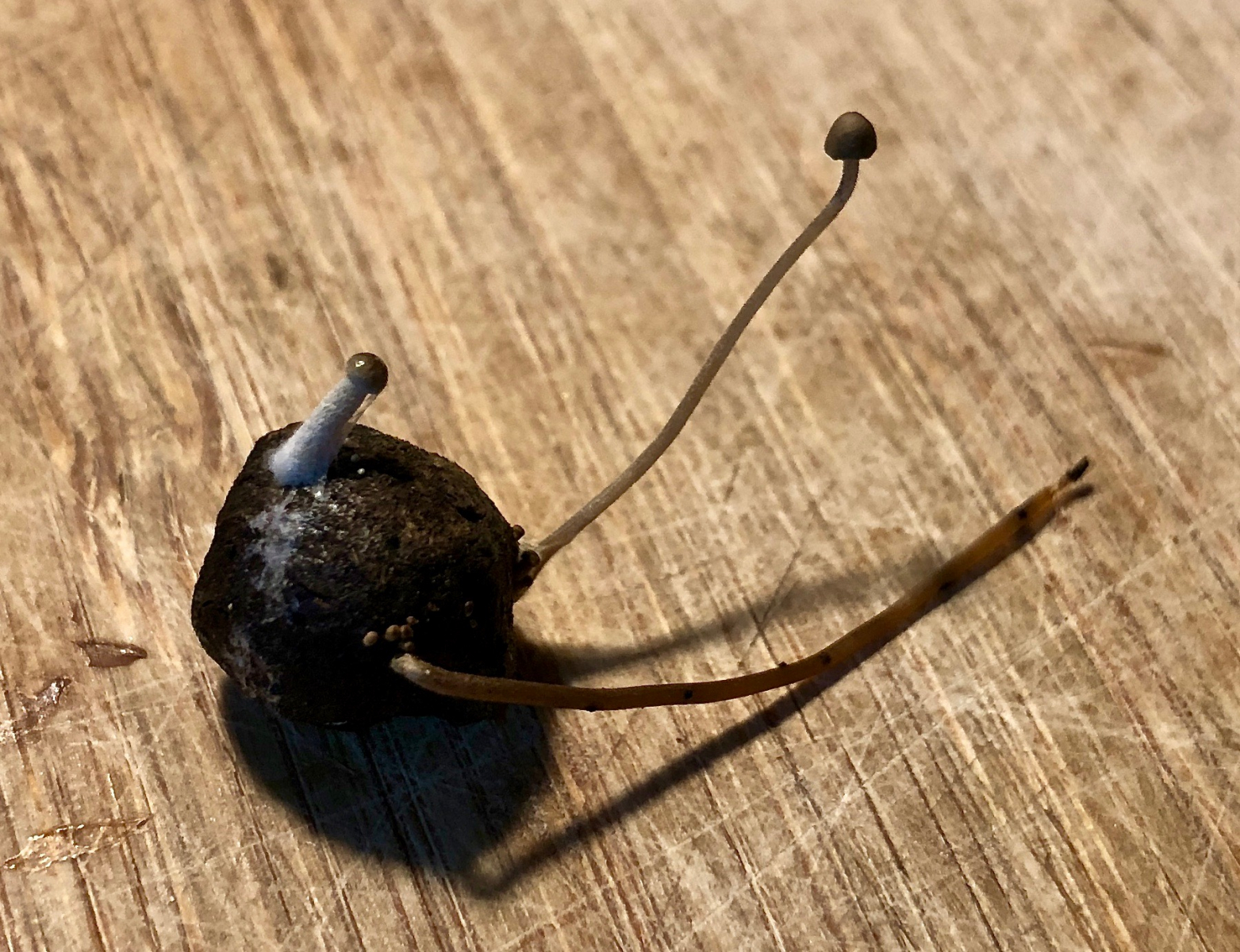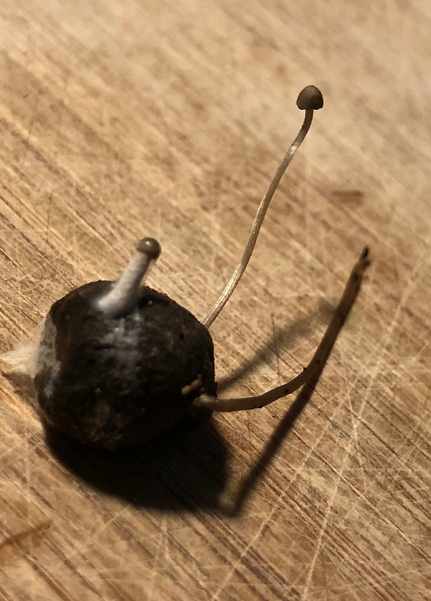 Die Fotos vom Pilz sind nicht so gut, aber erkennbar, worum es sich handelt ist es. Der Pilz hatte sehr wenige Lamellen, ein bisschen ist das auf dem Abschnitt, der noch an der Rasierklinge klebt, zu erkennen. Ein bisschen Schimmel ist vom Köder auf den Pilz gewachsen, oder was ist das fähige Zeugs um den kleinen Pilz herum?