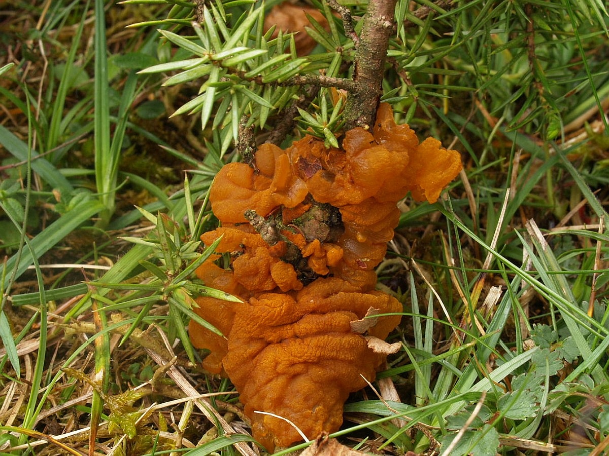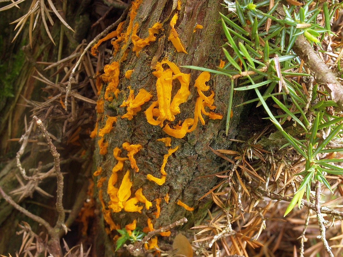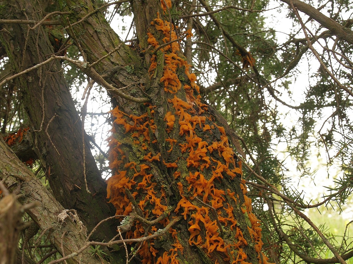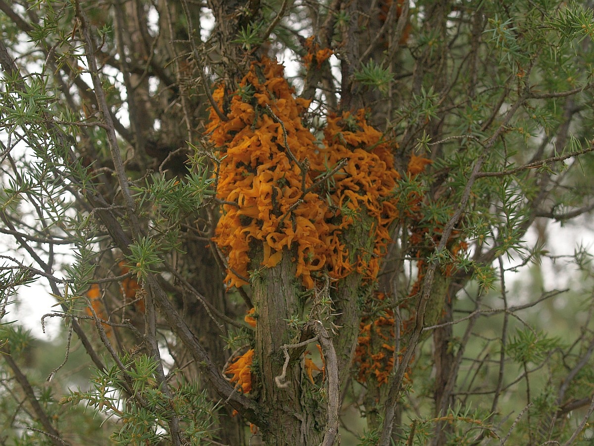 Auf einem ebenfalls mit Wacholder bestandenem Kalkmagerasen in der Nähe, durften wir uns an gewaltigen Megen eines Rostpilzes erfreuen, der meist als Birnen-Giotterrost angesehen wird. Der Birnen-Gitterrost (Gymnosporangium sabine) besiedelt jedoch als Hauptwirt den Sadebaum (Juniperus sabine).