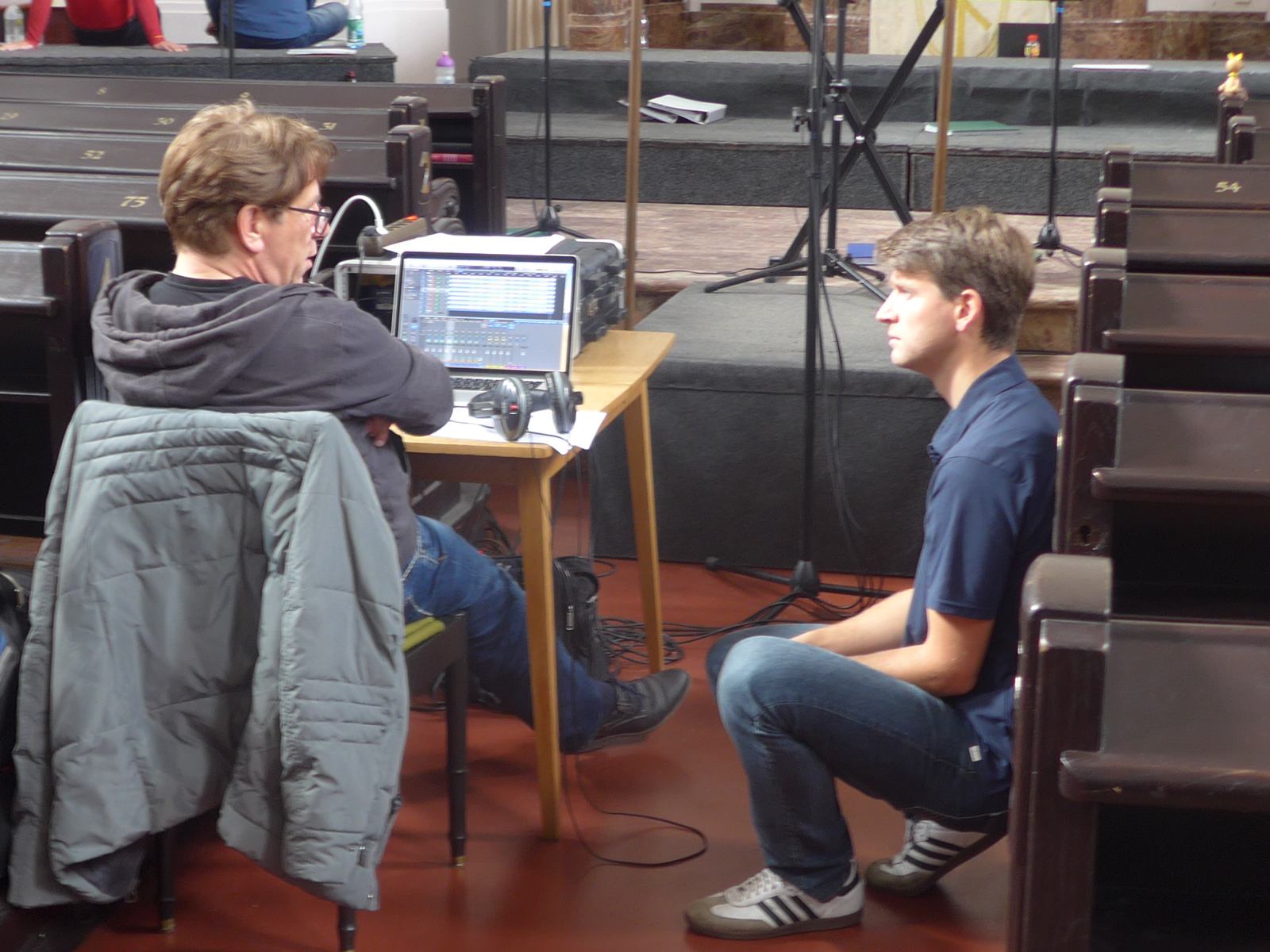 Zwischen den Aufnahmen gab es immer wieder Gespräche zwischen den Chorleitern und dem "Aufnahmeleiter". Zeit für uns mal eine kleine Sitzpause einzulegen und eine Kleinigkeit zu trinken, denn das stundenlange Stehen geht sehr an die Substanz.