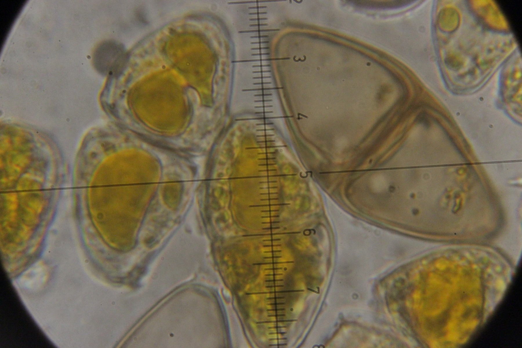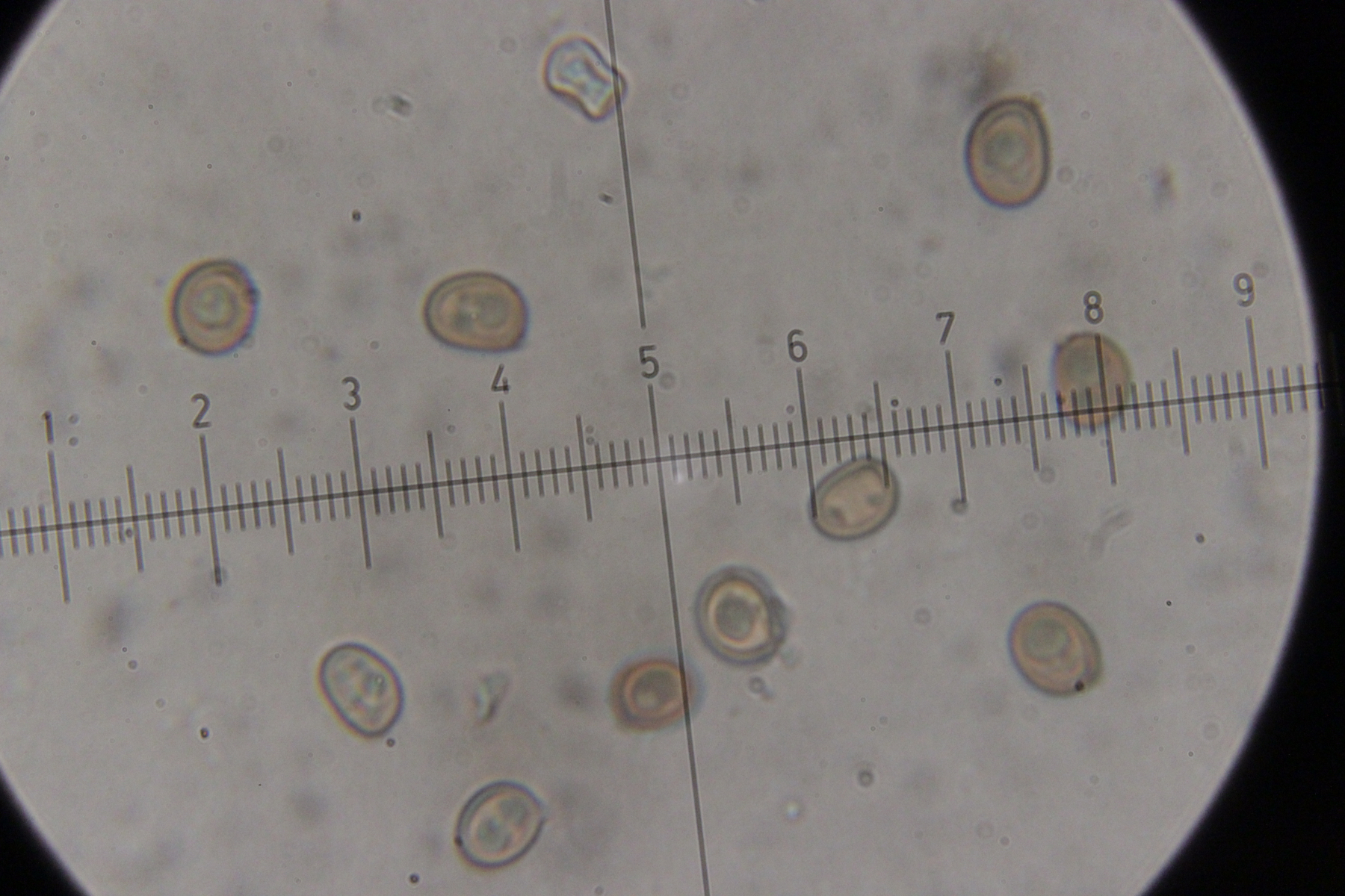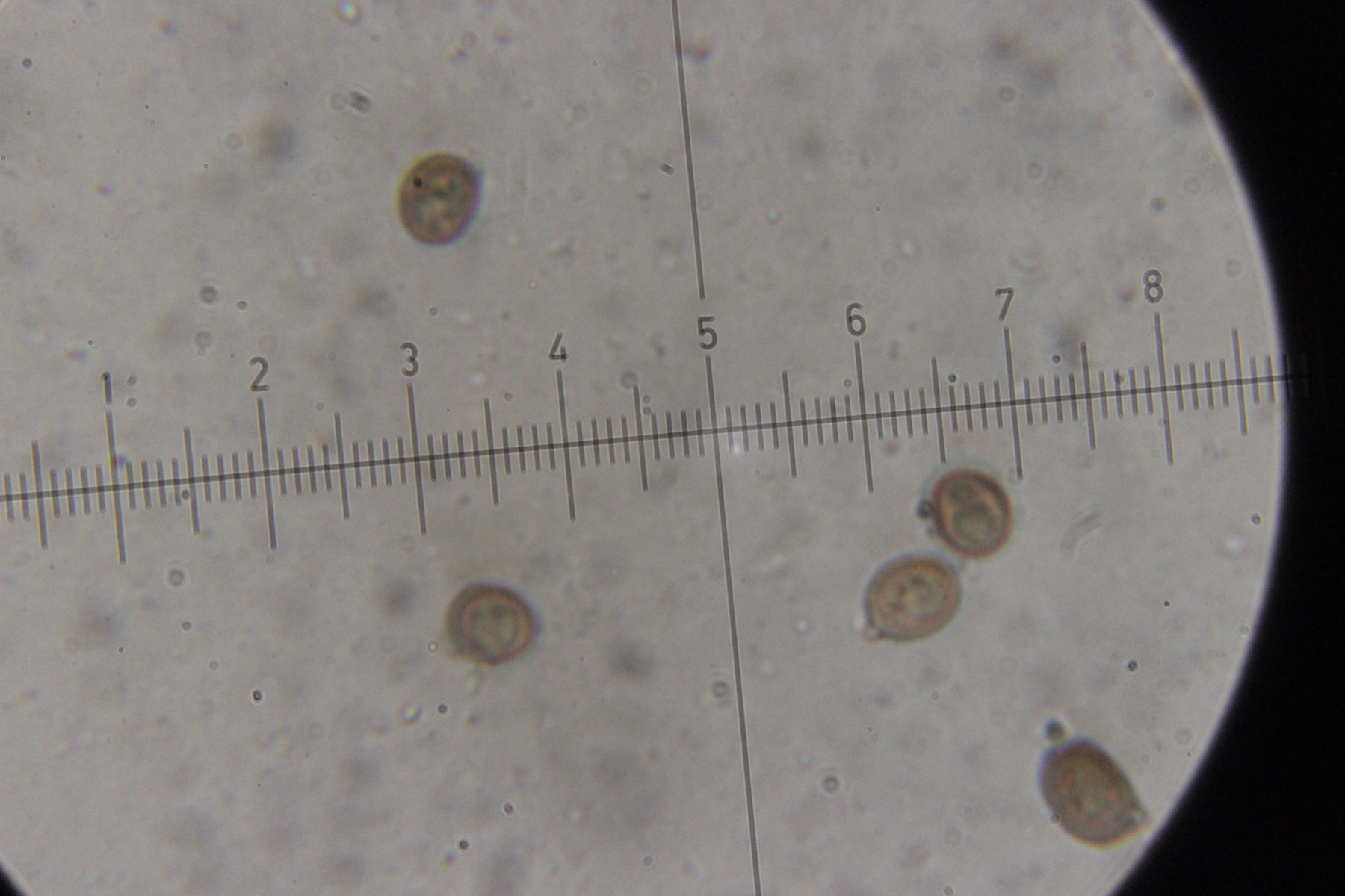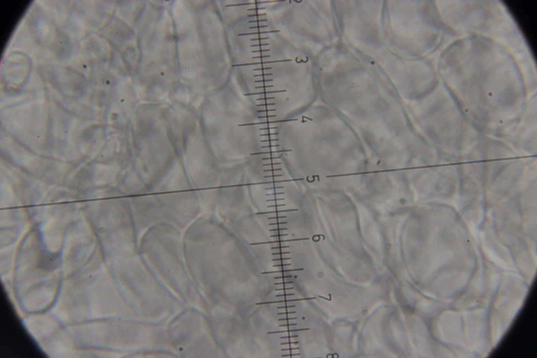 7. Agaricus sp., Sporengröße (6.4+-0.5) µm x (5.1+-0.3) µm. Cheilozystiden konnte ich bis jetzt noch keine entdecken, nur 4-sporige Basidien. Wobei ich aber auch sagen muß, daß die Lamellenschneide unterm Mikroskop nicht so wirklich gut beobachtbar war. Ohne Quetschen wirkte sie irgendwie verklebt und nach dem Quetschen war halt schwer zu sagen, was mal Schneide war. Ansonsten hatte der Pilz einen nach unten abziehbaren Ring, roch angenehm pilzig und zeigte keine Verfärbungen irgendwelcher Art. Mit KOH (3% und 20%) gab es an Stiel, Fleisch und Hut auch keine Reaktion.