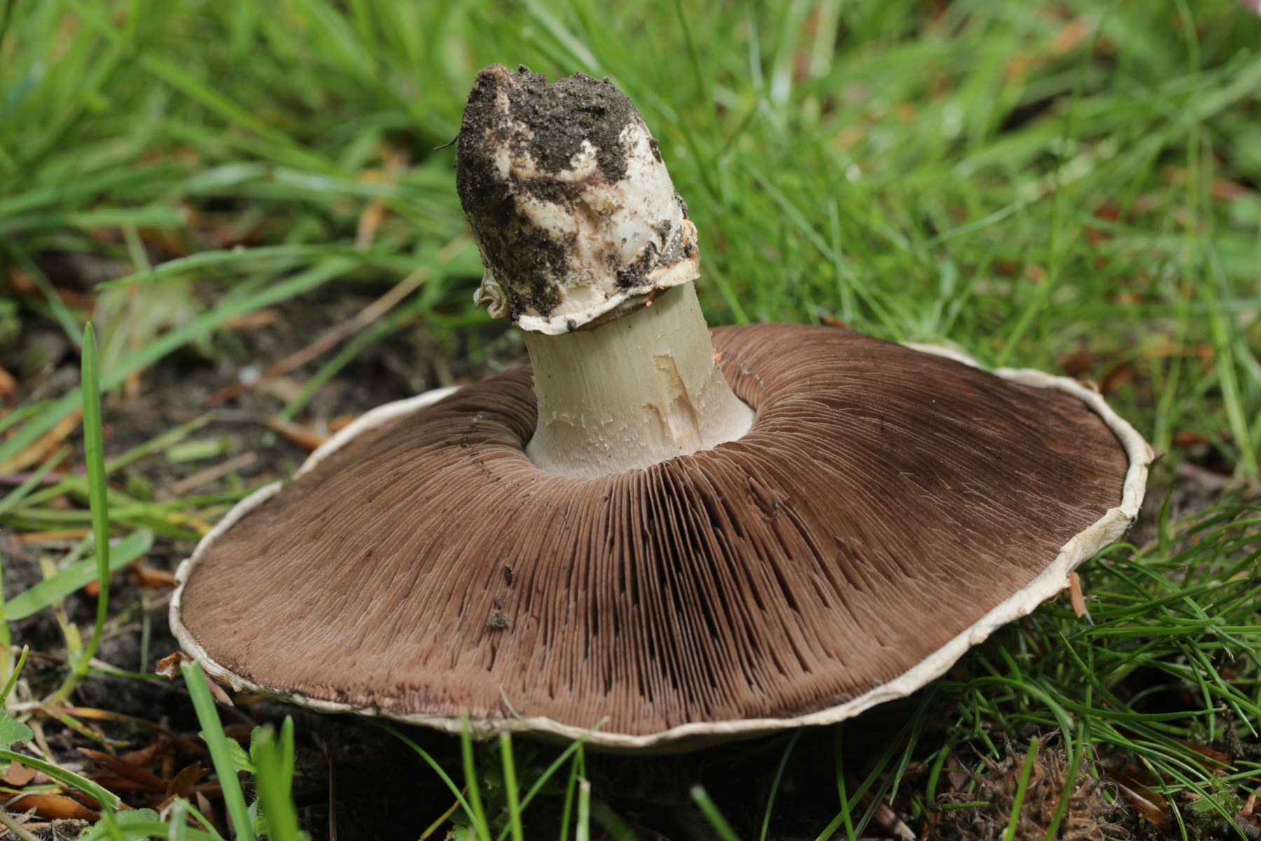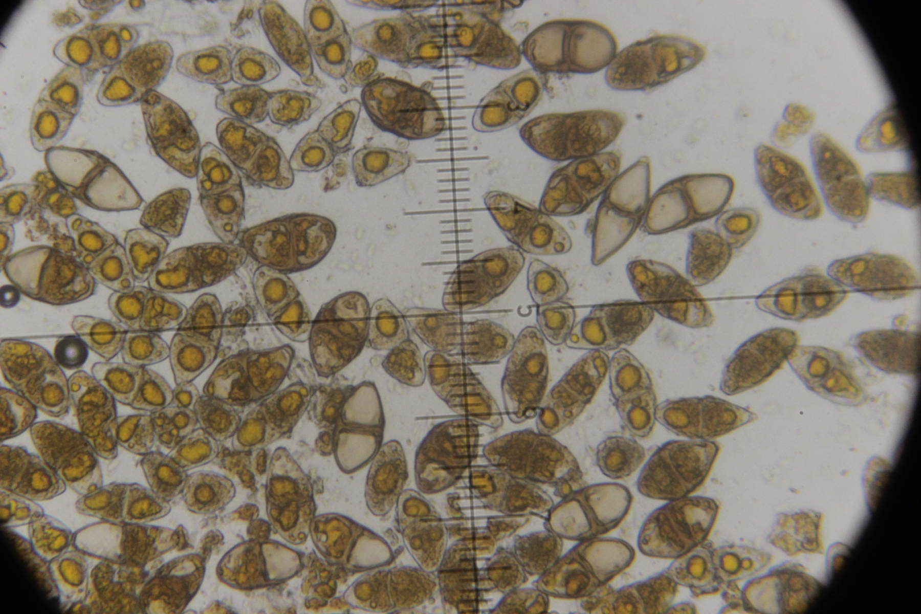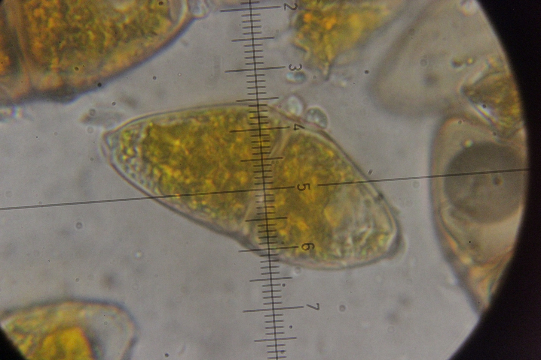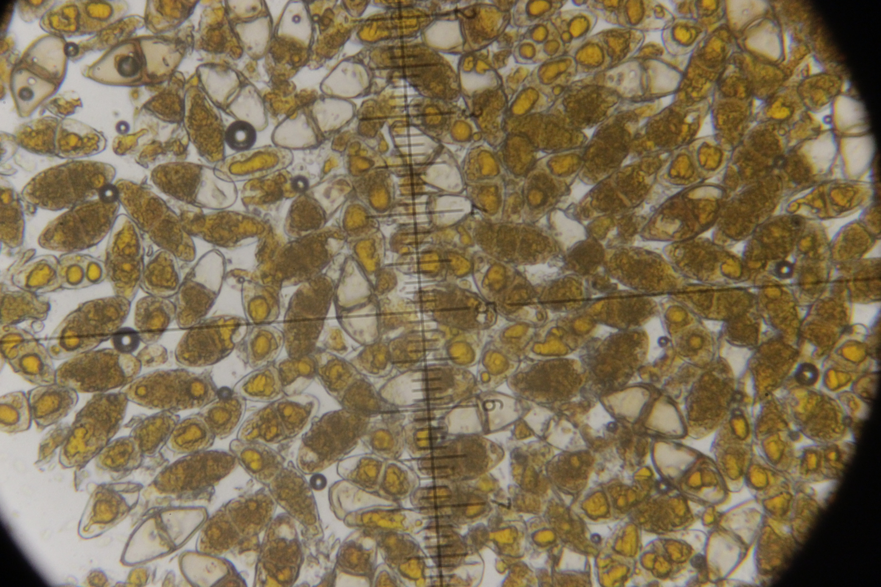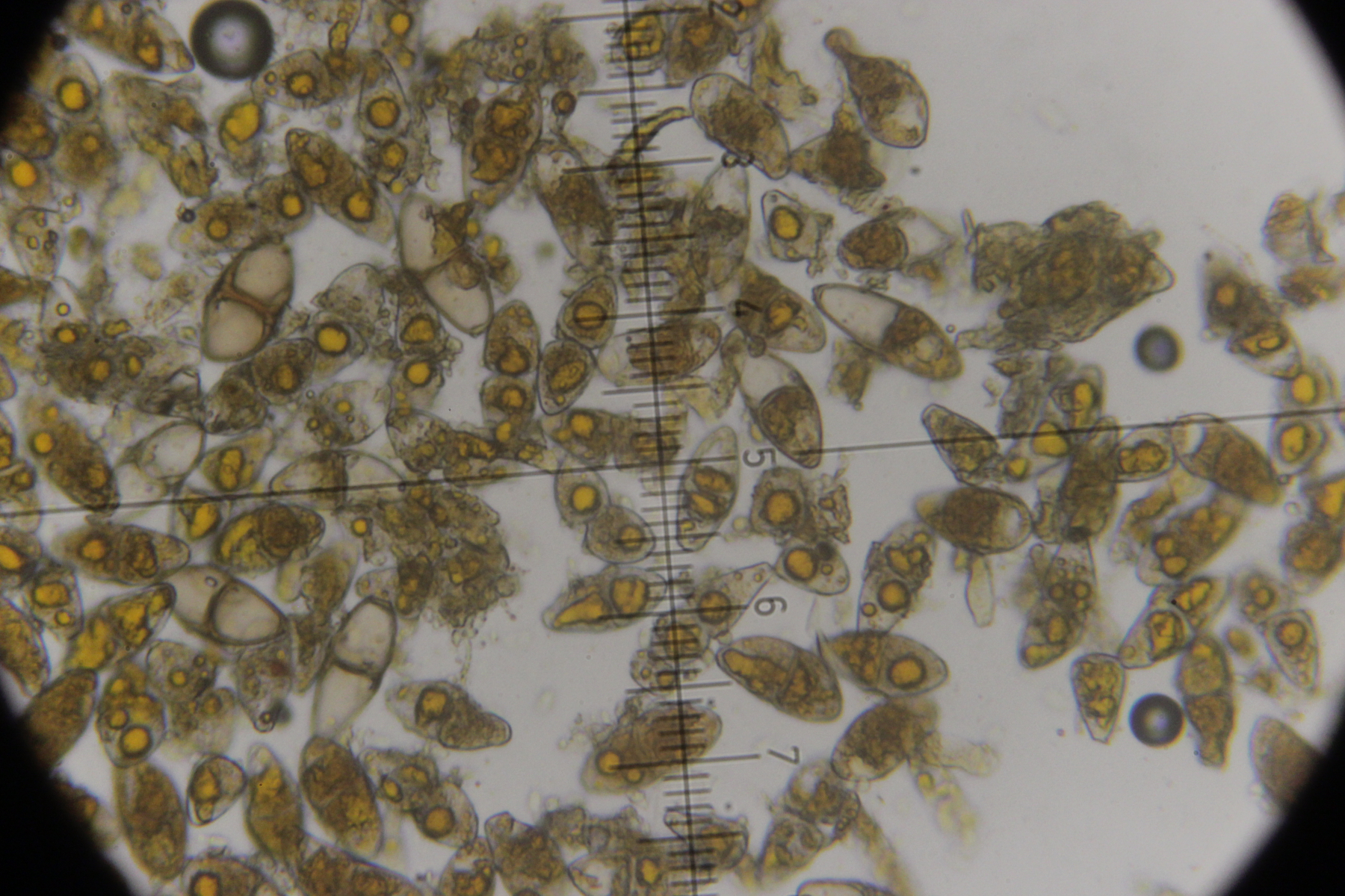 7. Agaricus sp., Sporengröße (6.4+-0.5) µm x (5.1+-0.3) µm. Cheilozystiden konnte ich bis jetzt noch keine entdecken, nur 4-sporige Basidien. Wobei ich aber auch sagen muß, daß die Lamellenschneide unterm Mikroskop nicht so wirklich gut beobachtbar war. Ohne Quetschen wirkte sie irgendwie verklebt und nach dem Quetschen war halt schwer zu sagen, was mal Schneide war. Ansonsten hatte der Pilz einen nach unten abziehbaren Ring, roch angenehm pilzig und zeigte keine Verfärbungen irgendwelcher Art. Mit KOH (3% und 20%) gab es an Stiel, Fleisch und Hut auch keine Reaktion.