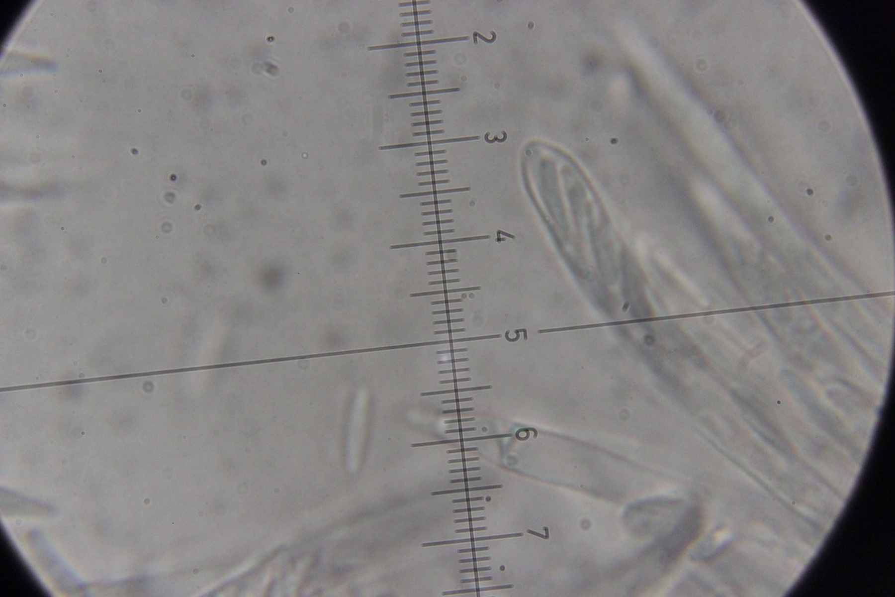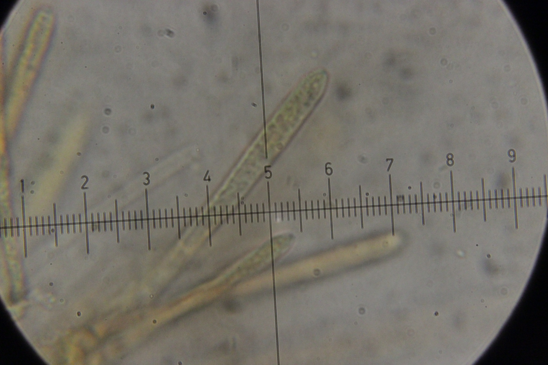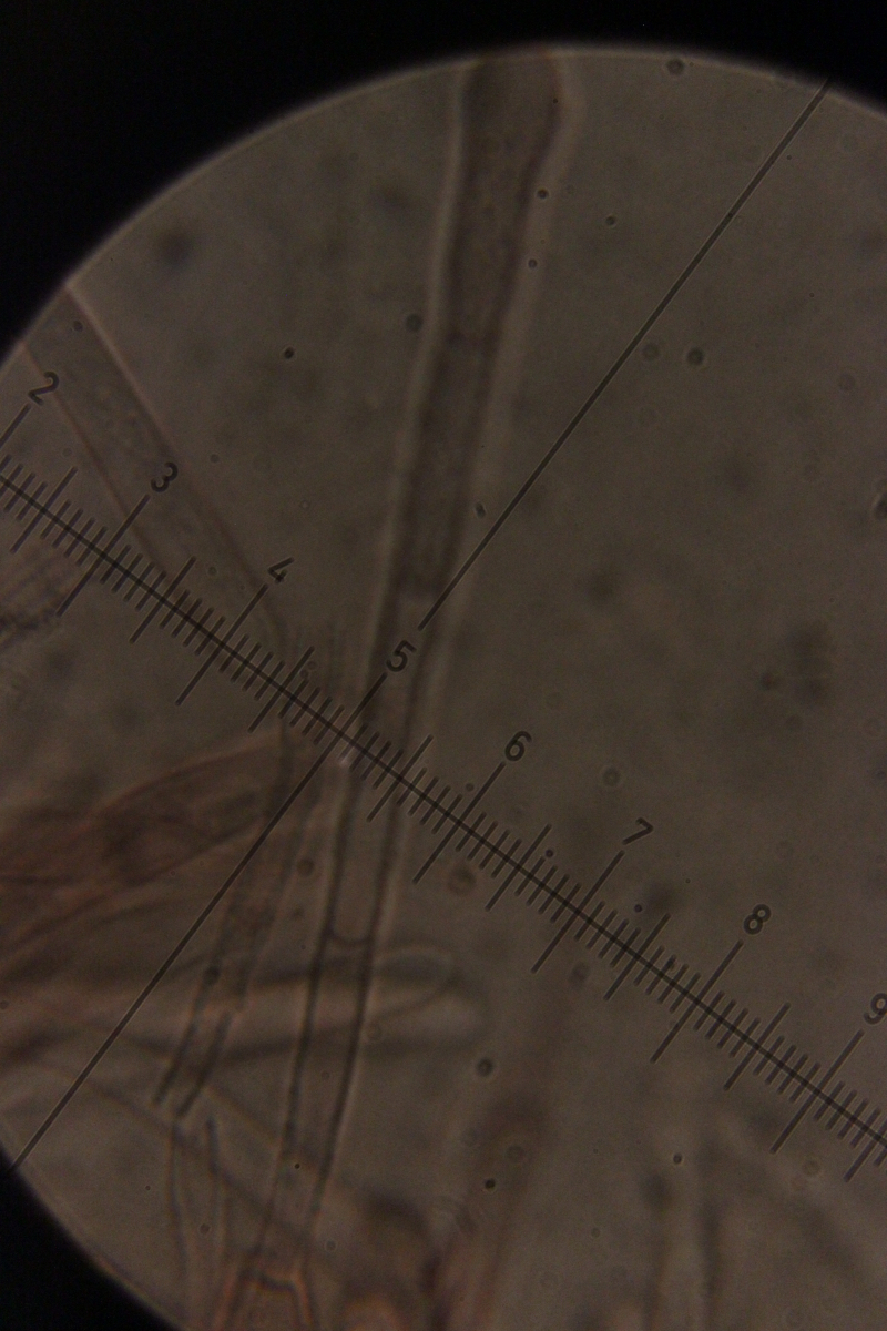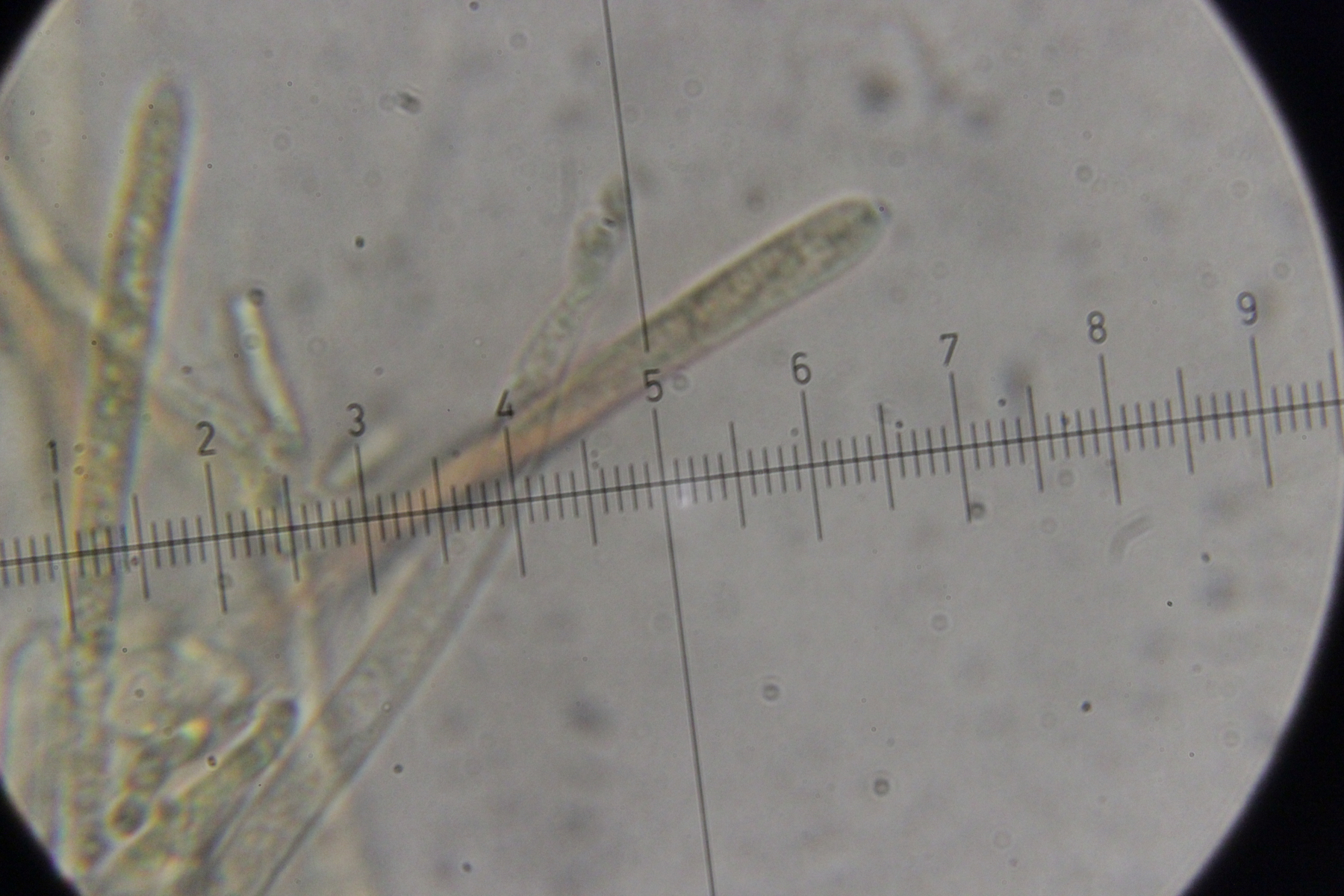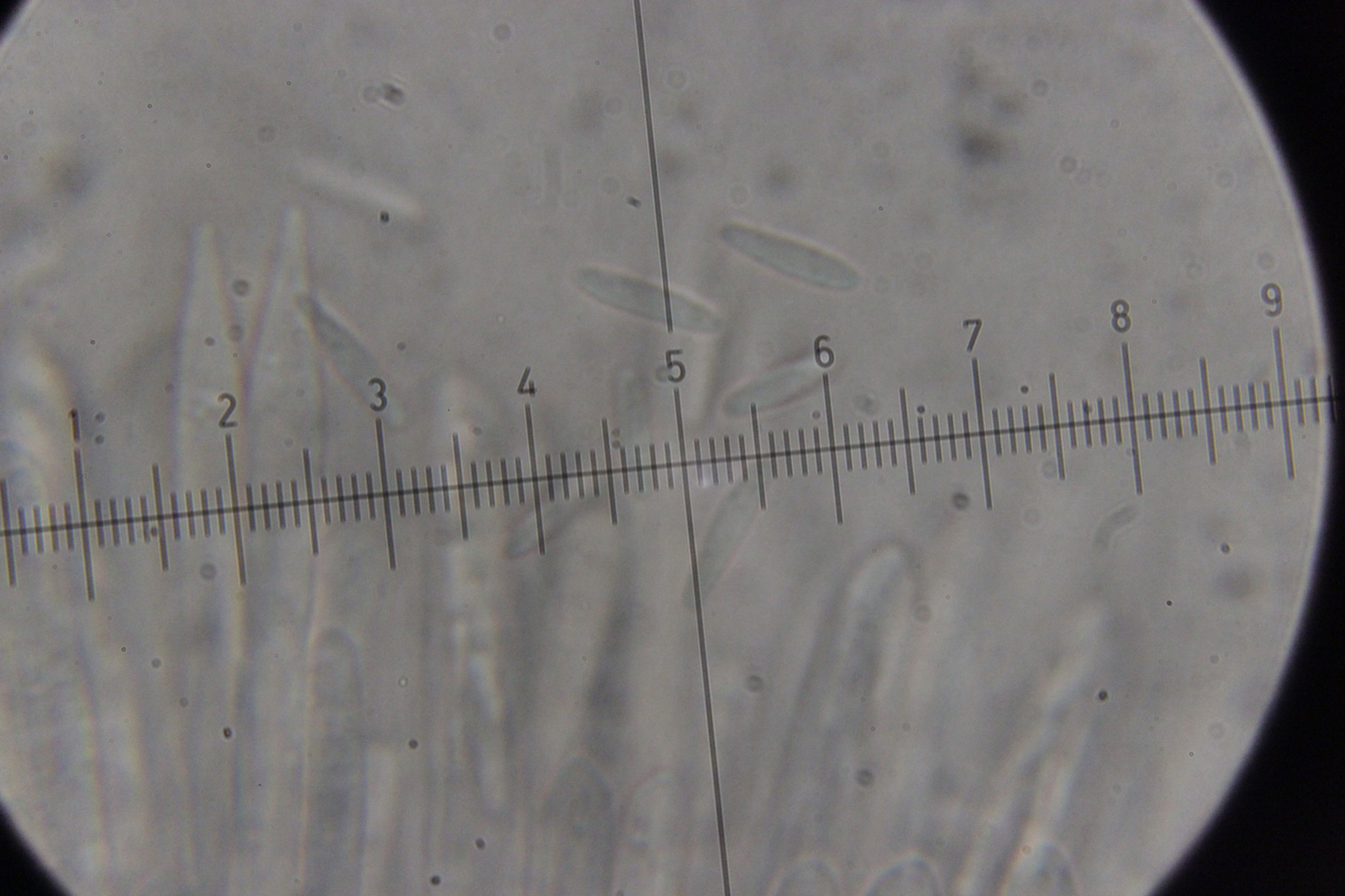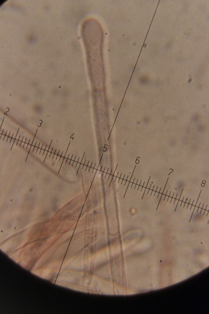 5. Das dürfte Lachnum virgineum auf alten Rubus-Stängeln sein (der Farbton täuscht auf den Bildern, die Fruchtkörper waren rein weiß). Haare waren oben keulig verdickt, teilweise septiert und um die 80 µm lang. Asci hatten Haken und reagierten mit Lugol blau. Die Paraphysen sind spitz, um die 70 µm lang und überragten die Asci meistens ein Stück.