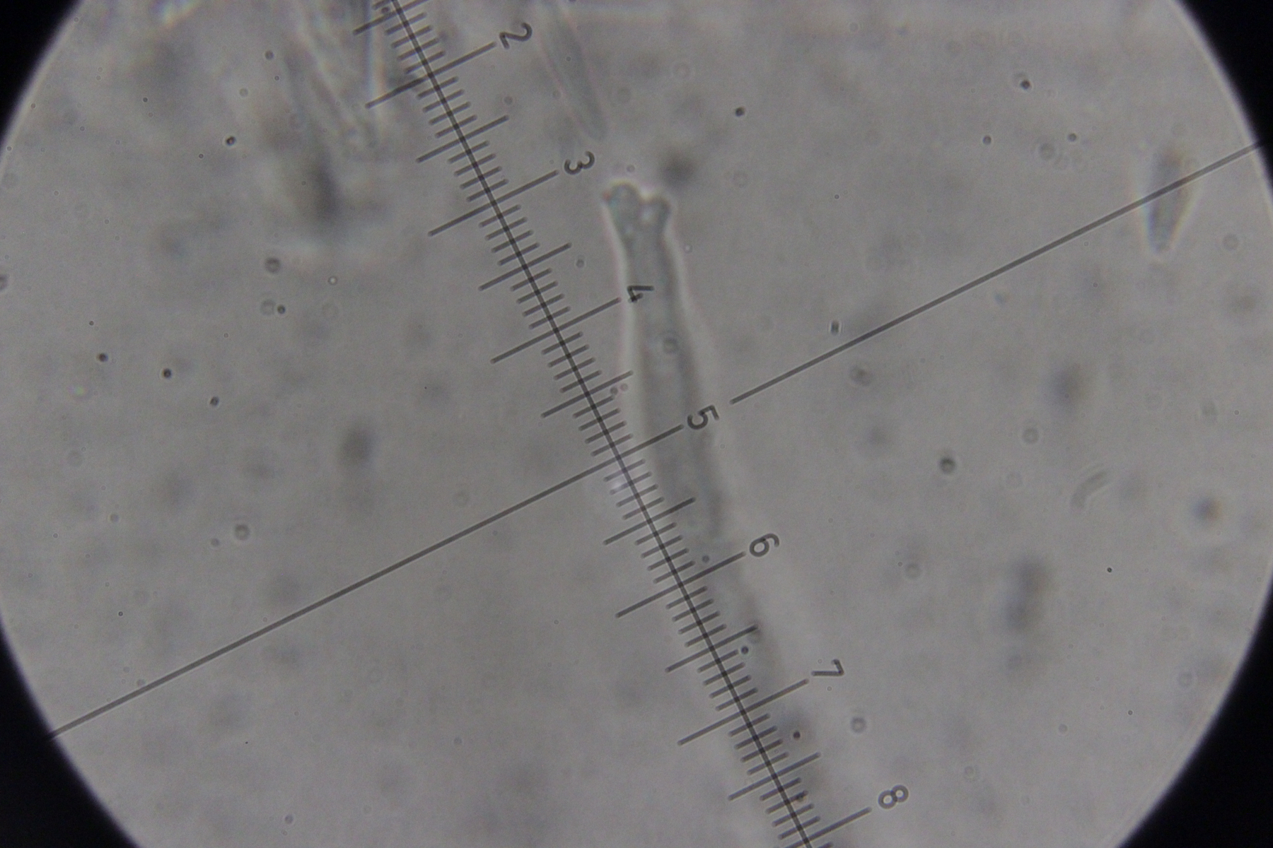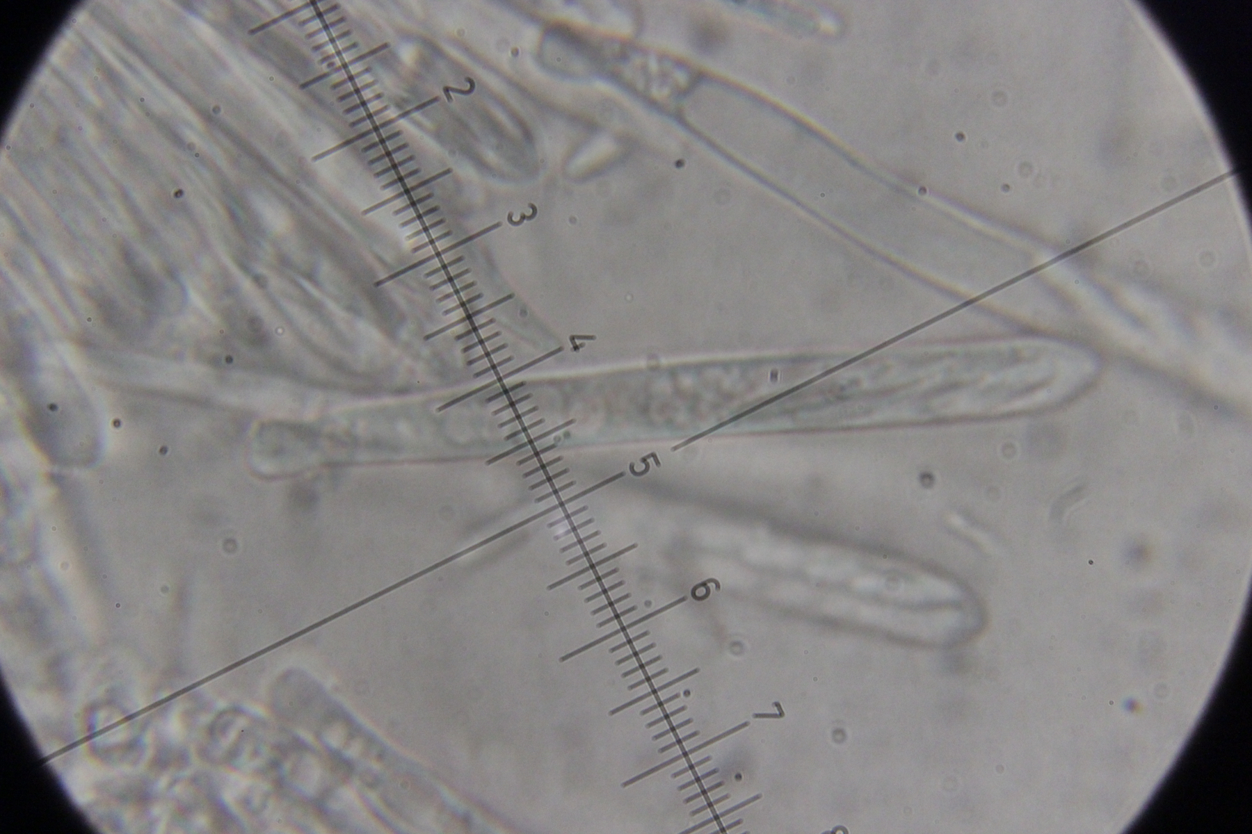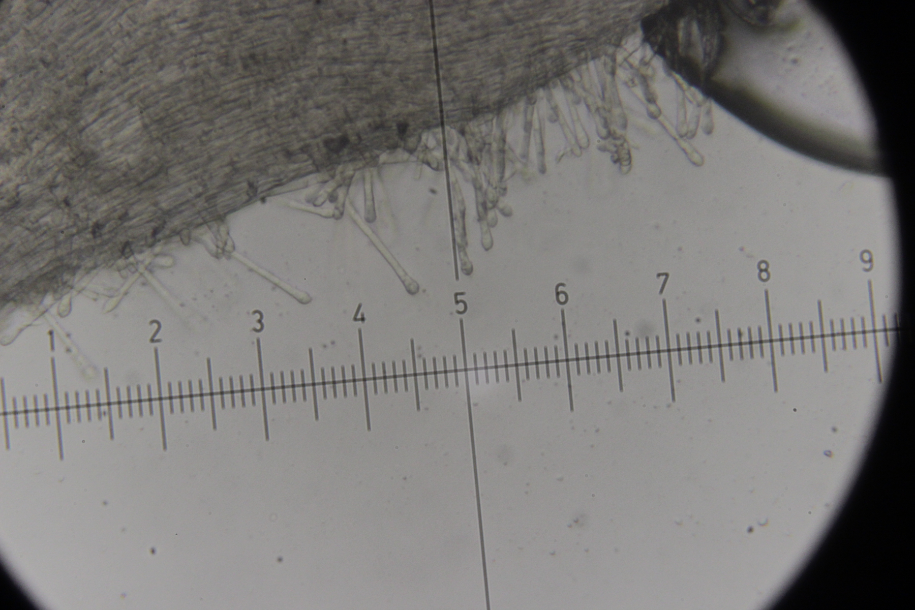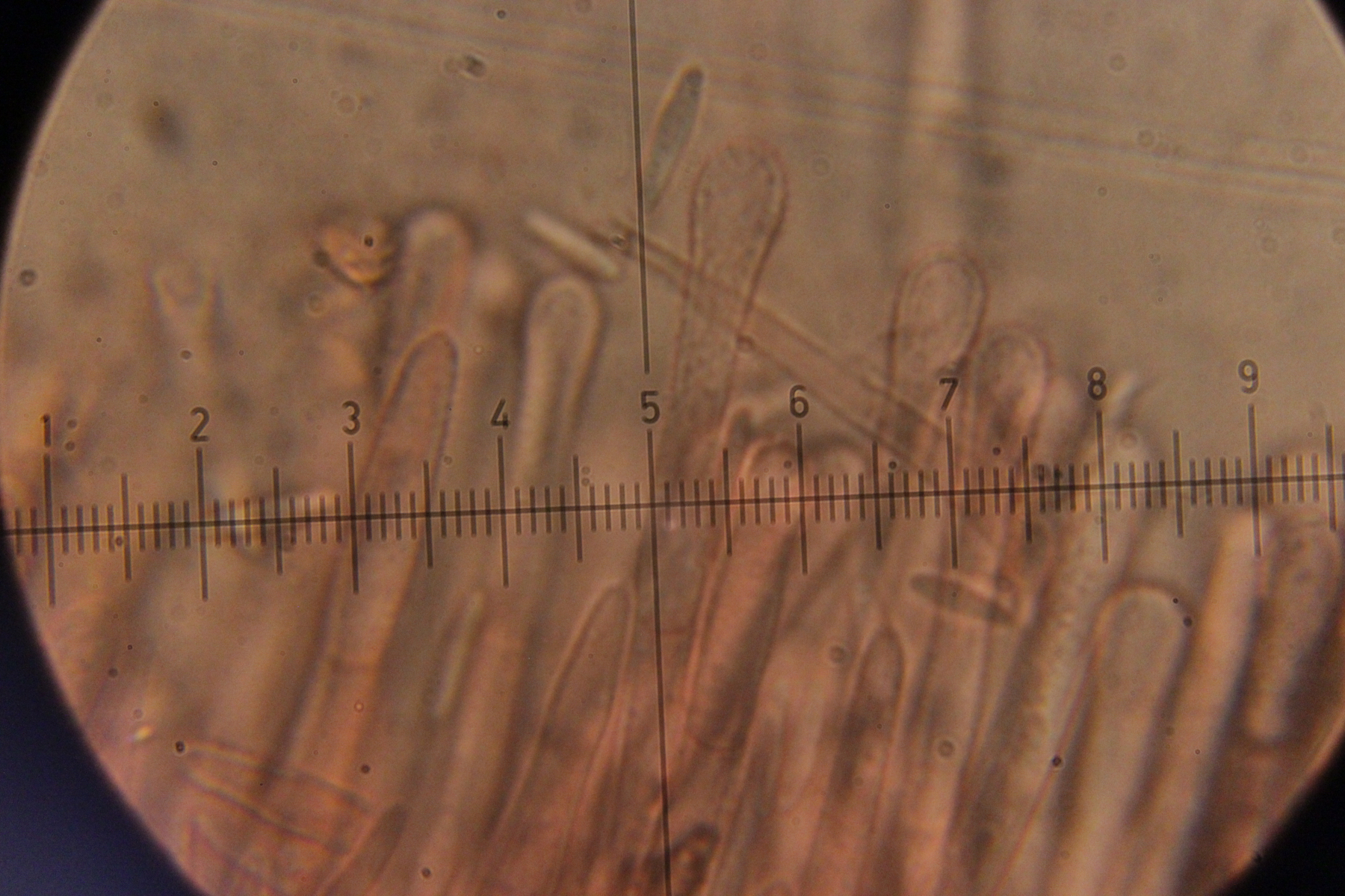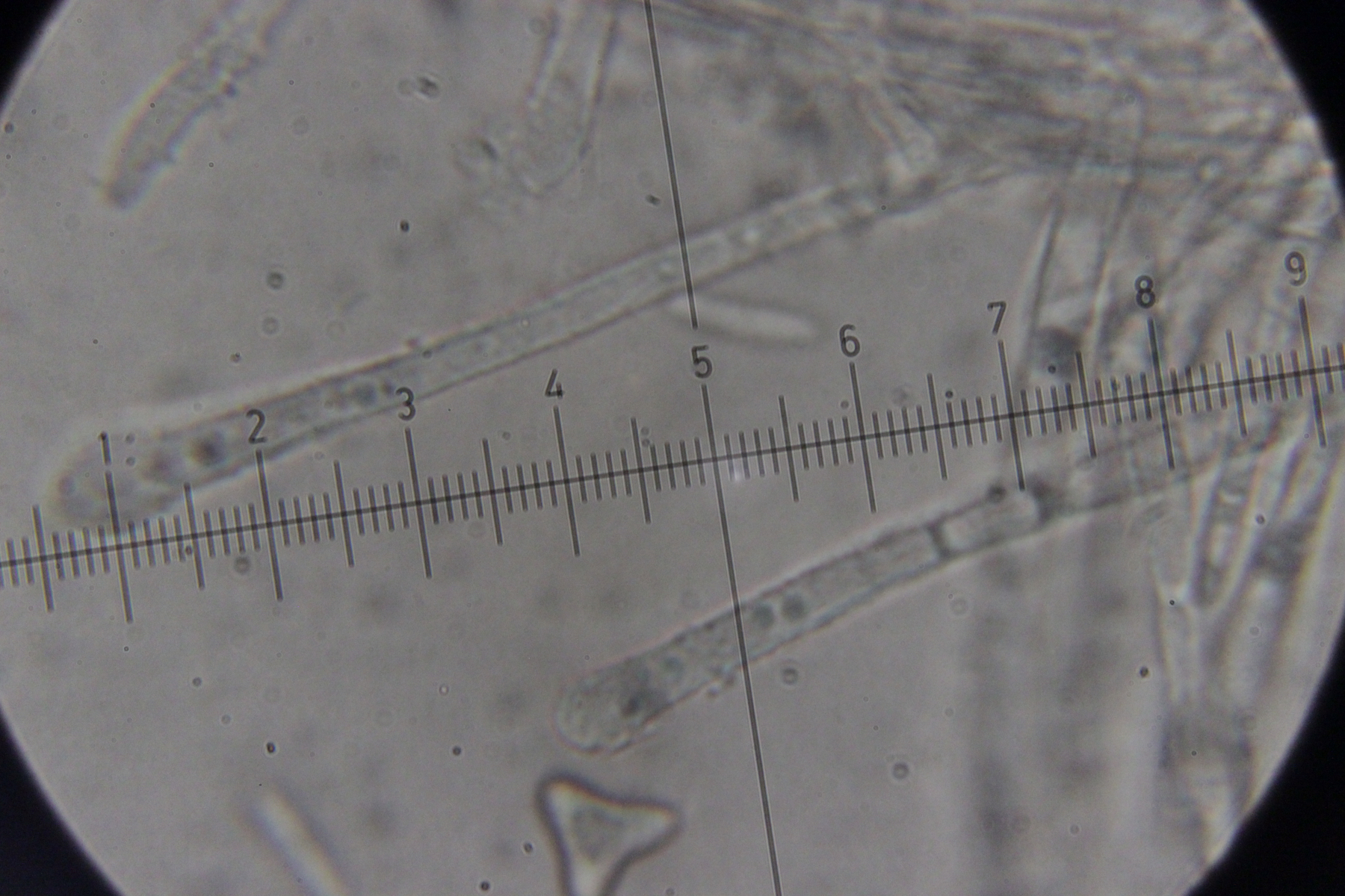 5. Das dürfte Lachnum virgineum auf alten Rubus-Stängeln sein (der Farbton täuscht auf den Bildern, die Fruchtkörper waren rein weiß). Haare waren oben keulig verdickt, teilweise septiert und um die 80 µm lang. Asci hatten Haken und reagierten mit Lugol blau. Die Paraphysen sind spitz, um die 70 µm lang und überragten die Asci meistens ein Stück.