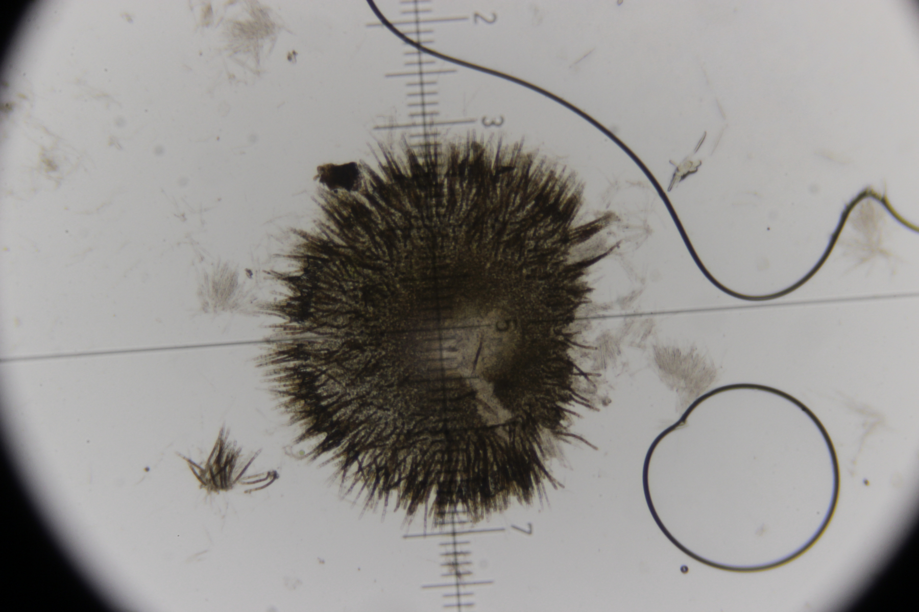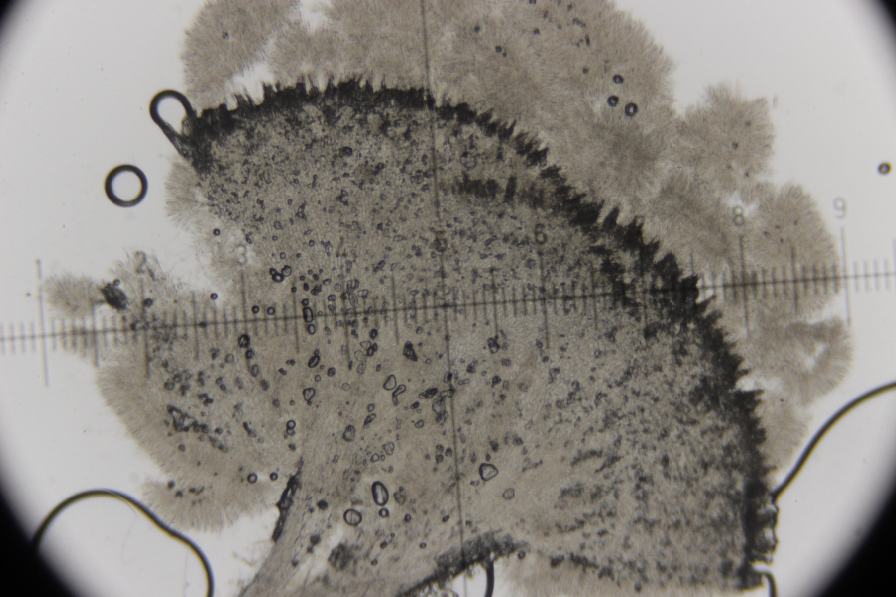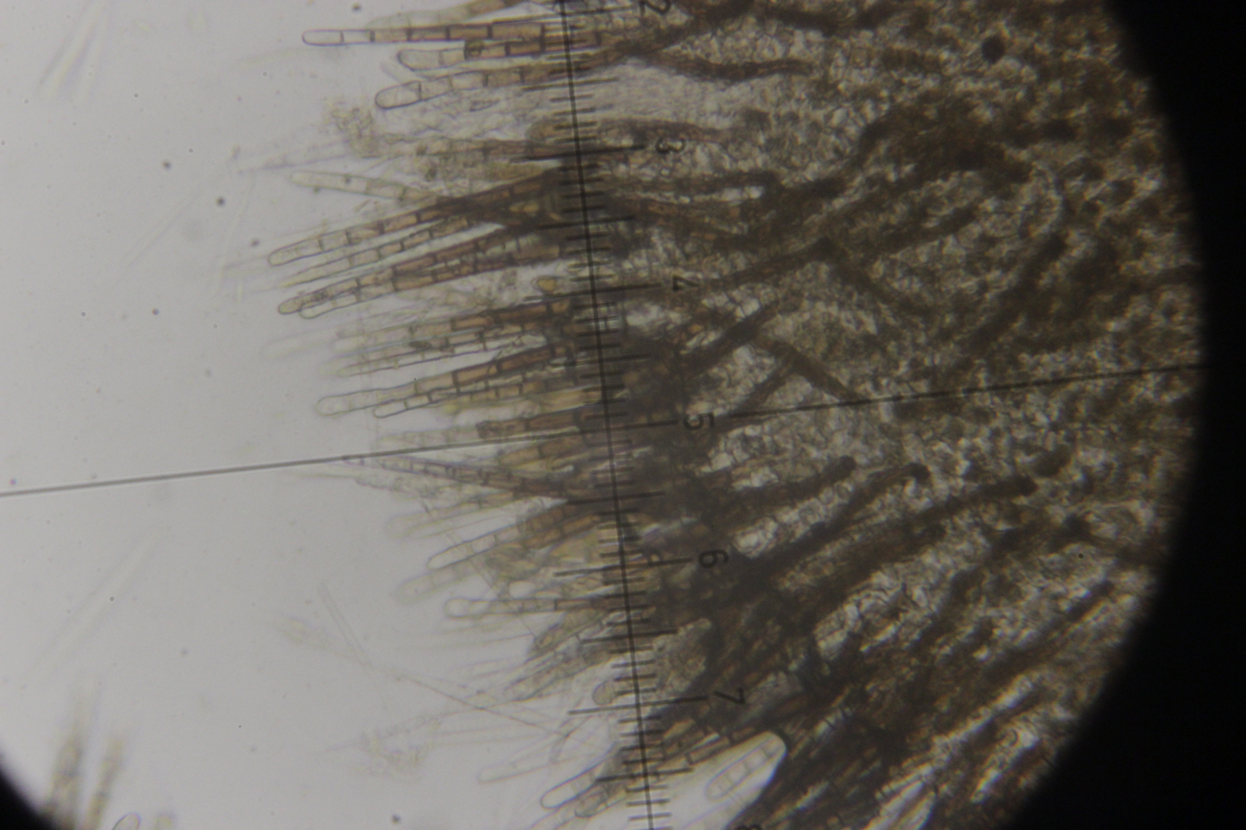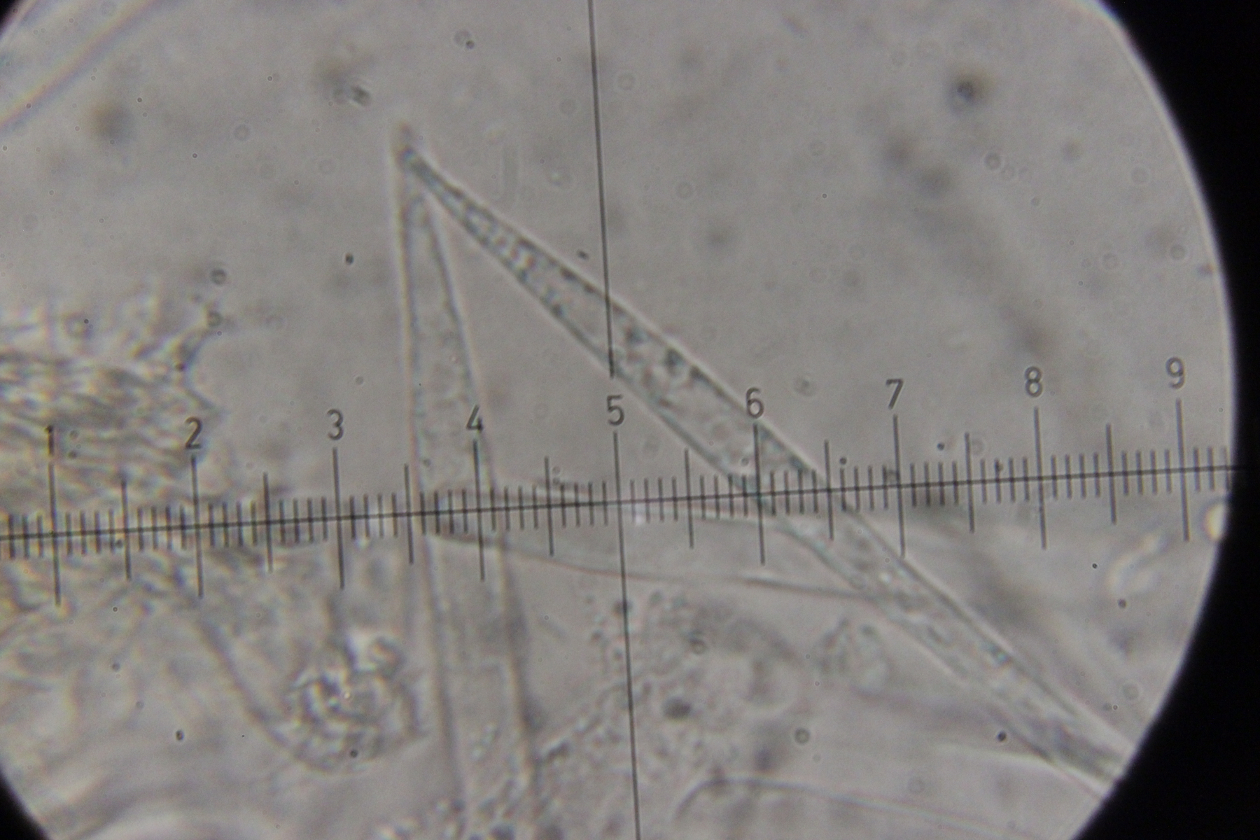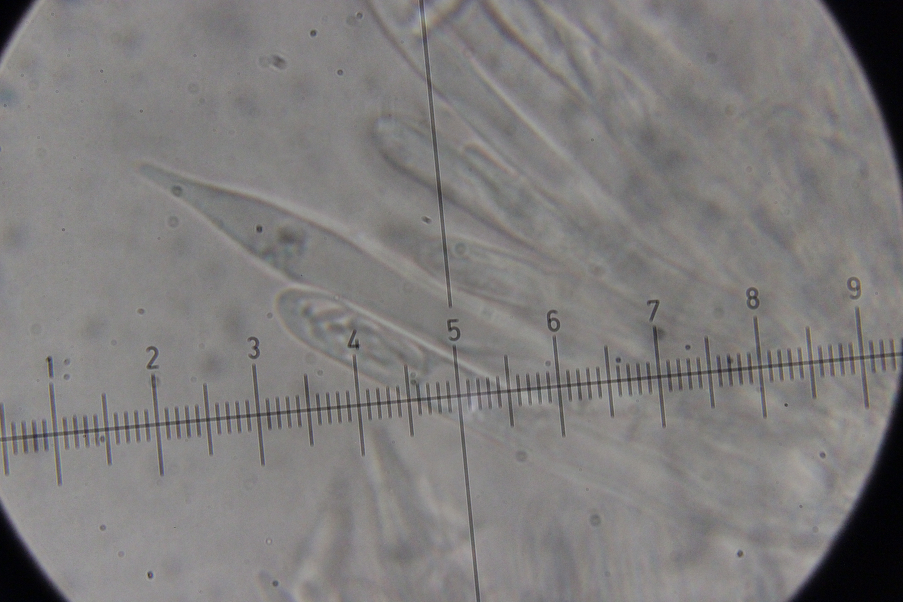 5. Das dürfte Lachnum virgineum auf alten Rubus-Stängeln sein (der Farbton täuscht auf den Bildern, die Fruchtkörper waren rein weiß). Haare waren oben keulig verdickt, teilweise septiert und um die 80 µm lang. Asci hatten Haken und reagierten mit Lugol blau. Die Paraphysen sind spitz, um die 70 µm lang und überragten die Asci meistens ein Stück.