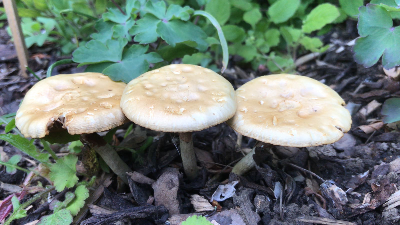 Mir ist gestern in unserem Garten aufgefallen, dass zwischen unserem Rindenmulch, der schon 2 Jahre liegt, viele der auf den Fotos gezeigten Pilze herausragen.