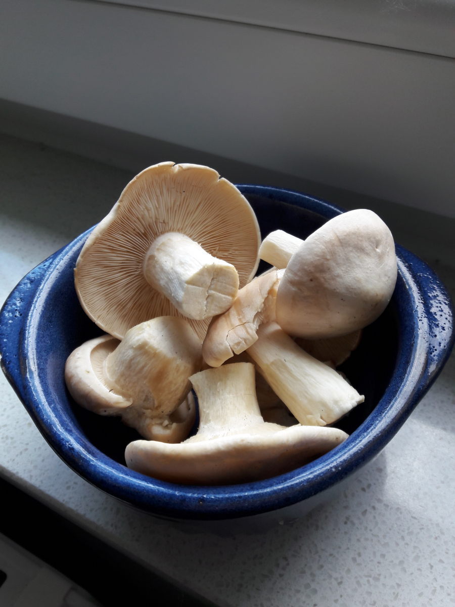 Also Maipilze und eine Zwiebel gedünstet, mit Mehl abgebunden und mit Brühe aufgefüllt. Gewürzt mit Muskat, Salz, Zitronenpfeffer und einer Kräutermischung. Zum Schluss noch den Saft einer halben Zitrone und einen halben Becher Schmand dazu. Dann mit geröstetem Weißbrot gegessen.