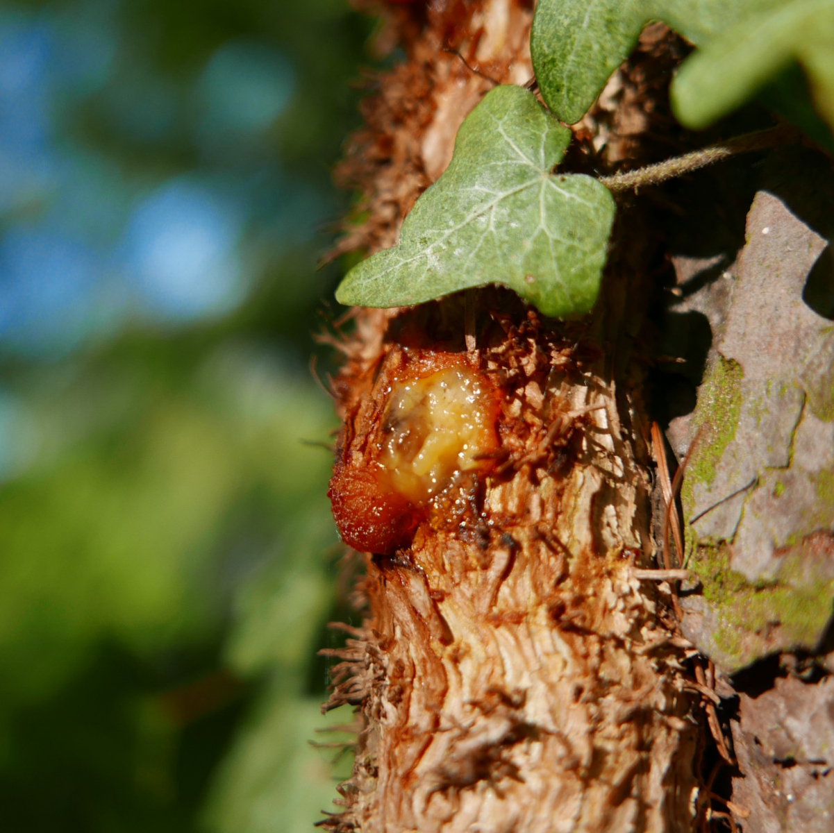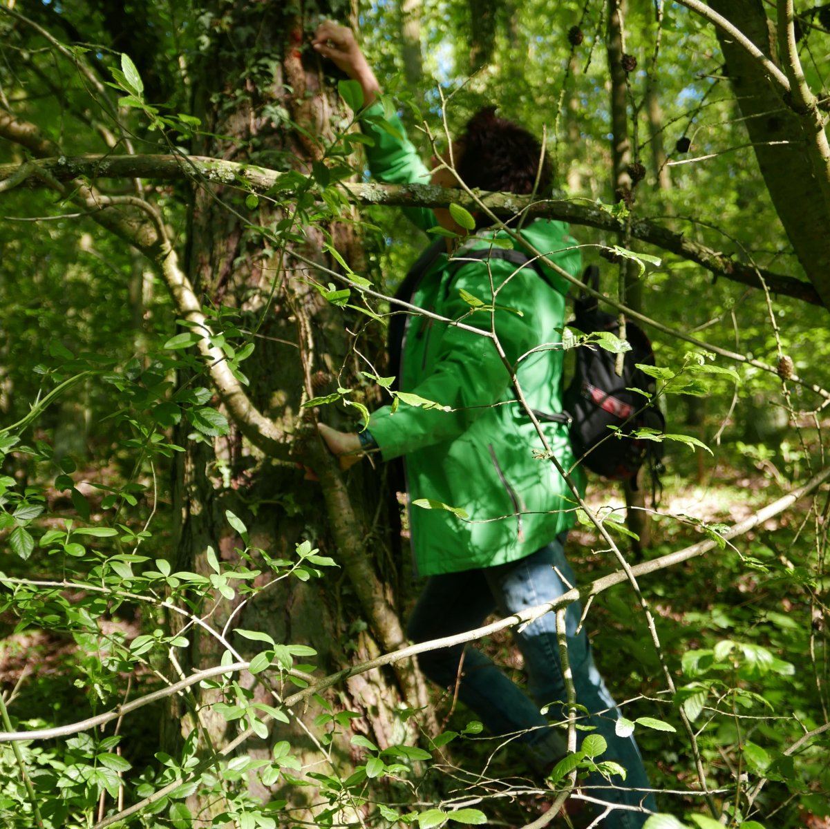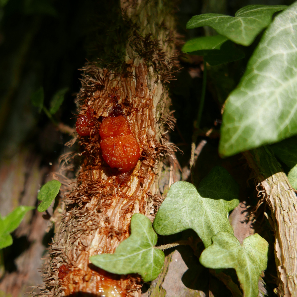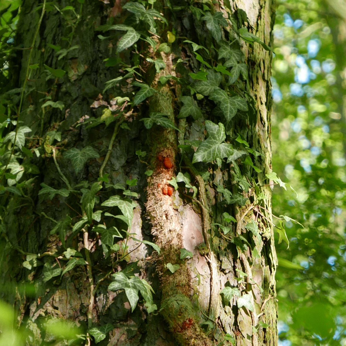 22. An einem Efeu, der an einer Lärche hochwächst, gab es echte Merkwürdigkeiten. Kagi ging gleich nachschauen. Harzi stiefelte auch die Böschung hoch. Und dann musste ich es natürlich auch noch Fotos machen. Der Abhang forderte jedoch seinen Tribut: auch noch kurz vor dem Auto kramte ich mir Laub und Ästchen aus dem Hemd...