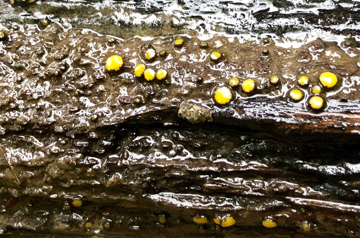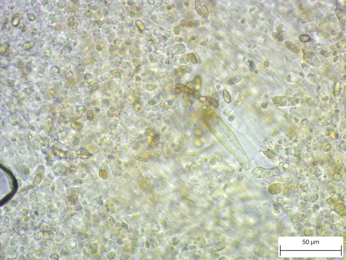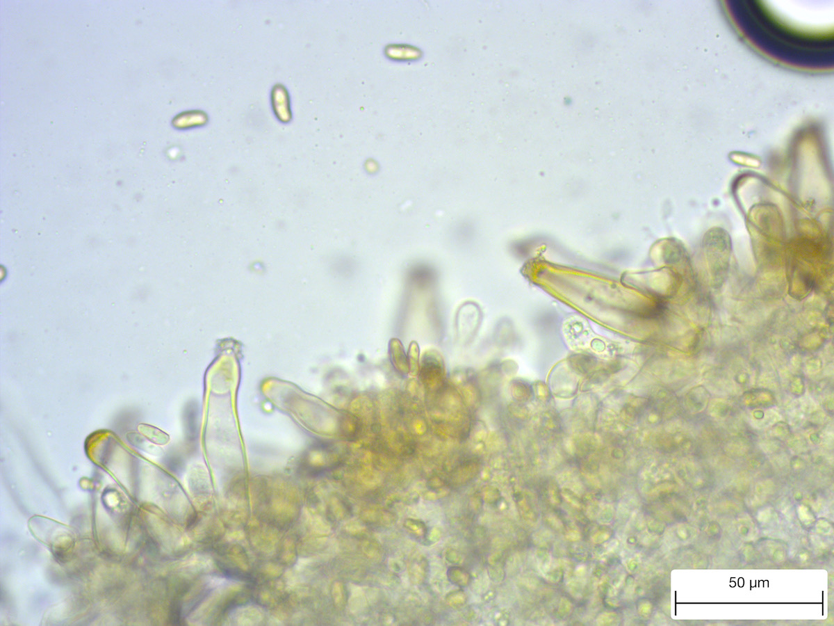 Dieser Stöckchenumdreherpilz wuchs unter Wasser. Das hübsche Becherchen hört auf den Namen Vibrissea flavovirens. Dank der Erklärung der Pilzprofis gelang mir zum ersten Mal ein Handyfoto durch die Stereolupe.