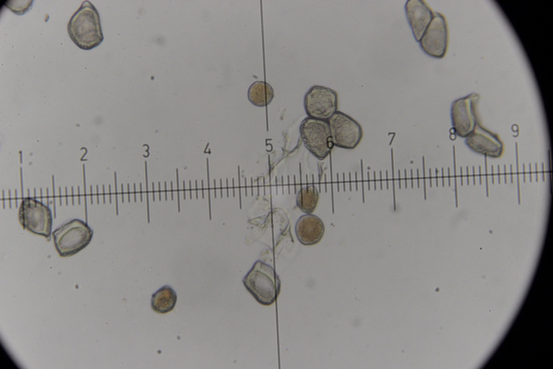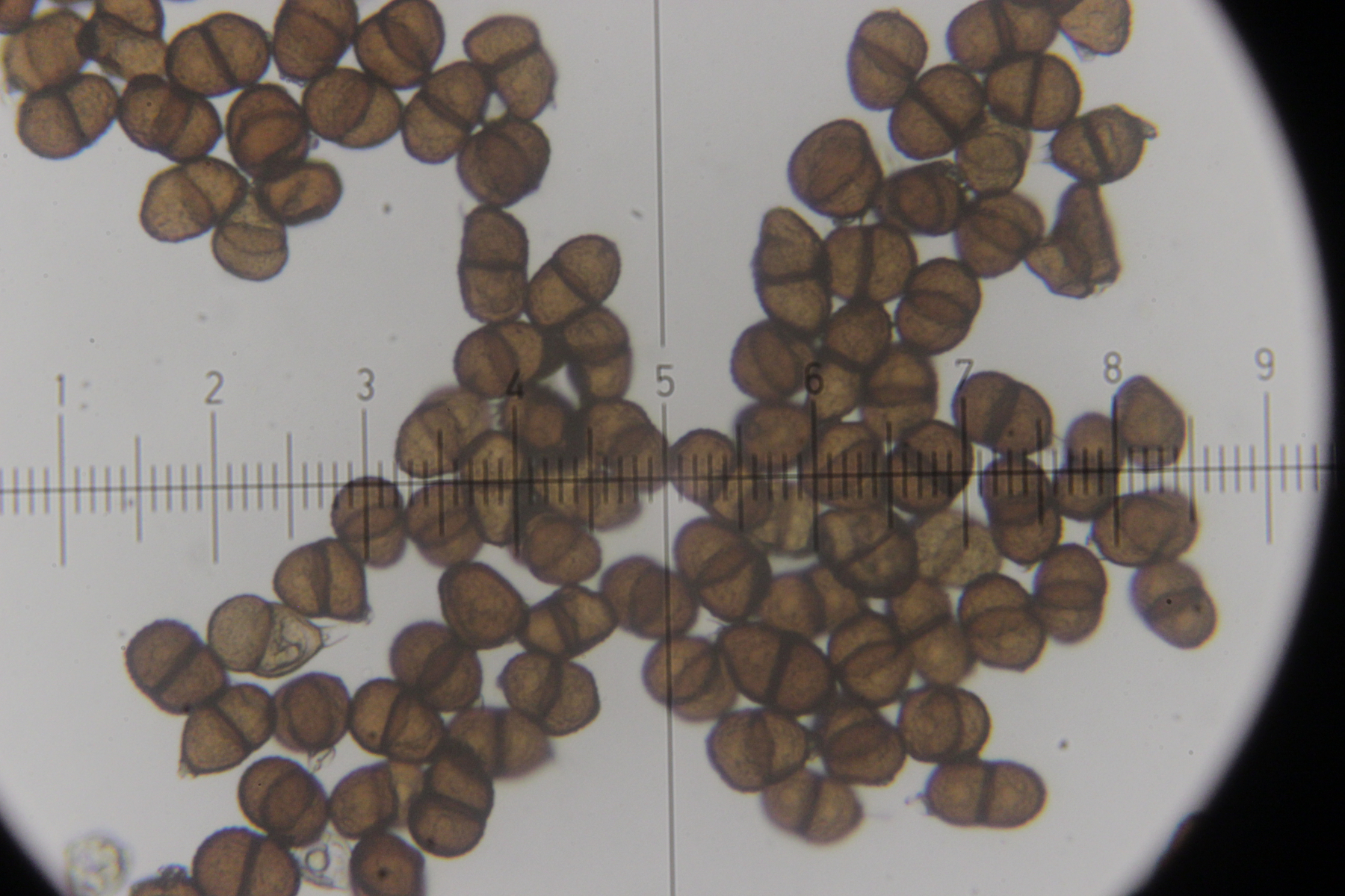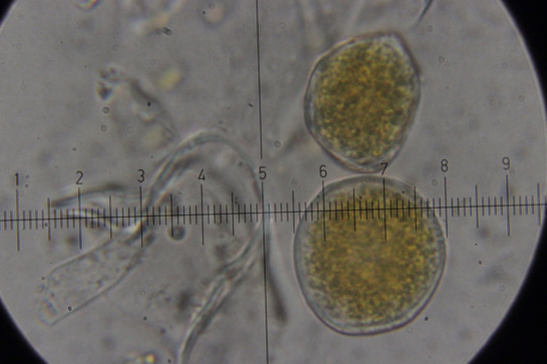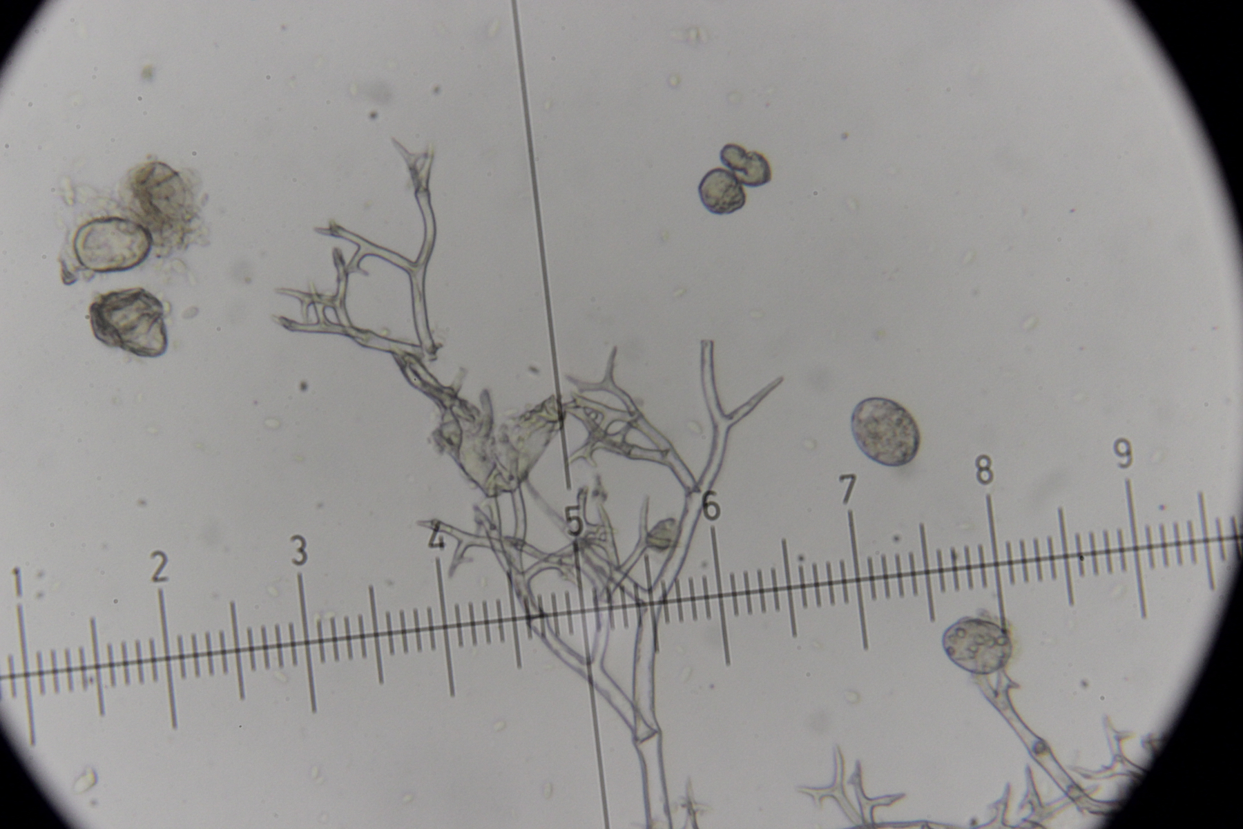 6. Peronospora sp. auf Vicia tetrasperma. Das spec. gibt es hier nicht etwa, weil wir den Pilz nicht hätten bestimmen können. Vielmehr handelt es sich hier um eine noch unbeschriebene Art, die sich von Peronospora ervi auf Vicia hirsuta molekulargenetisch unterscheidet..