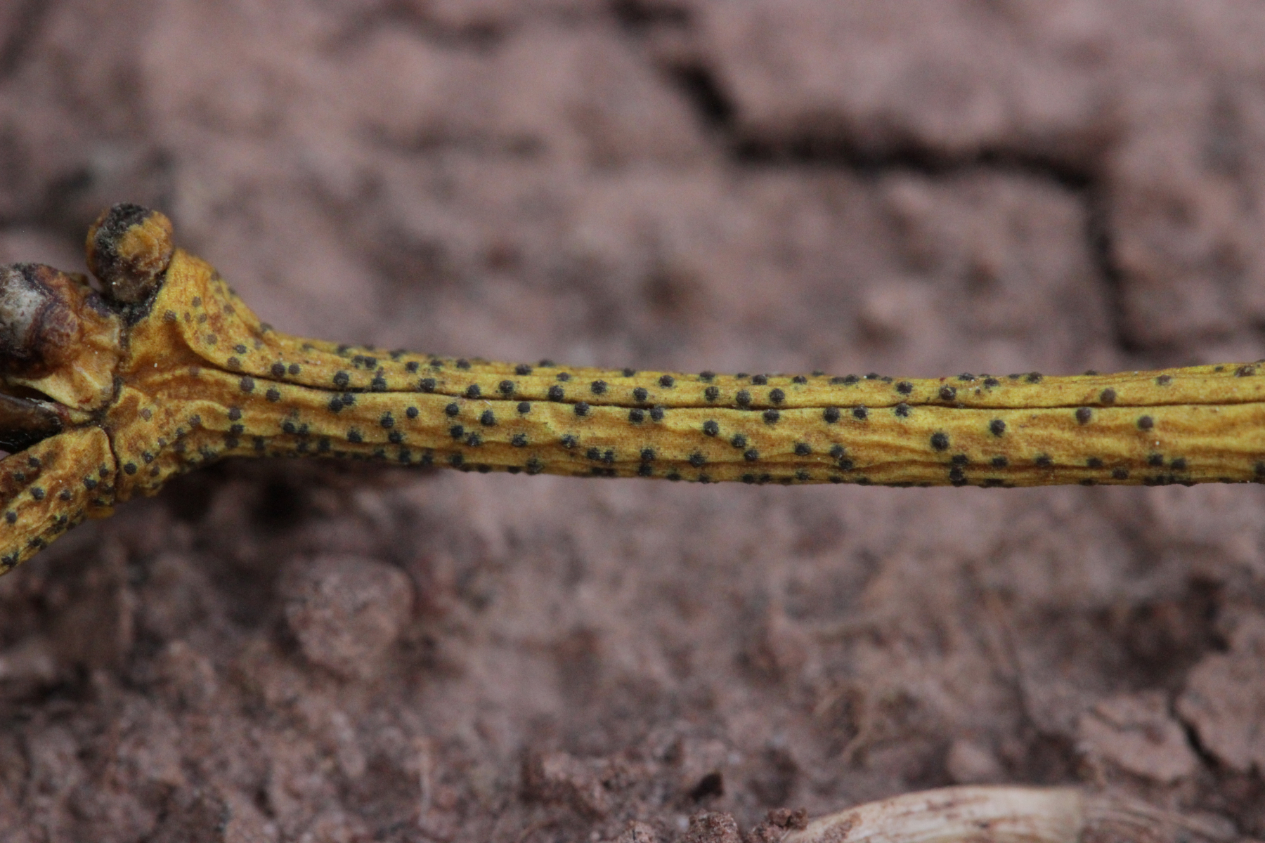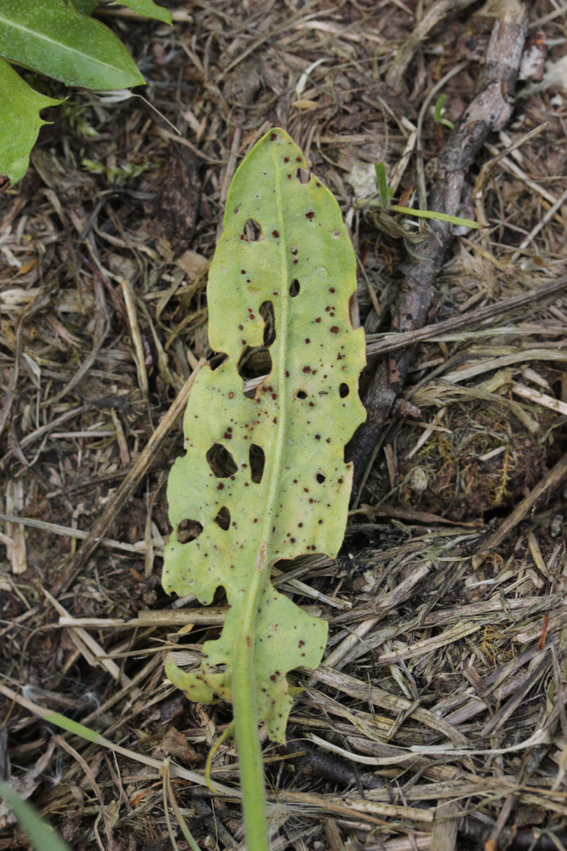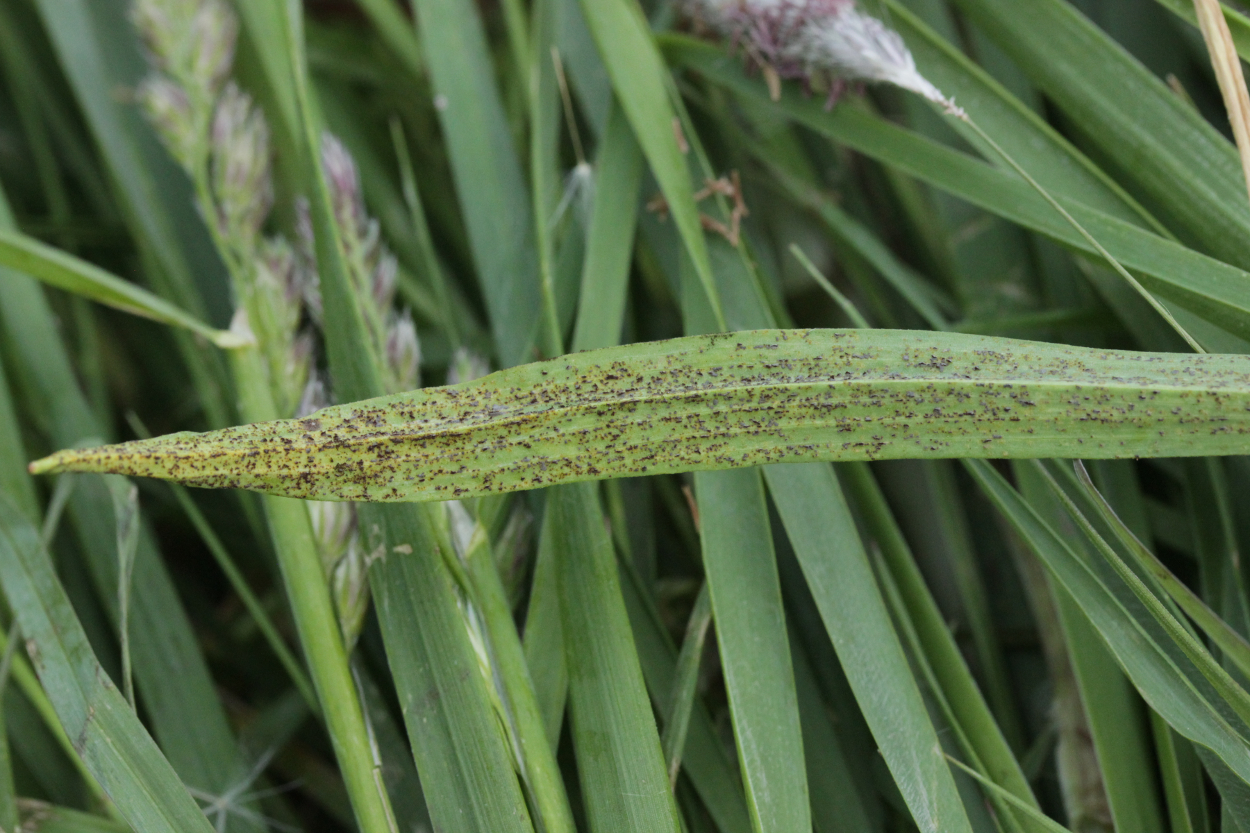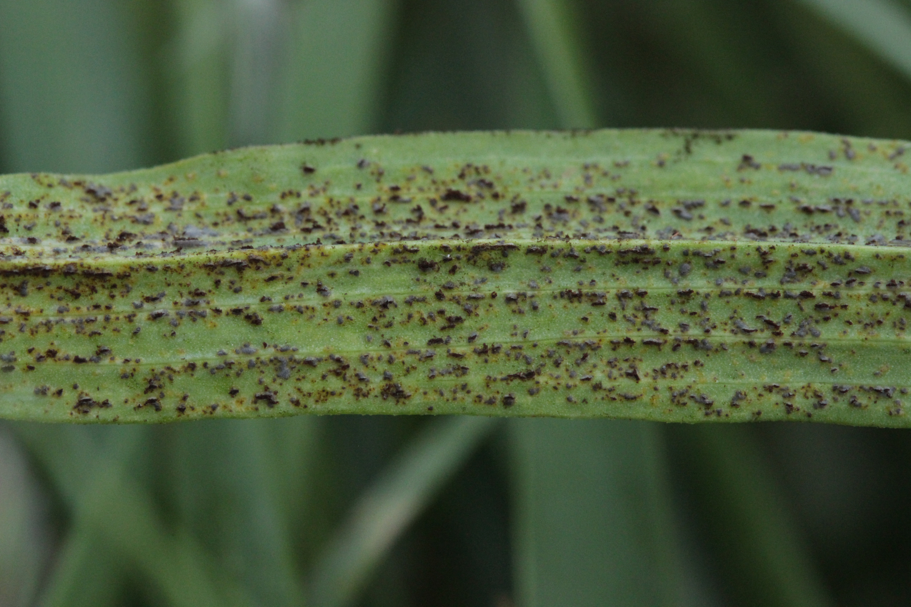 14. Puccinia cf. hysterium ex Tragopogon pratensis. Neben den hier gezeigten Telien gab es auch Aecien auf dem Blatt.