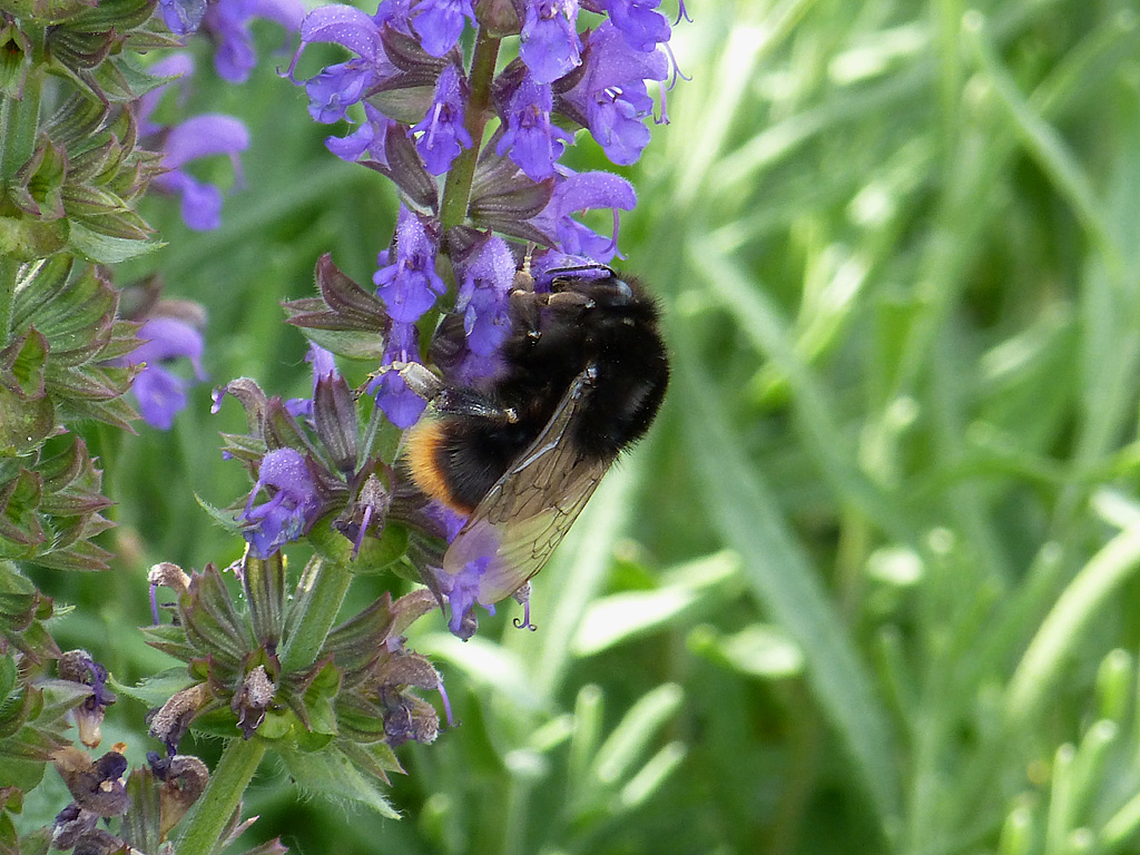 Aber es ist ein lustiges Kerlchen: versucht echt alles zu vertreiben, was in der Nähe der Salbeiblüten auftaucht. Die großen Hummeln lassen sich allerdings nicht von der lütten Kampf - Biene beeindrucken :grofl: