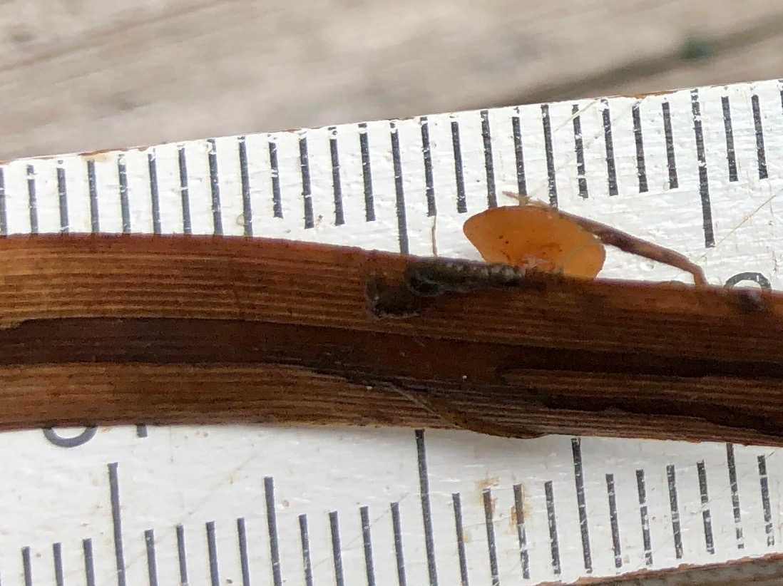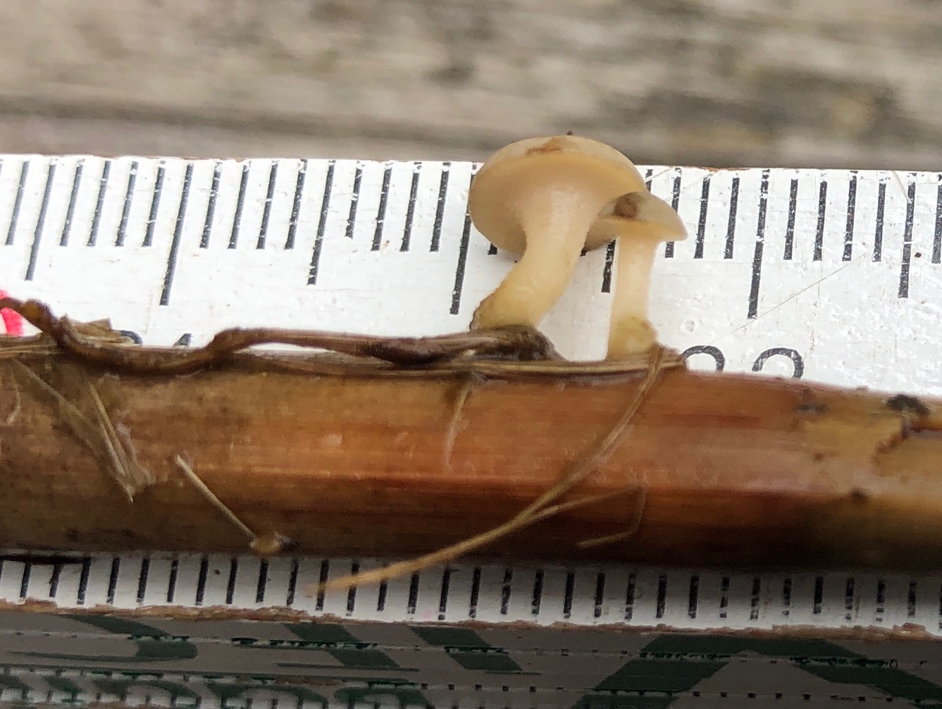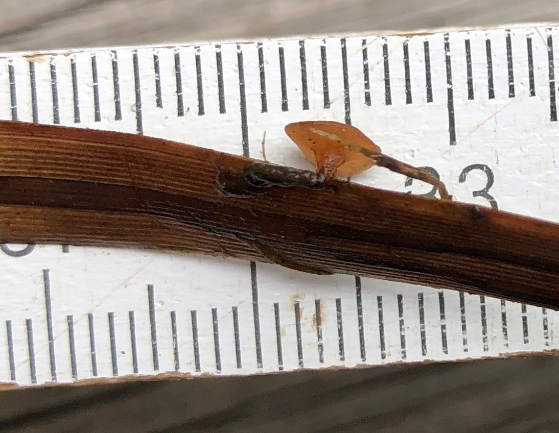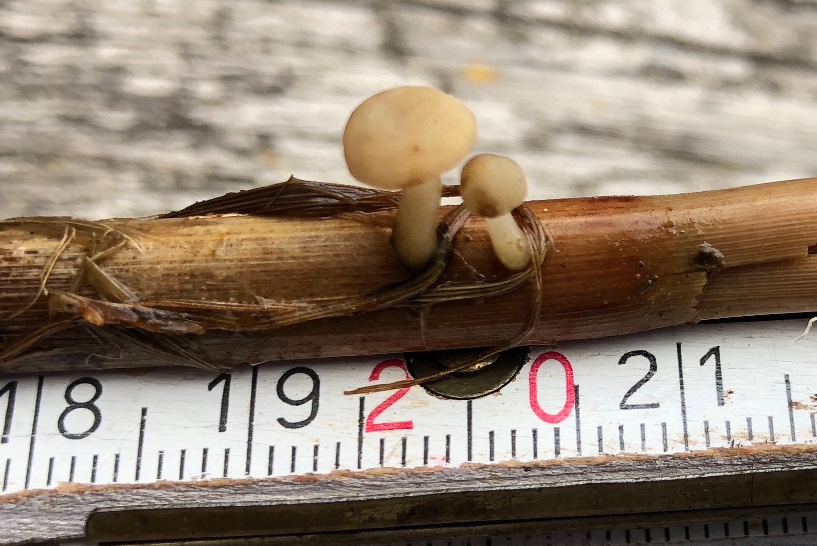 Dann gab es noch einen Pilz mit einem Stiel 5 mm Durchmesser wiederum am Seggenstengel. Offenbar war der Pilz noch nicht reif.