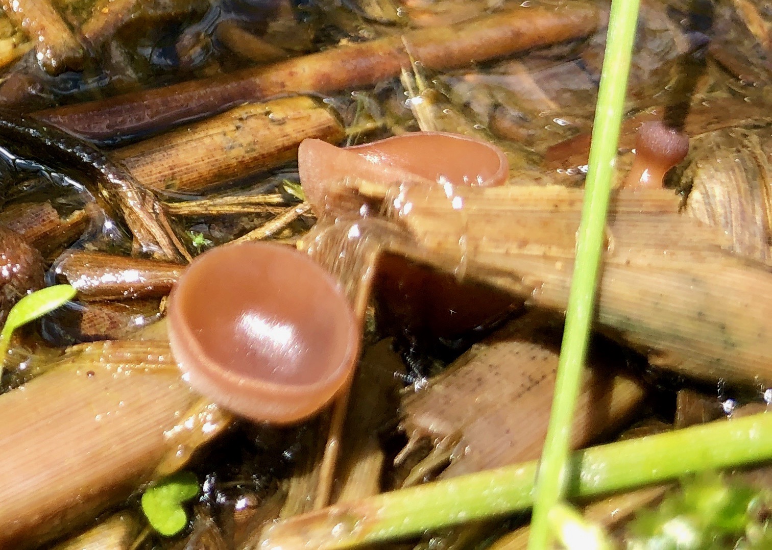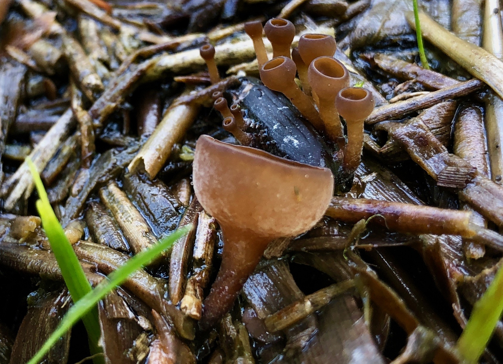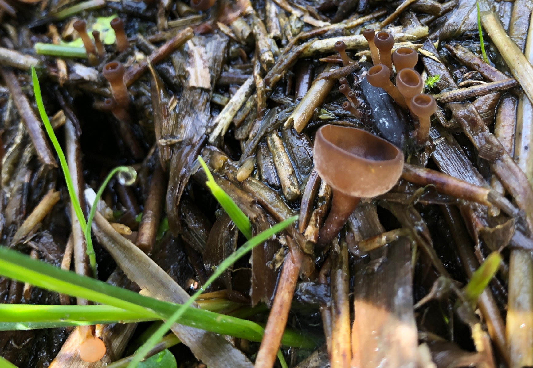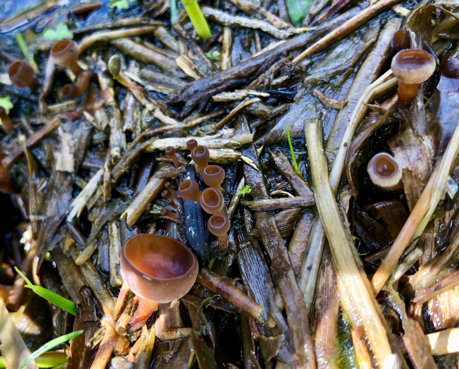 Der erste erinnert makroskopisch an einen Anemonenbecherling. Die großen Becher sind knapp 2 cm im Durchmesser. Es gab sehr viele Pilze dieser Art und alle wuchsen auf vorjährigen Seggenhalmen im Bach. Einen passenden Namen habe ich nicht gefunden. Vielleicht habt Ihr eine Idee.