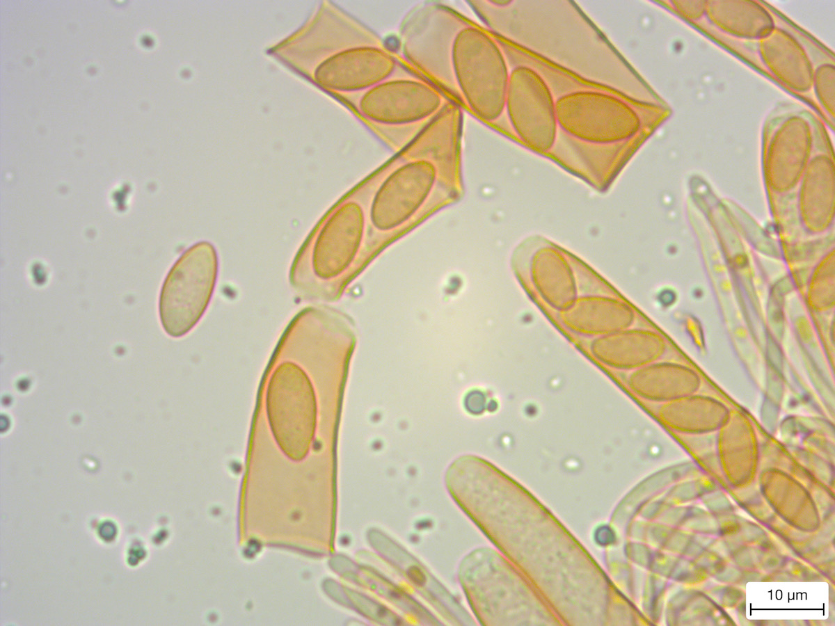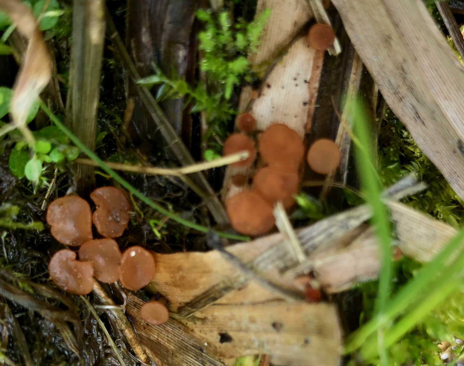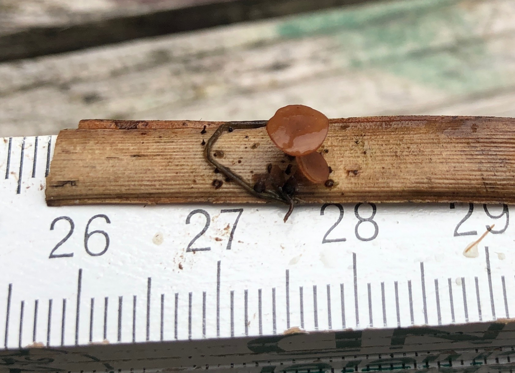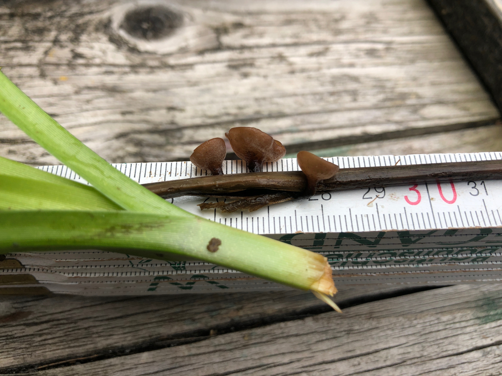 Der erste erinnert makroskopisch an einen Anemonenbecherling. Die großen Becher sind knapp 2 cm im Durchmesser. Es gab sehr viele Pilze dieser Art und alle wuchsen auf vorjährigen Seggenhalmen im Bach. Einen passenden Namen habe ich nicht gefunden. Vielleicht habt Ihr eine Idee.