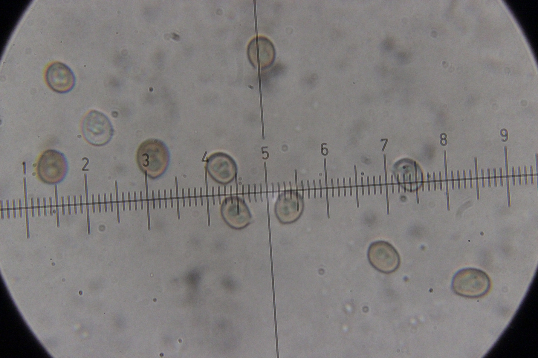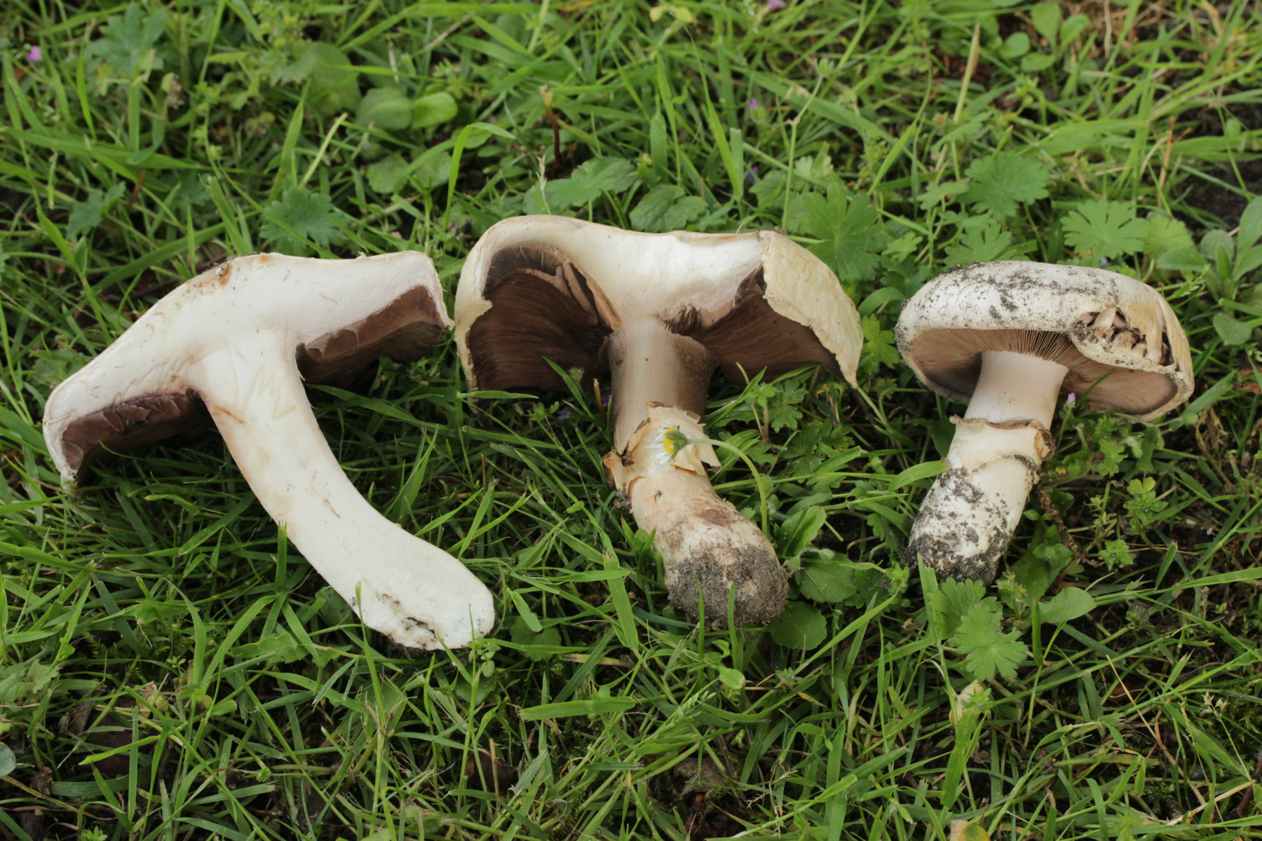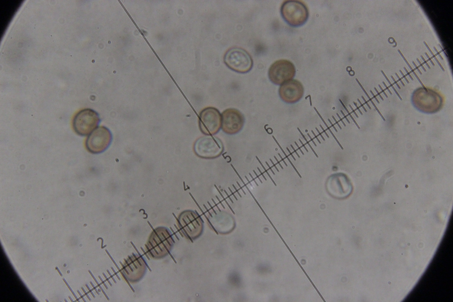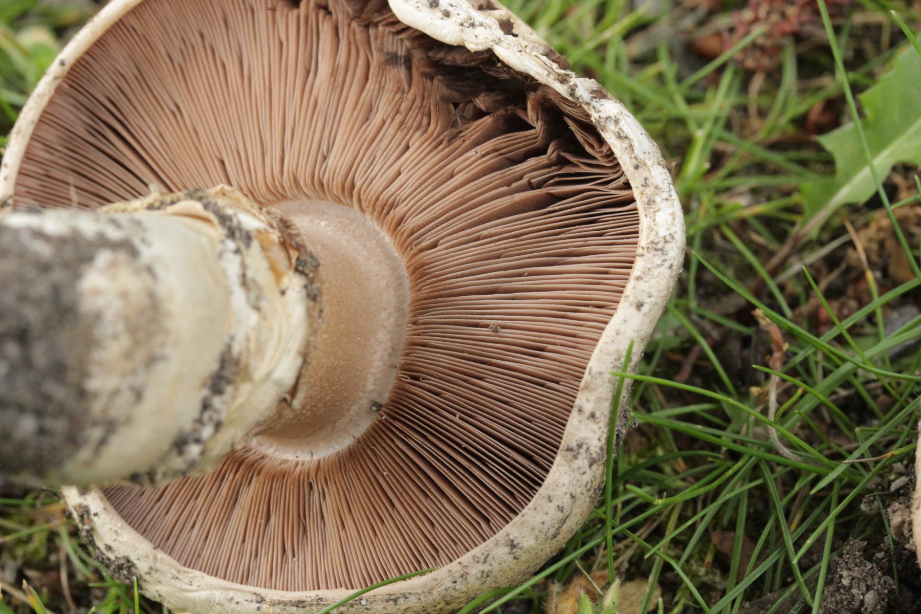 1. Zunächst mal ein Agaricus sp. mit Sporengröße (5.65 +- 0.4) µm x (4.5 +- 0.2) µm, pilzigem Geruch, doppeltem Ring und einer nur sehr langsamen und geringen Verfärbung des Fleisches in Bräunliche beim Durchschneiden. Insgesamt ein sehr fester Pilz. Karl hat in der Zwischenzeit auf FB A. bitorquis als heißen Kandidaten genannt.
