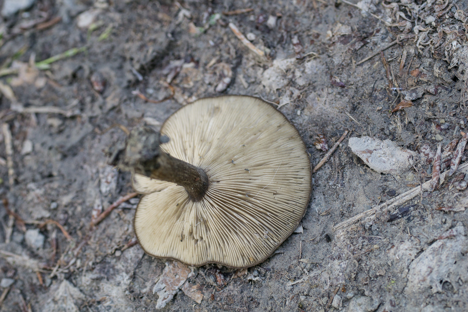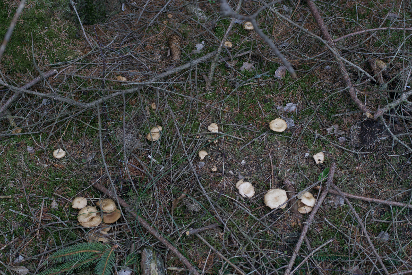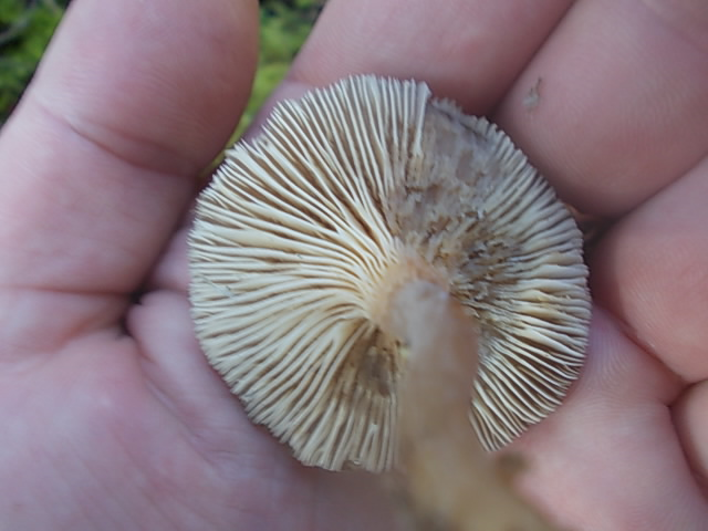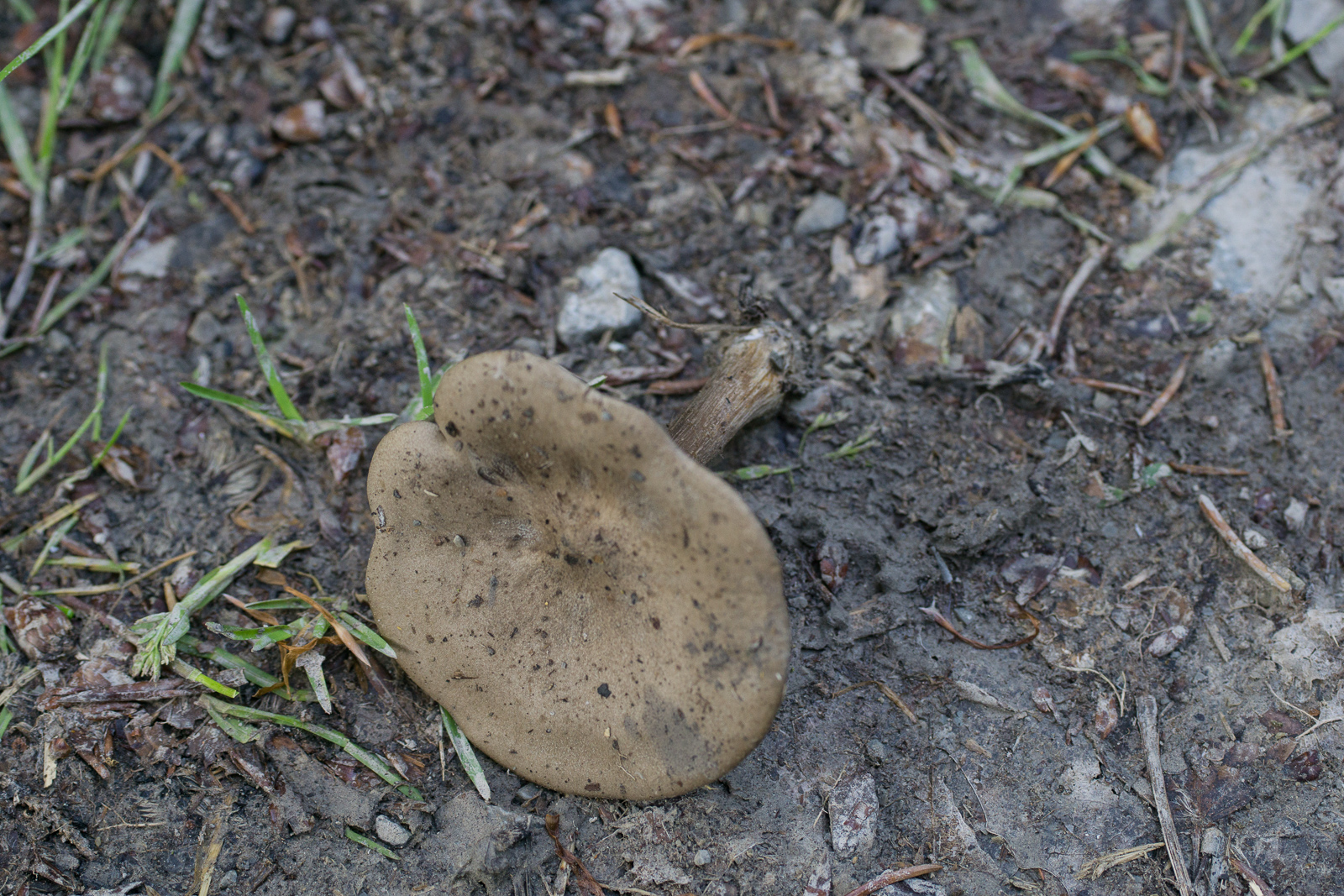 Als einziges passt für mich der Kaffeebraune Gabeltrichterling, aber der sollte herablaufende Lamellen haben und das sieht mir eher normal angewachsen aus, oder? Jemand eine bessere Idee?