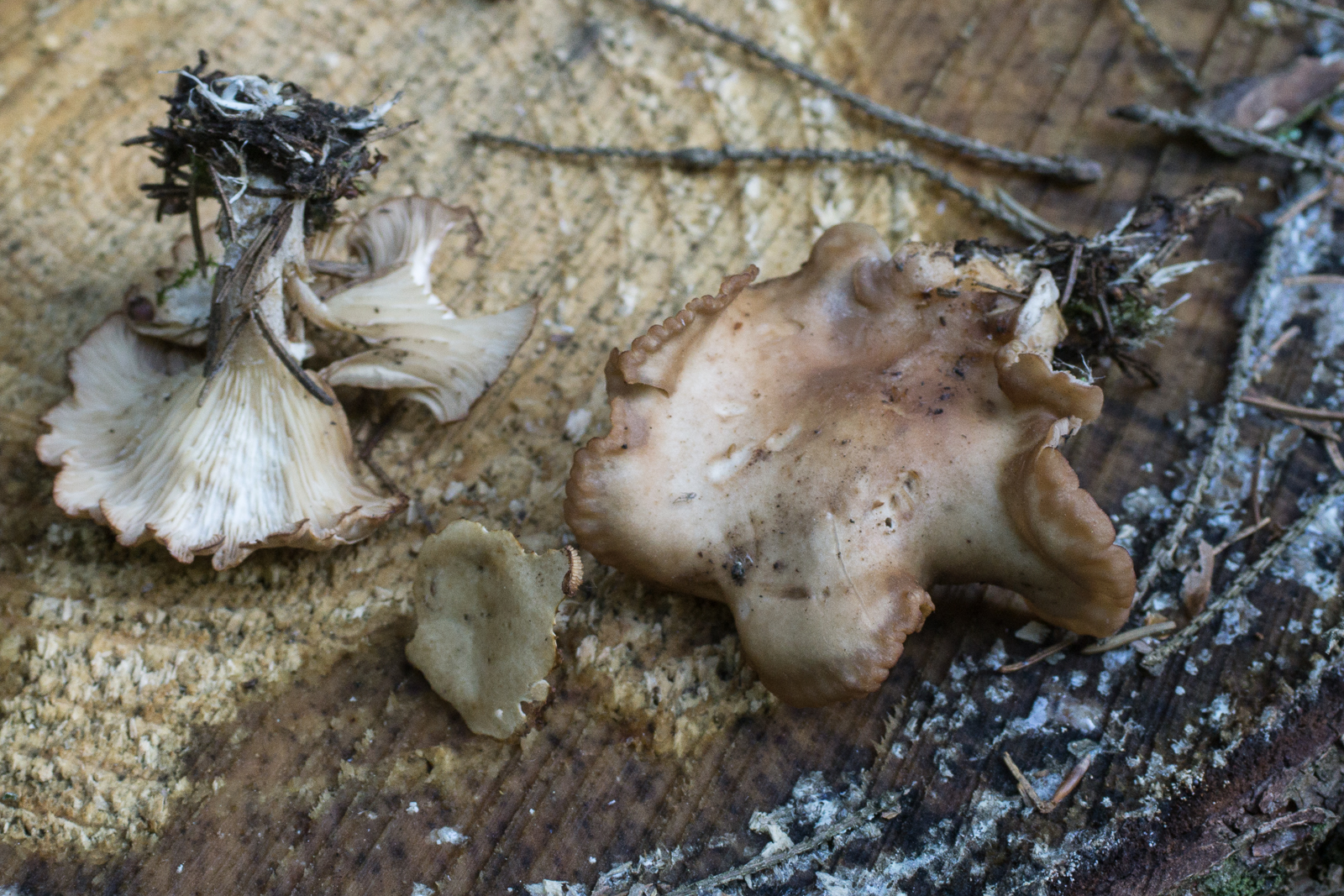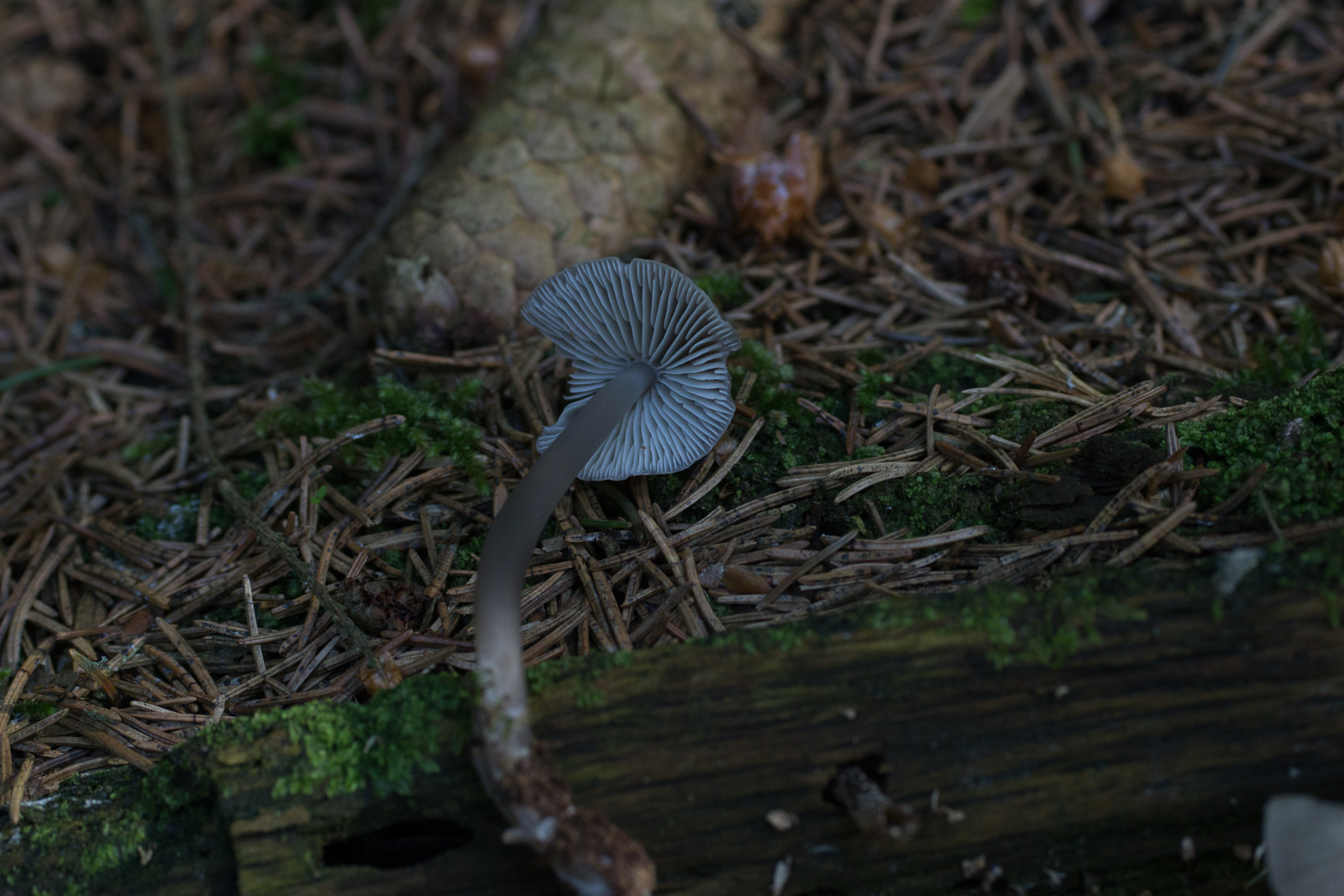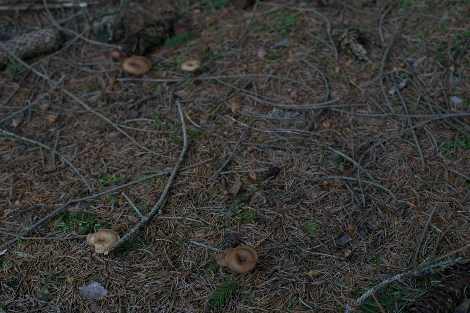 Als einziges passt für mich der Kaffeebraune Gabeltrichterling, aber der sollte herablaufende Lamellen haben und das sieht mir eher normal angewachsen aus, oder? Jemand eine bessere Idee?