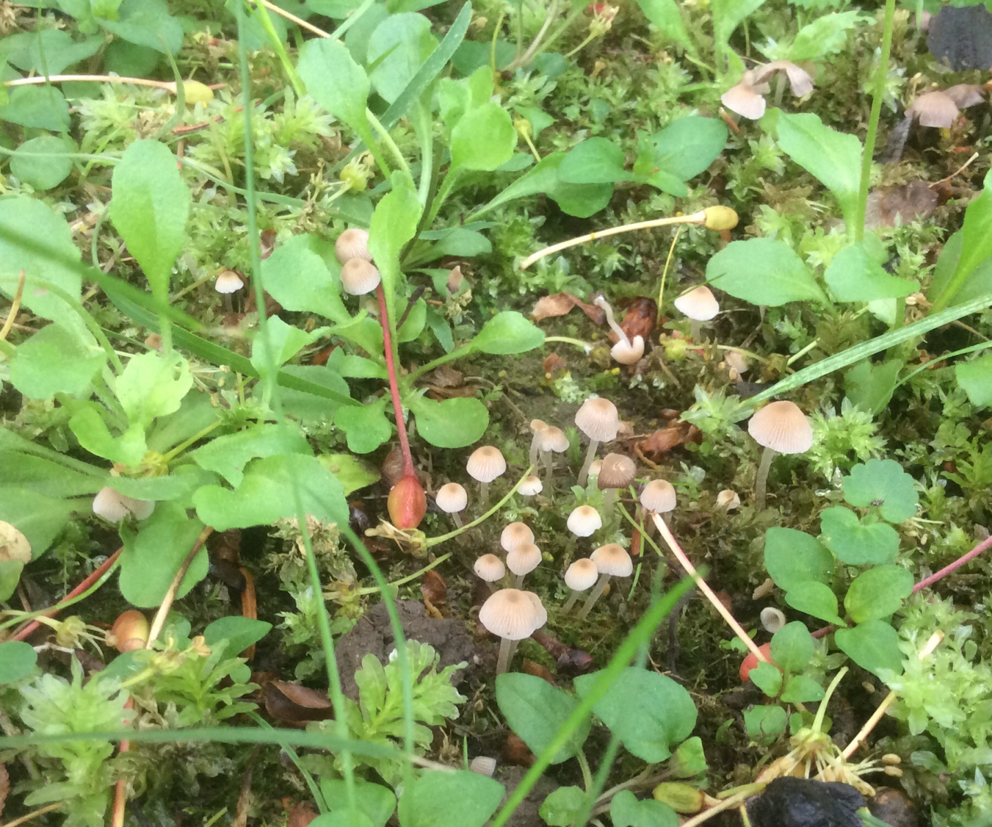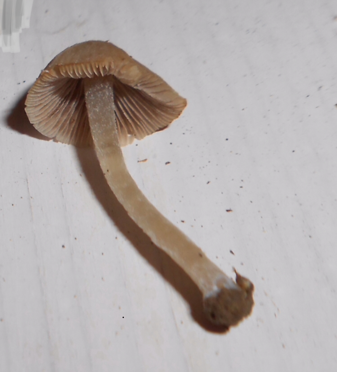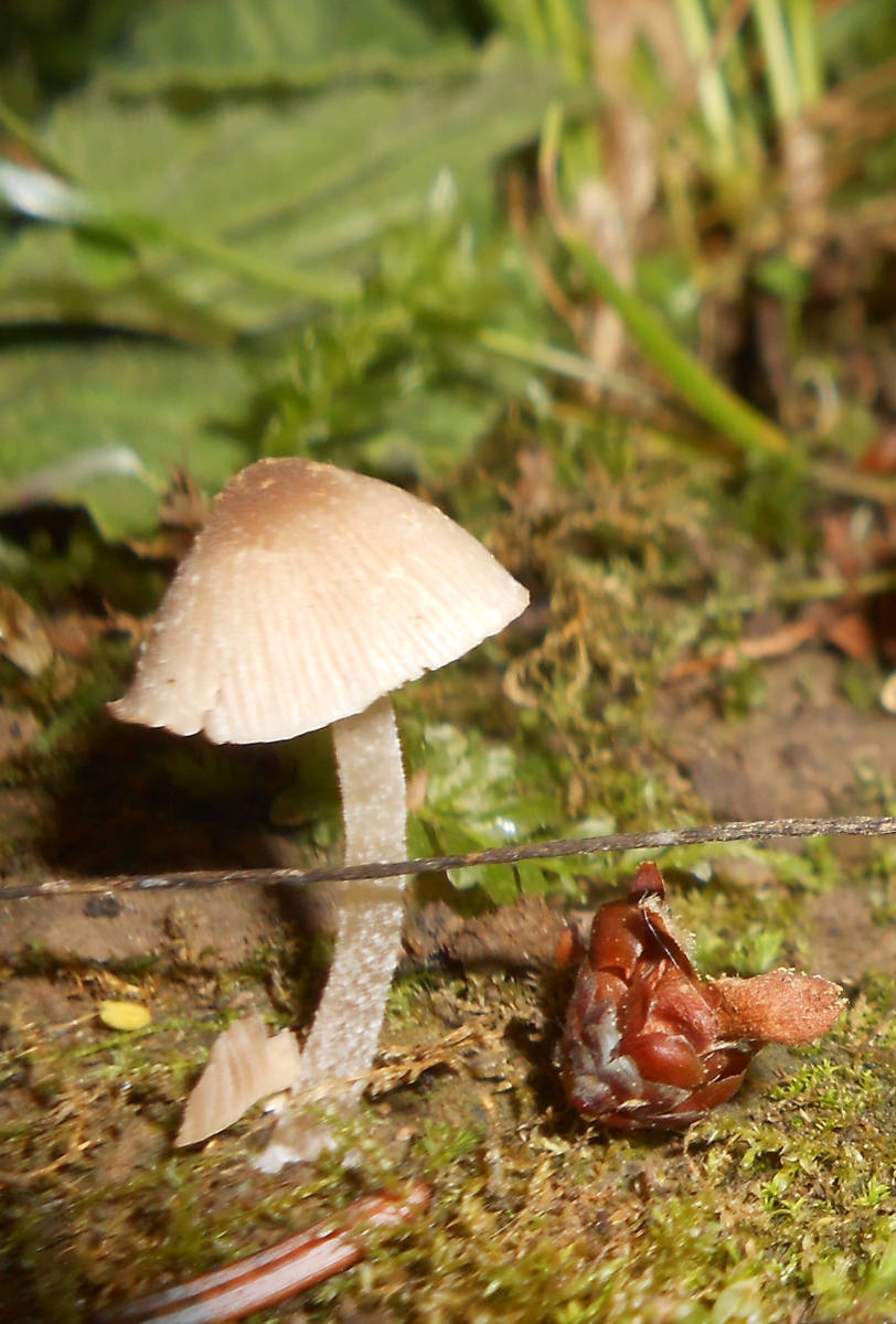 Die Fk standen in kleinen Grüppchen zahlreich auf der Wiese, waren 0,5-2cm hoch, die Hütchen ca. 1-2cm Durchmesser, Form walzenförmig bis glockig. Stiele dünn (dm ca. 1-1,5mm), teilweise etwas durchscheinend, leicht weißlich schuppig. Auch die Hütchen sind teilweise etwas beschuppt. Das Ganze hellbraun-beige-gelblich (die Fotos sind teilweise geblitzt, da es etwas dunkel war und ich sonst keine Details hätte fotografieren können), Hutmitte dunkler braun, Zwischenzone gelblich-beige, zum Rand weißlich, Hut radialstreifig. Lamellen etwa so hell wie der Hutrand.