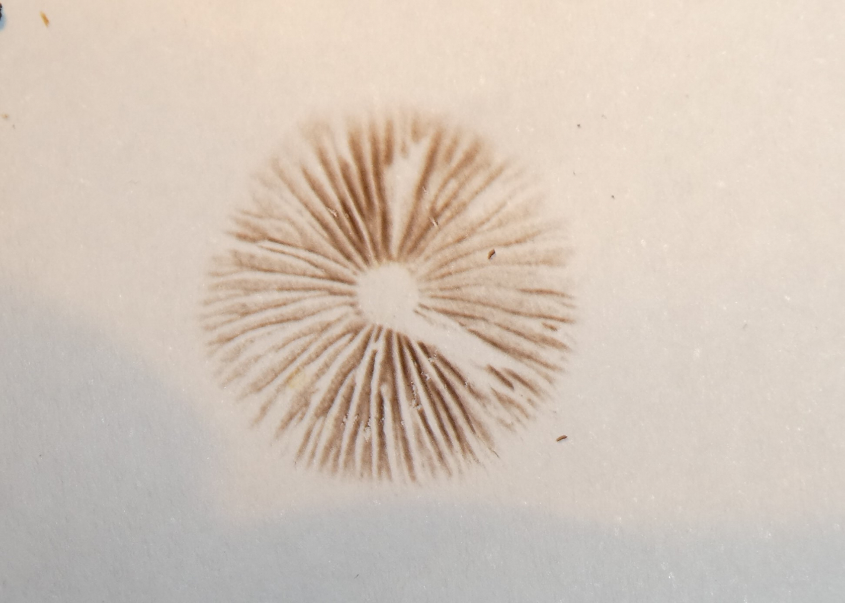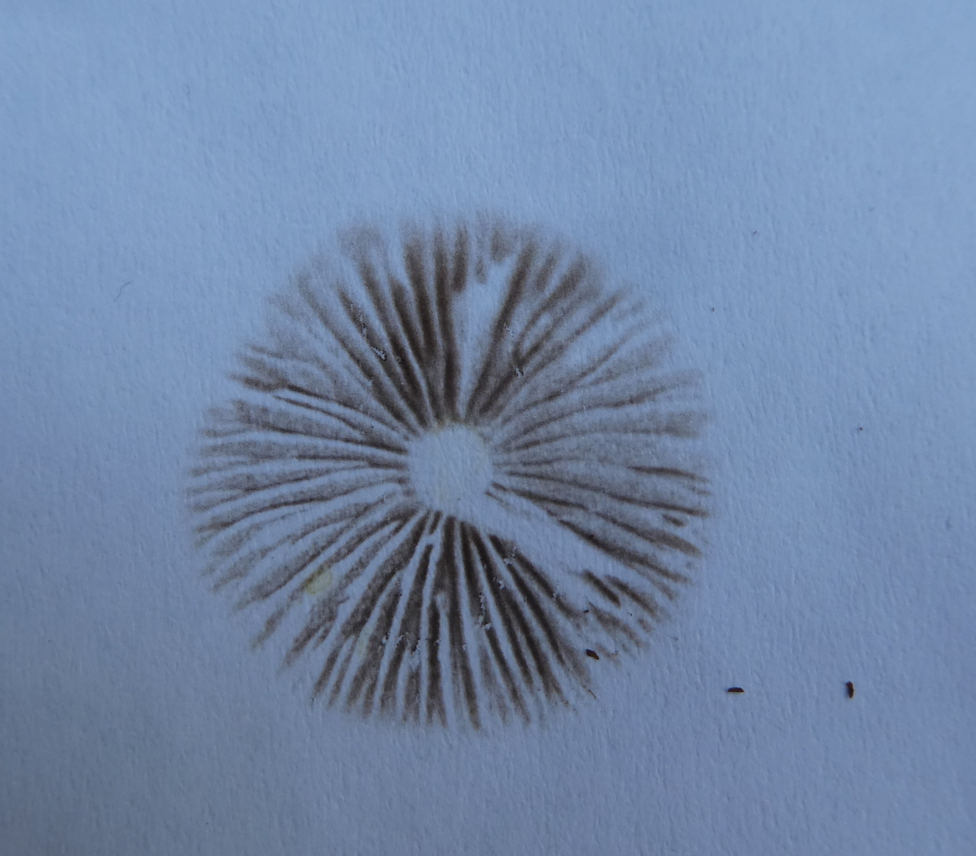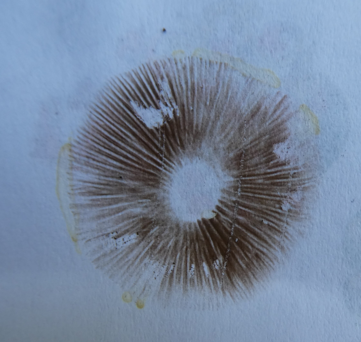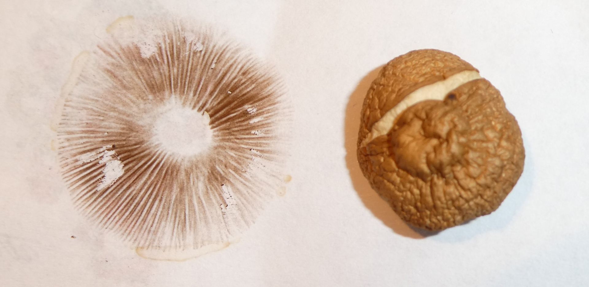 Diesen Pilz habe ich mitgenommen - die Hutoberseite ist heute gelb-orangefarben und die Lamellen sind braun.