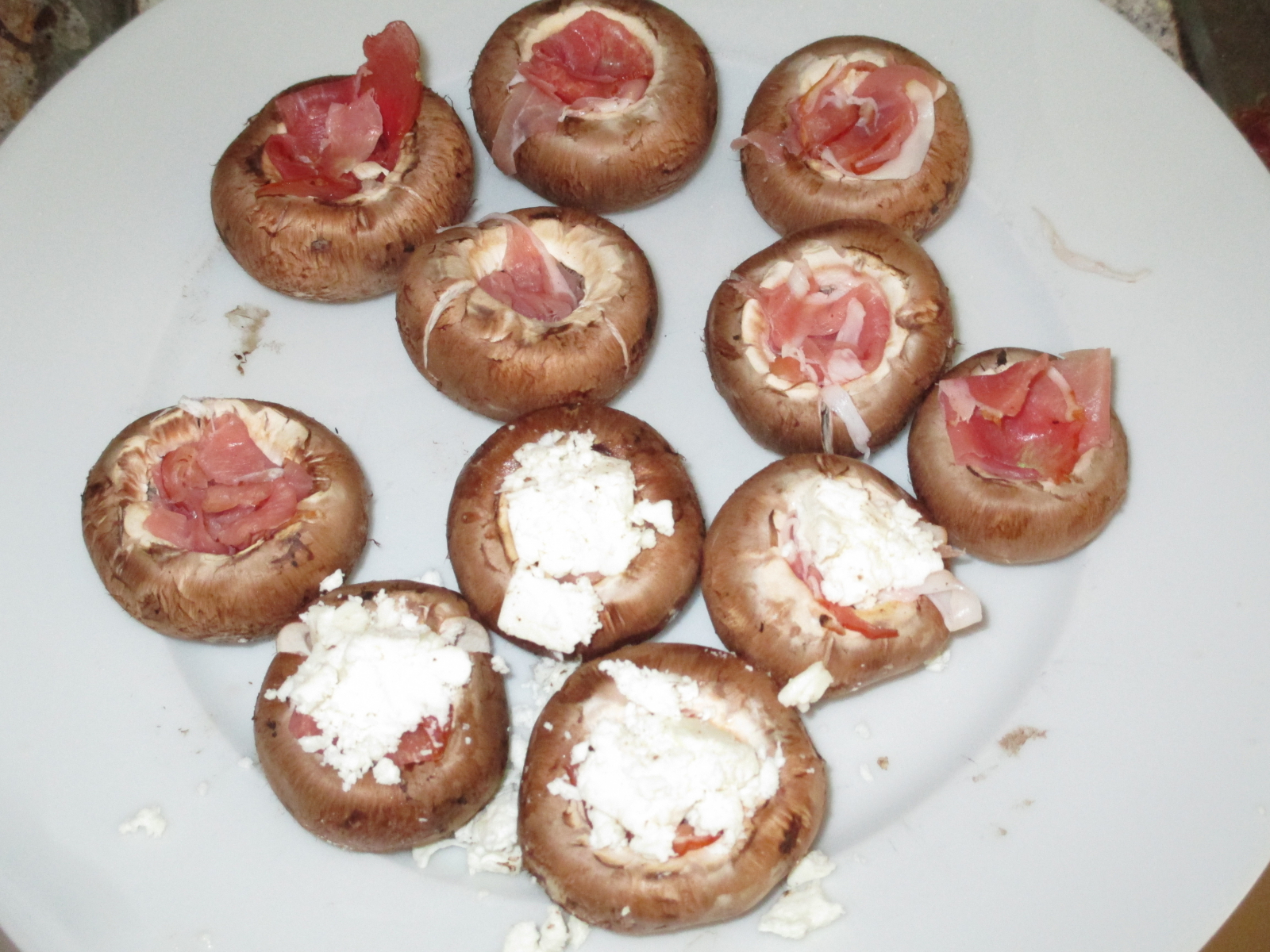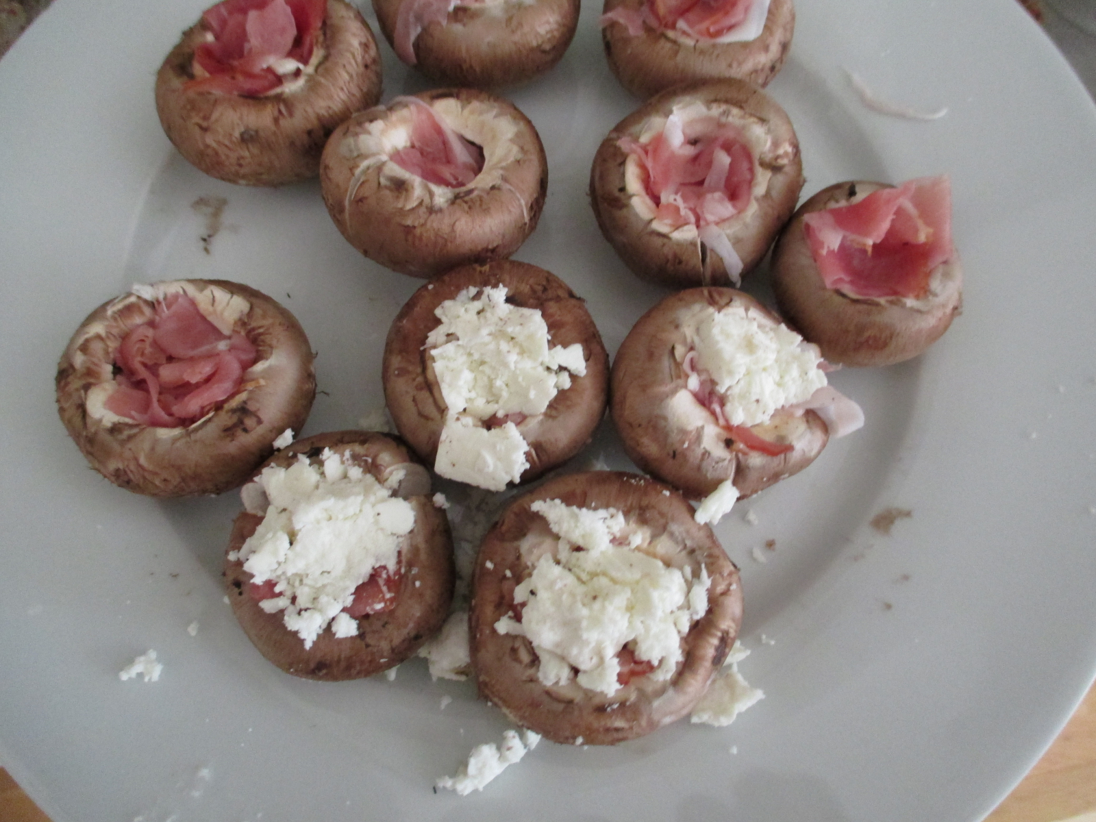 Anschließend gab ich etwas Schwarzwälder Schinken und danach Feta in die Pilzhüte.