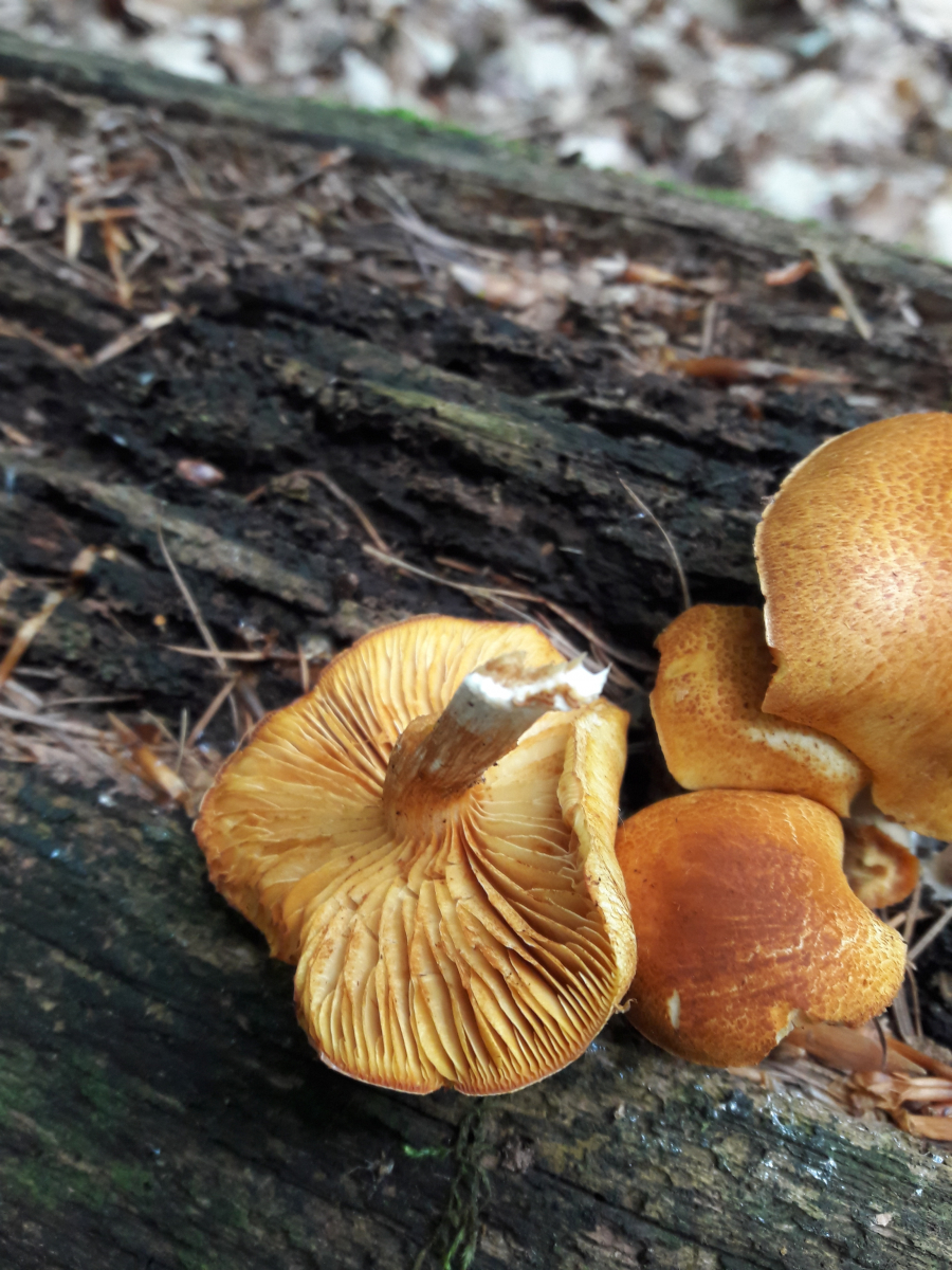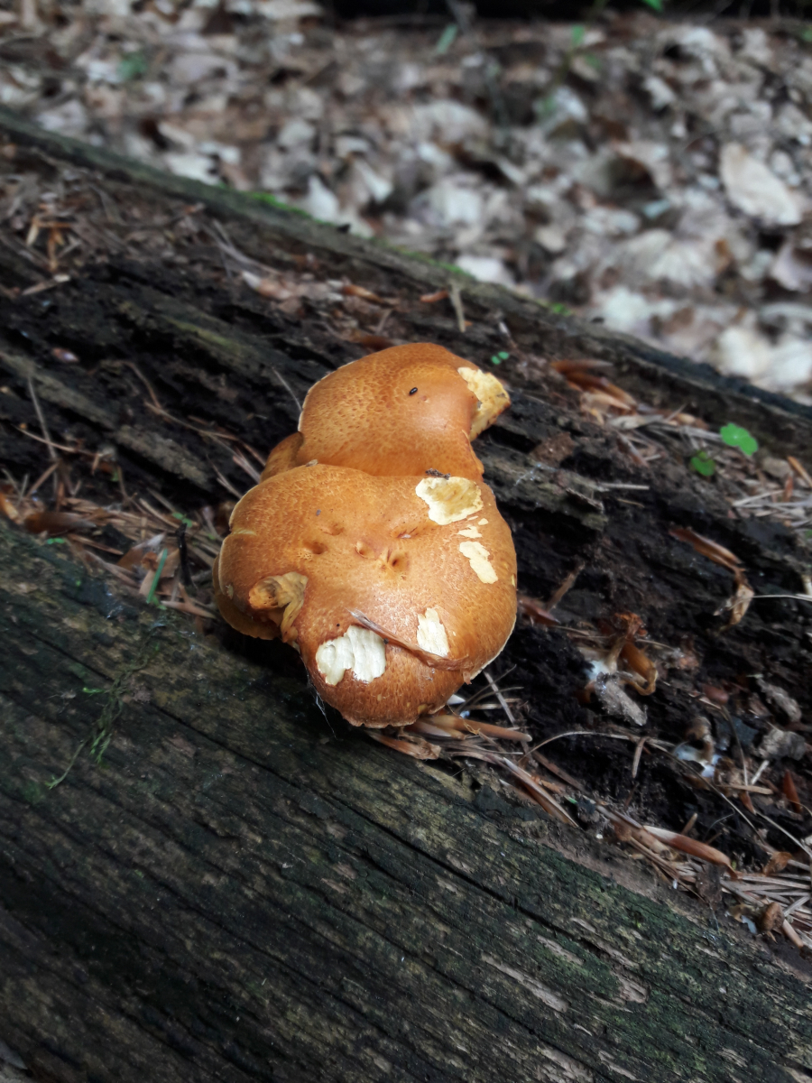 ich habe heute diese Pilze an einem Nadelholzstumpf gefunden. Ich dachte gleich an einen Flämmling. Bei der näheren Recherche stimmten die Merkmale am besten mit dem Gefleckten Flämmling (Gymnopilus penetrans) überein. Lediglich das sehr weiße Fleisch an der Schneckenfrasstelle ist eher ungewöhnlich. Es sollte eigentlich eher oranggelb bis braunocker sein ![]()