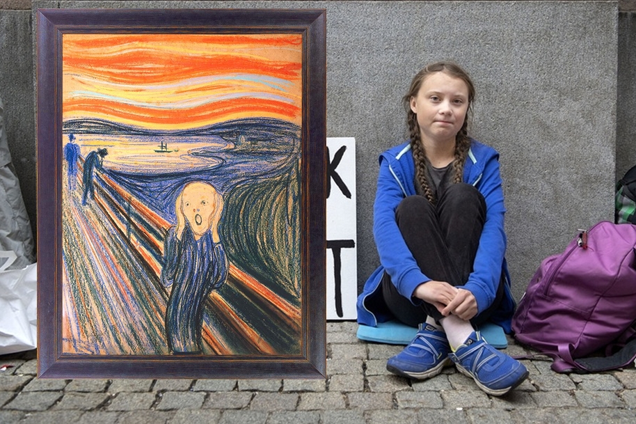 Da passt eigentlich das Bild von der kleinen Greta ganz gut herein. Hier mit dem bekannten Gemälde ihres skandinavischen Landsmanns Munch, der einmal auf einem Spaziergang einen fürchterlichen Schrei hörte, was Existenzangst in ihm auslöste und ihn dieses Bild, vor einigen Jahren das teuerste jemals ersteigerte, malen ließ.