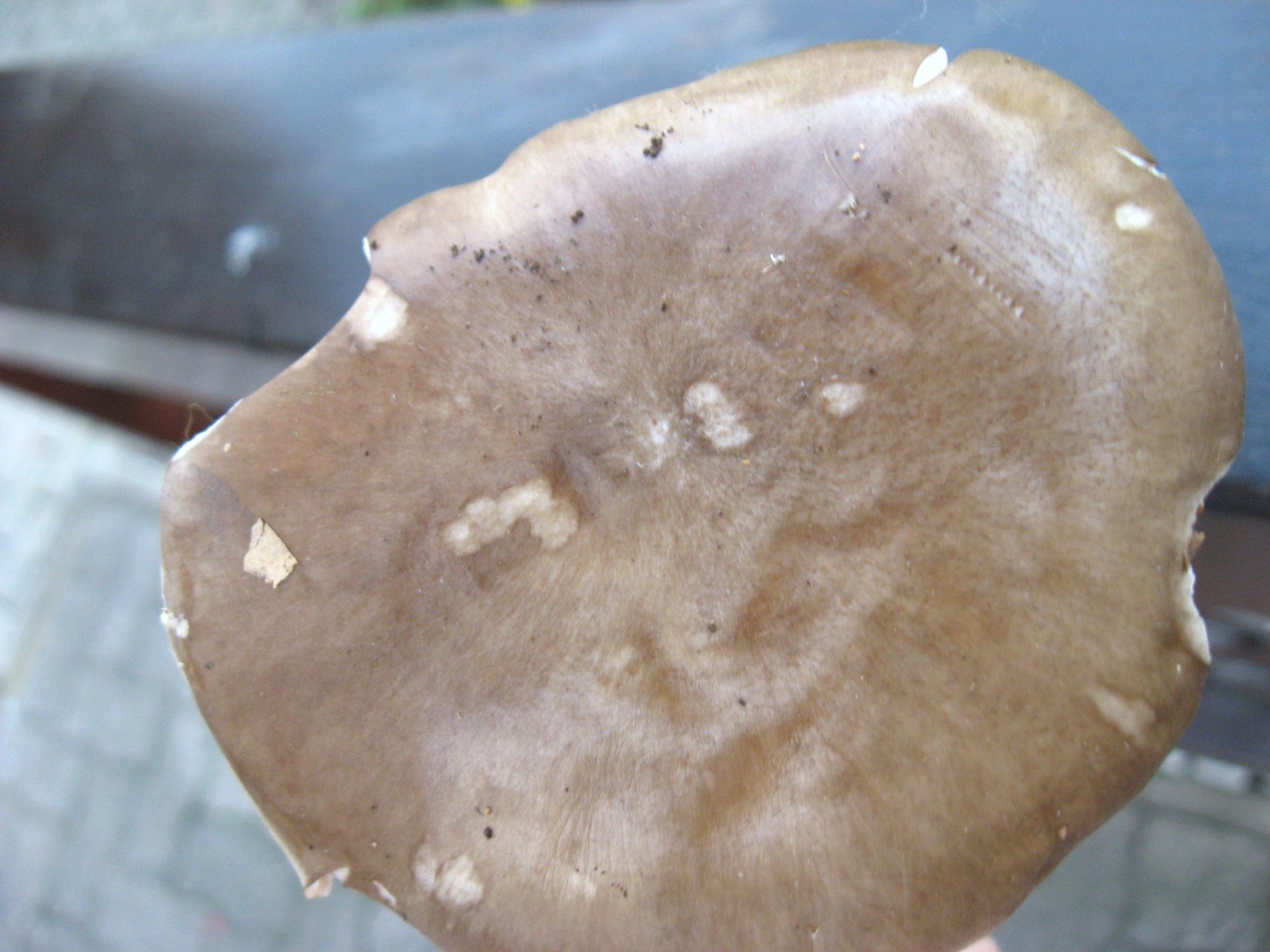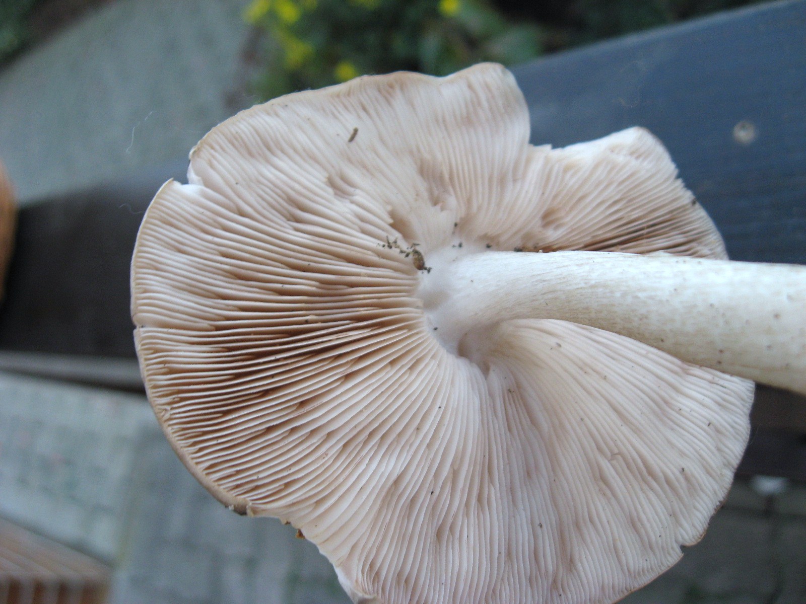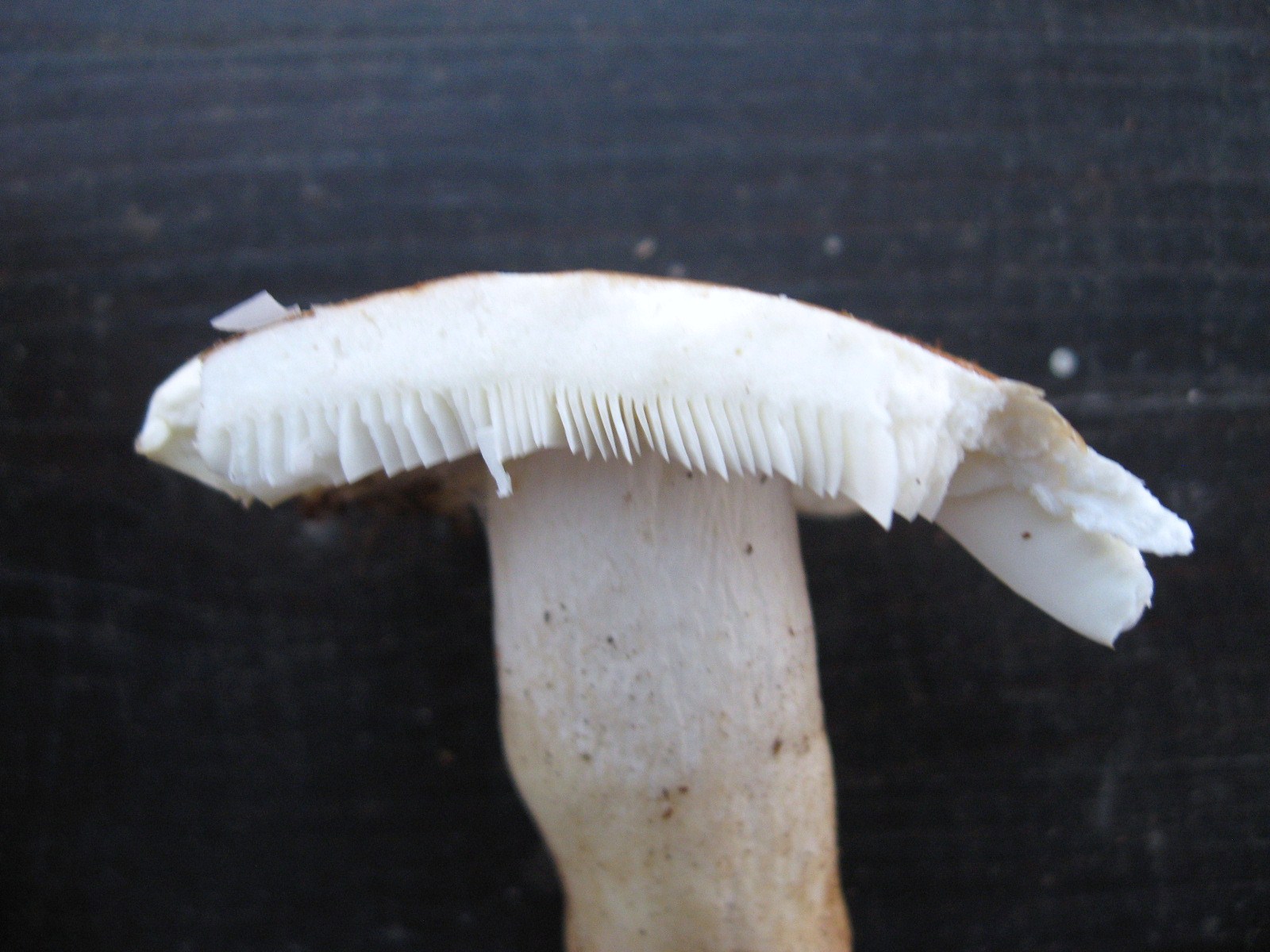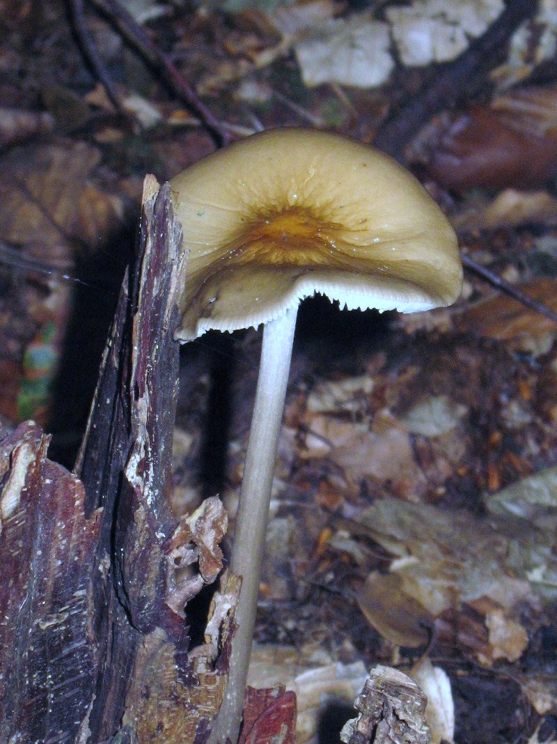 Fundort: Buchenwald; Hutgröße: ca. 4-5 cm; Hutfarbe: hellbraun (sehr schmierig); Lamellen: weiß, relativ weit auseinander stehend, am Stiel nicht angewachsen; Stiel: grau-weiß, ohne Ring; Geruch: unbedeutend