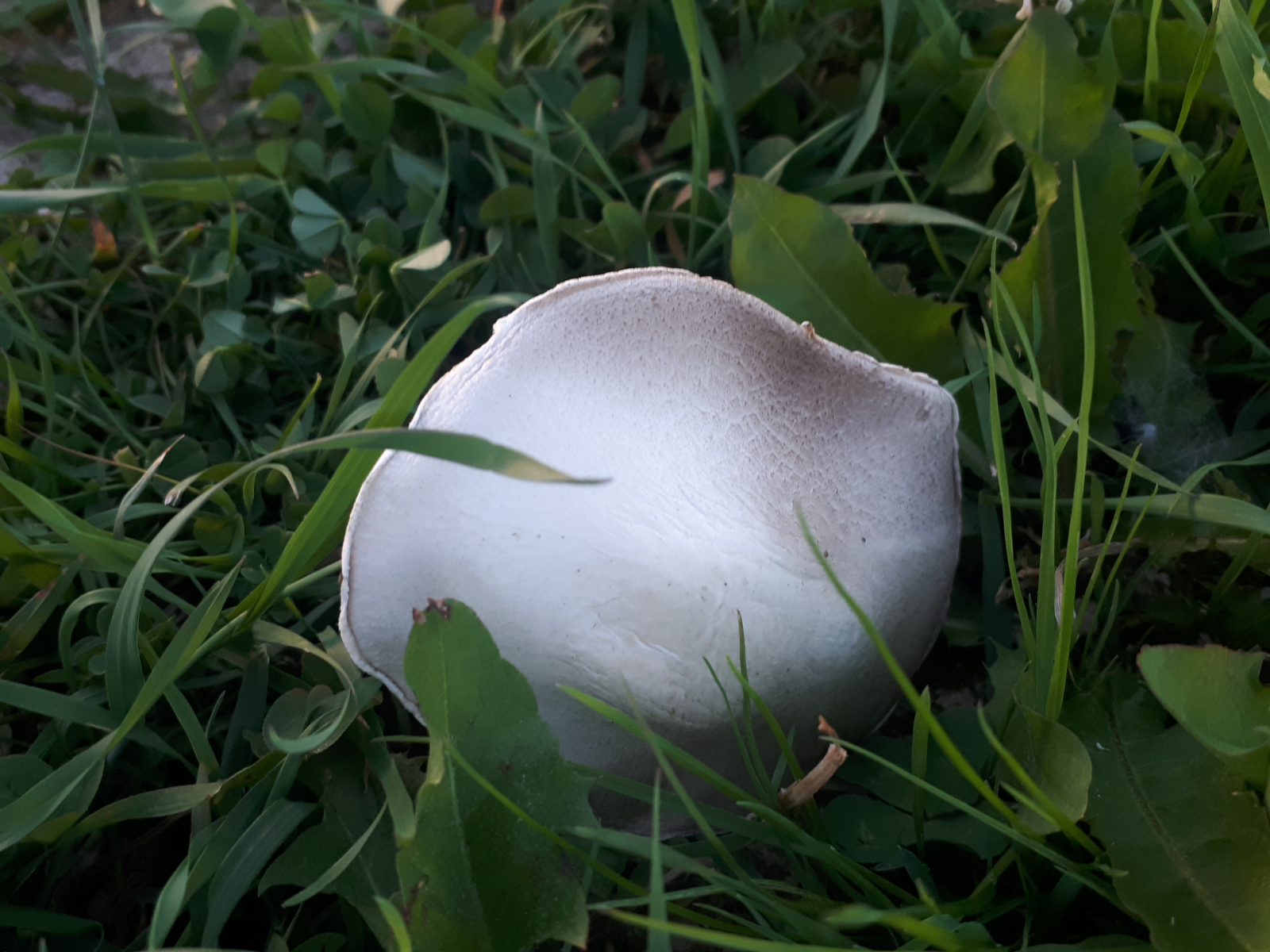der Stiel ist leider ein bisserl überbelichtet und gerade am Ring verdeckt ein Kleeblatt die Details... Ich sehe so nichts, was einem Wiesenegerlig im engen Sinne widersprechen würde, was nicht bedeutet, dass er einer ist. Der giftige Agaricus pseudopratensis muss auch nicht gilben und kann sehr ähnlich aussehen (gibt es auch rein weiß), riecht aber nach Karbol. Und dann gibt es unter den Wiesenegerlingen mehrere Arten. Der oberhalb des Rings glatte Stiel und der nicht schuppige Hut schließen aber schonmal Agaricus moellerianus aus.