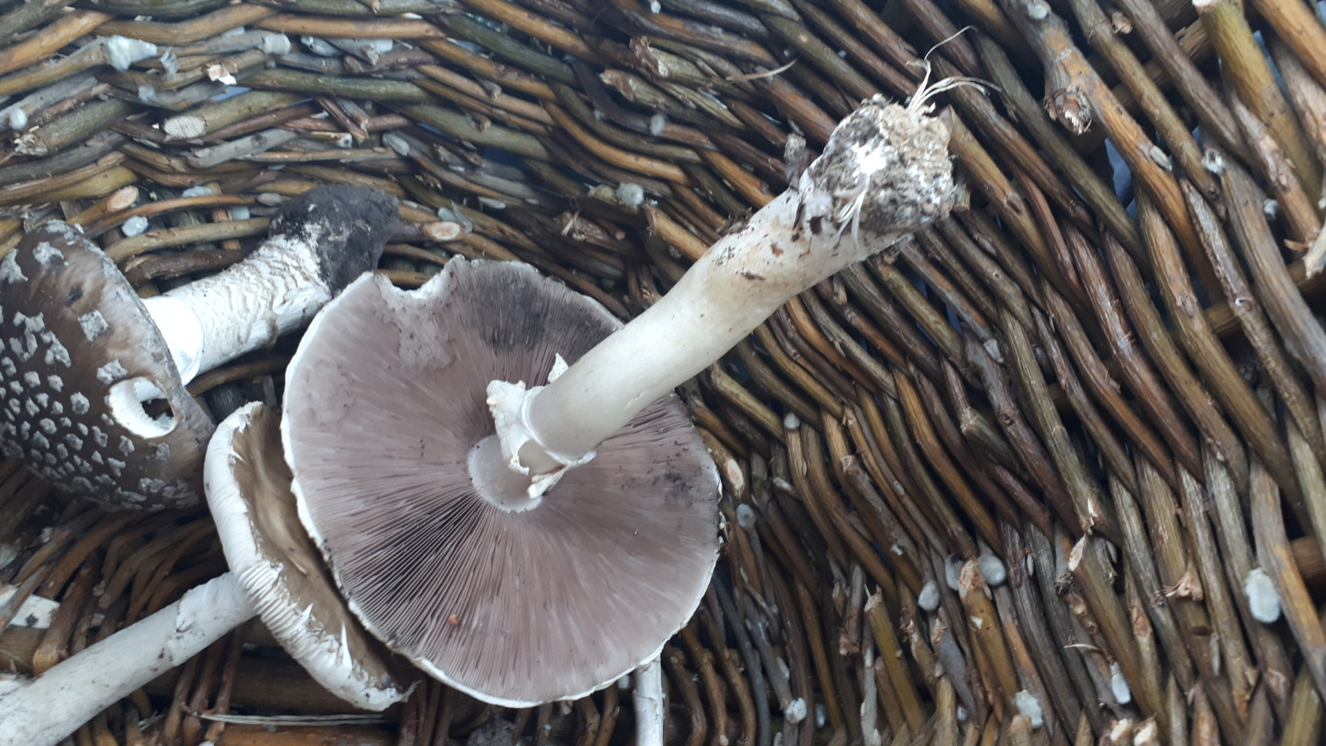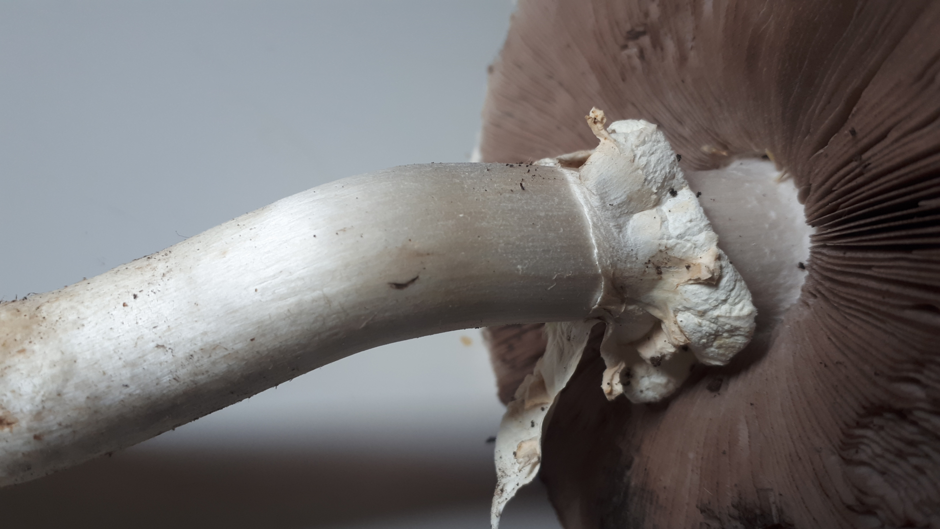 Ring nach unten abziehbar, mit Zahnradkranz (= Velum universale) - damit fallen schonmal alle "Zwergegerlinge" weg. Damit fällt auch sect. Sylvatici weg (Ring hängend) und auch sect. Arvenses (Ring hängend). Für sect. Chitonoides passt der Habitus nicht. Sect. Spissicaules fehlt der Zahnradkranz, fällt auch weg.