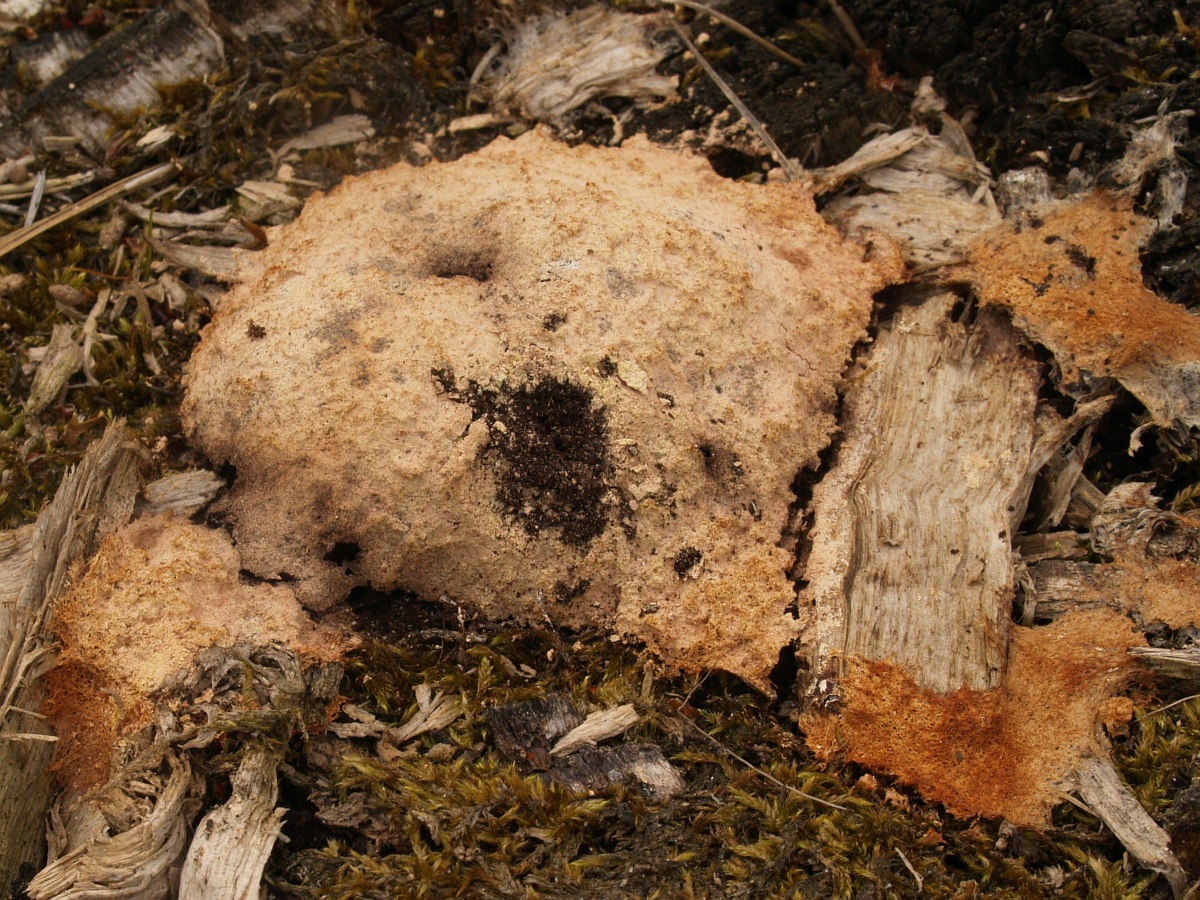 Auf einem mehrere Jahre alten Pappelstumpf machte es sich ein Verwandter der Gelben Lohblüte (Fuligo septica) gemütlich