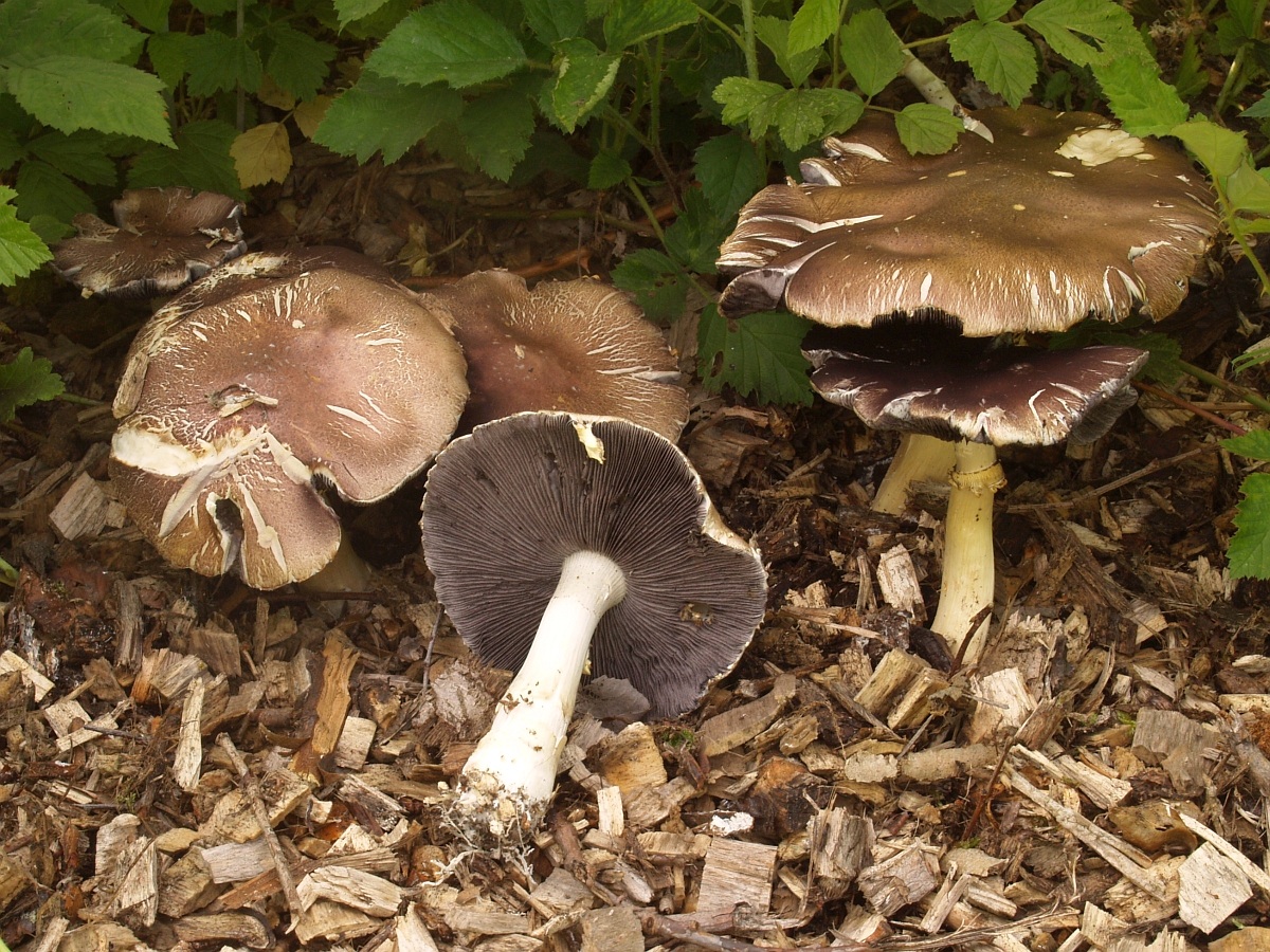 Auch an meinem Wohnort gab es erste Pilze. Auf einem Häckselhaufen hatten sich Träuschlinge unter Himbeerranken verborgen und hatten noch annähernd ihre normale Farbe behalten.