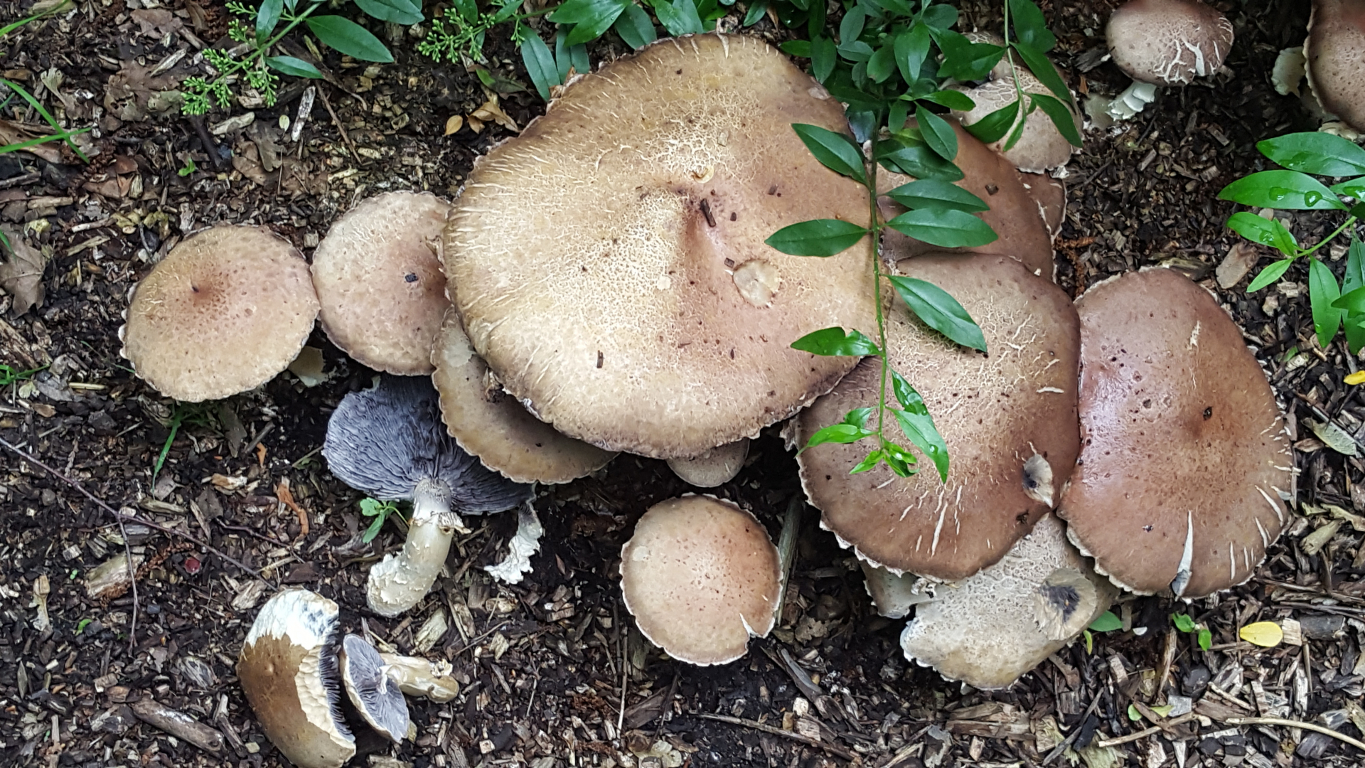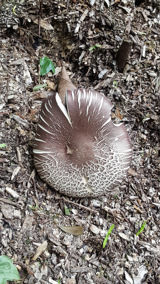 zum Glück sind die dunklen Lamellen mit blauem Schimmer zu sehen; demzufolge Stropharia rugosanulata, der Riesenträuschling.