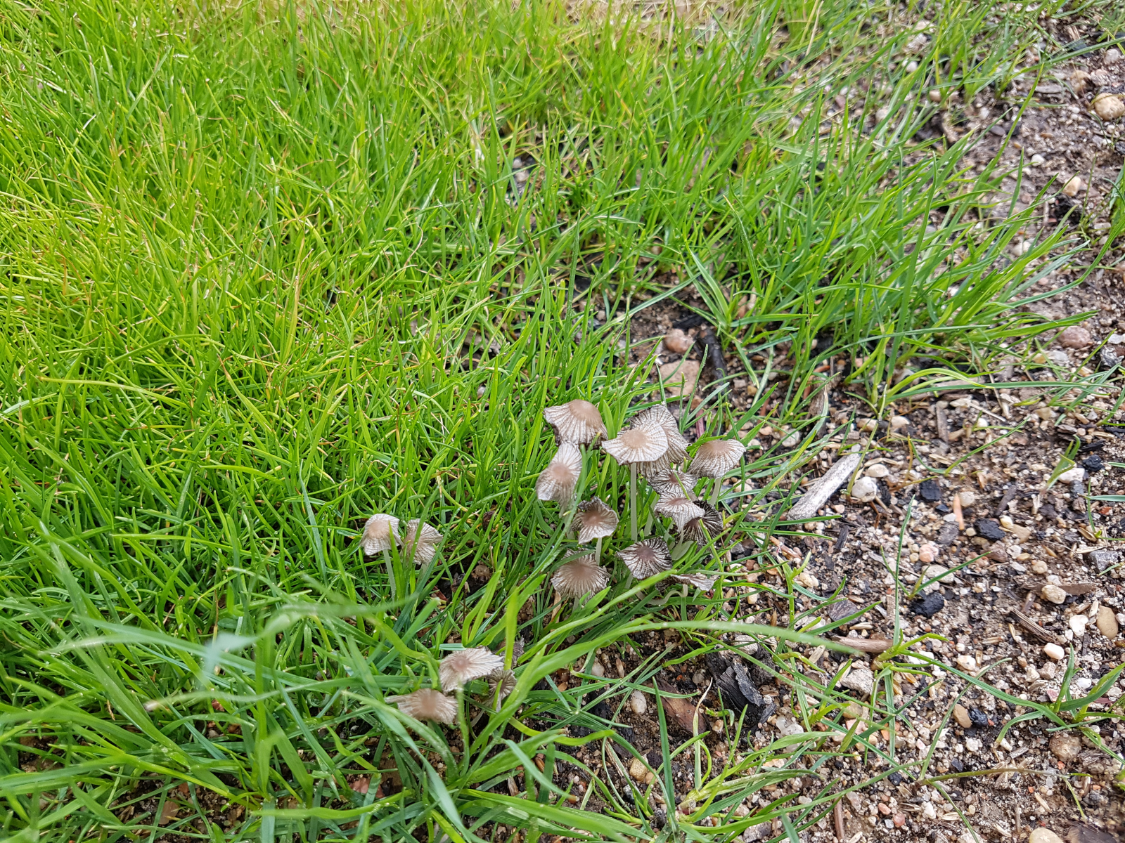 anhand der sich dunkel auflösenden Hüte würde ich bei den Pilzen auf etwas aus der Tintlings-Ecke tippen, Artbestimmung traue ich mich anhand des einen Fotos nicht. Tintlinge ernähren sich von totem organischen Material, tun deinem Rasen also nicht weh. Meines Wissens kommen in Deutschland kaum (keine?) für Laien "klassische" Pilze (also mit Stiel und Hut) vor, die Rasen schädigen.