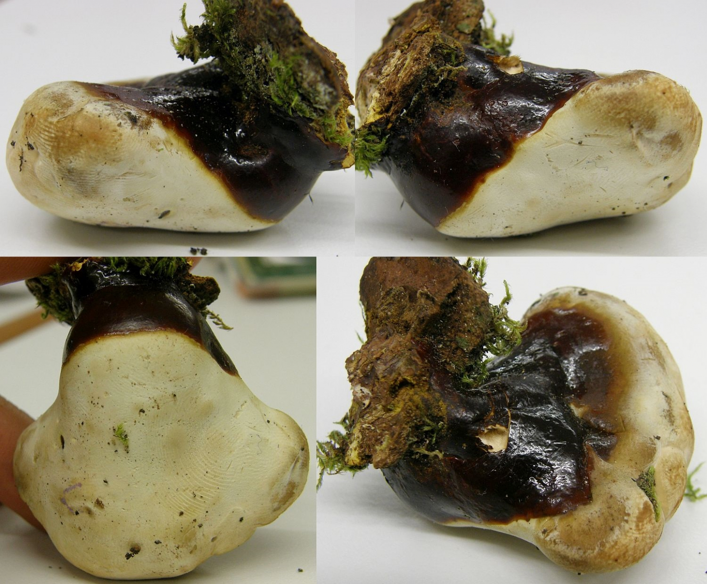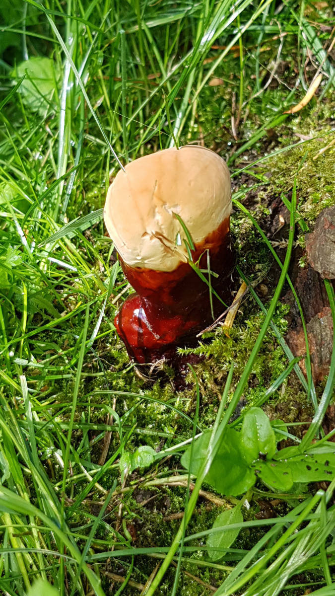 Der untere Teil ist glänzend braun wie eine frische Roßkastnie, die "Haube"" ist kremfarben und matt.