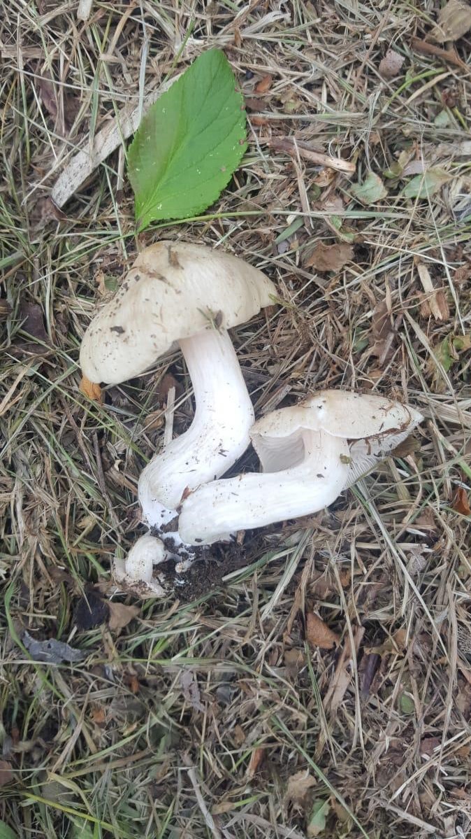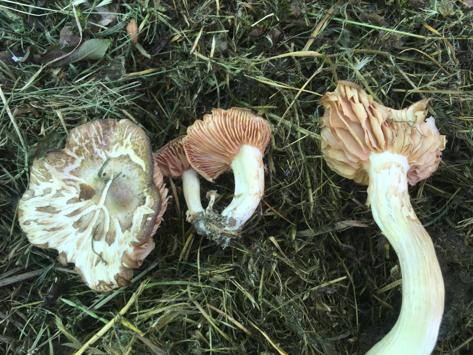 kürzlich hat mir eine Bekannte einige Bilder von neu erschienenen Pilzen in ihrem Garten gezeigt. Habitus, die bereits durch Sporen lachsrosa verfärbenden, angewachsenen Lamellen und Wuchs am Boden direkt unter einem Plaumenbaum, haben mich zügig in Richtung Schild- oder Schlehenrötling Entoloma clypeatum bzw. sepium gebracht.