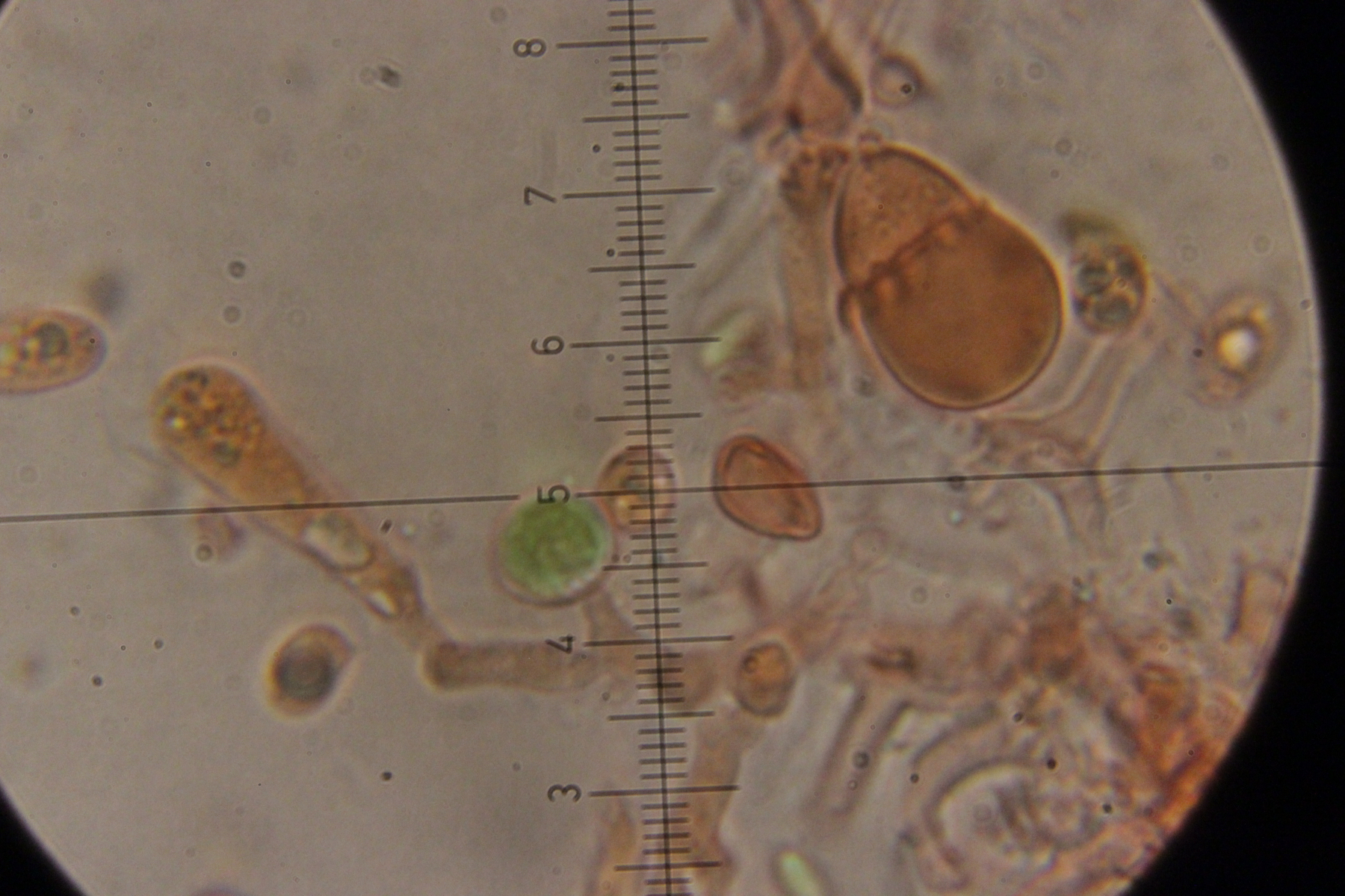 Was de Zystiden angeht, hab ich jetzt auch noch mal genauer hingeschaut. Vereinzelt gab es Zystiden mit Längen von ca 100 µm. Was die Formen angeht, gab es da auch einige verschiedene Zystiden: Zylindrische die oben eine etwas dickere Wand haben, zugespitzere Zystiden und einige mit Kopf. Außerdem gab es eine Zystide, die so etwas wie einen Kristallschopf hat, das kann aber natürlich auch täuschen und sich bloß um Schmock handeln. Außerdem gab es noch vereinzelt so rundliche zystidenartige Gebilde, die an Eierbecher erinnern. Könnten das Stephanozysten sein? Dann würde ich hier am ehesten zu Peniophorella praetermissa tendieren.