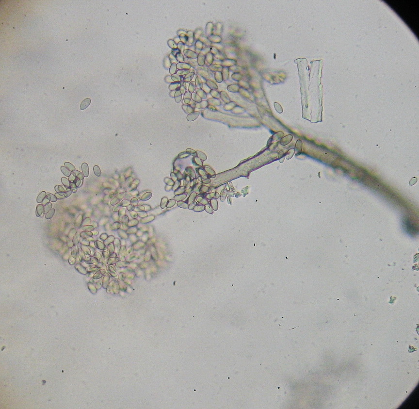 800-1000 x 10-12µ, braun, verzweigt, septiert. Spitze hyalin, Sporen in Trauben