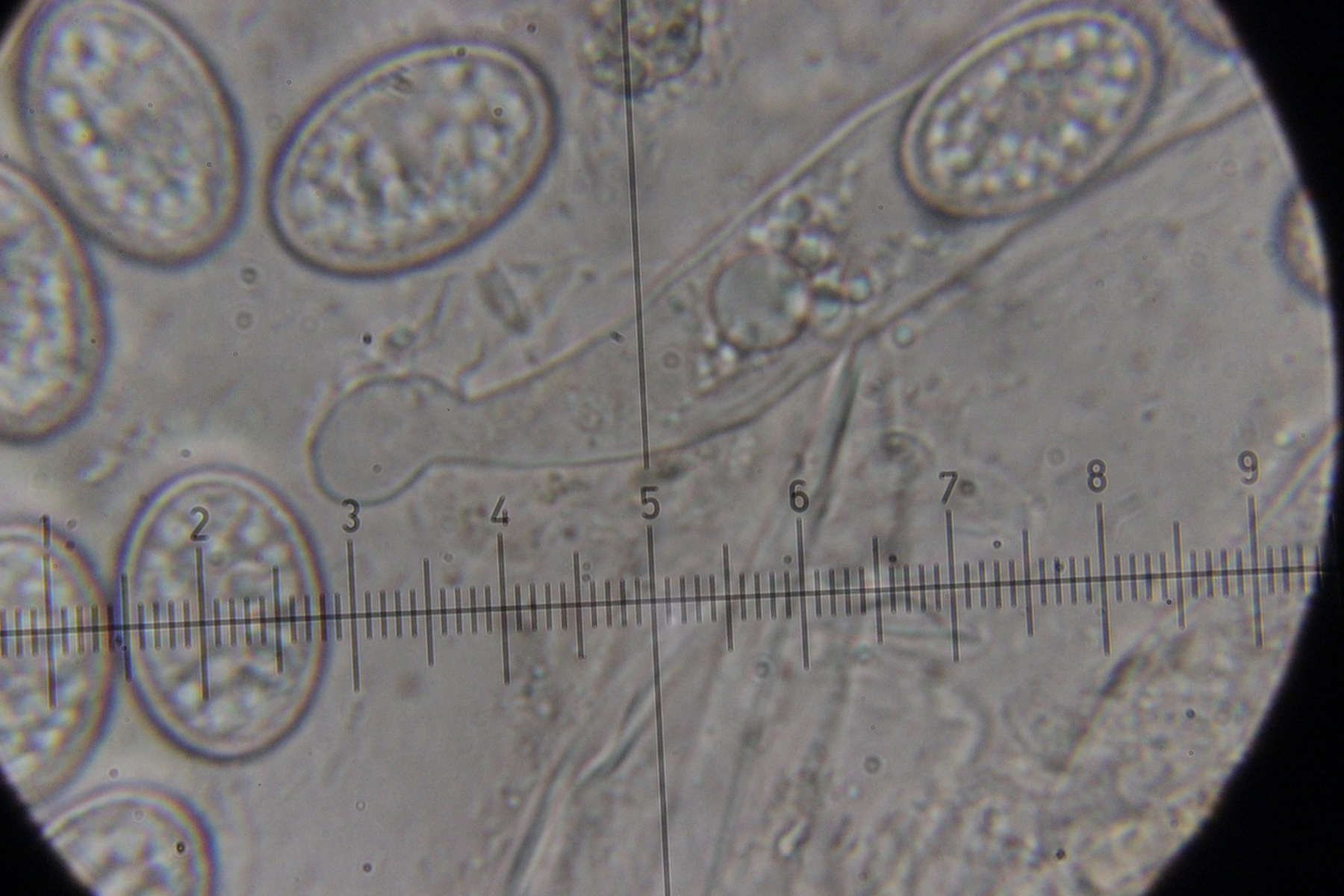 • Zur Scutellinia. Sporengröße (19.3 +- 0.6) µm x (11.8 x 0.2) µm. Ascus 250 µm x 22 µm, Ascusfuß 25 µm x 13 µm. Randhaare um die 1.4 mm, Haardicke 33 µm, Haarwanddicke 5-6 µm. Sporen ganz fein warzig. Womit schlüssel ich das jetzt am besten?
