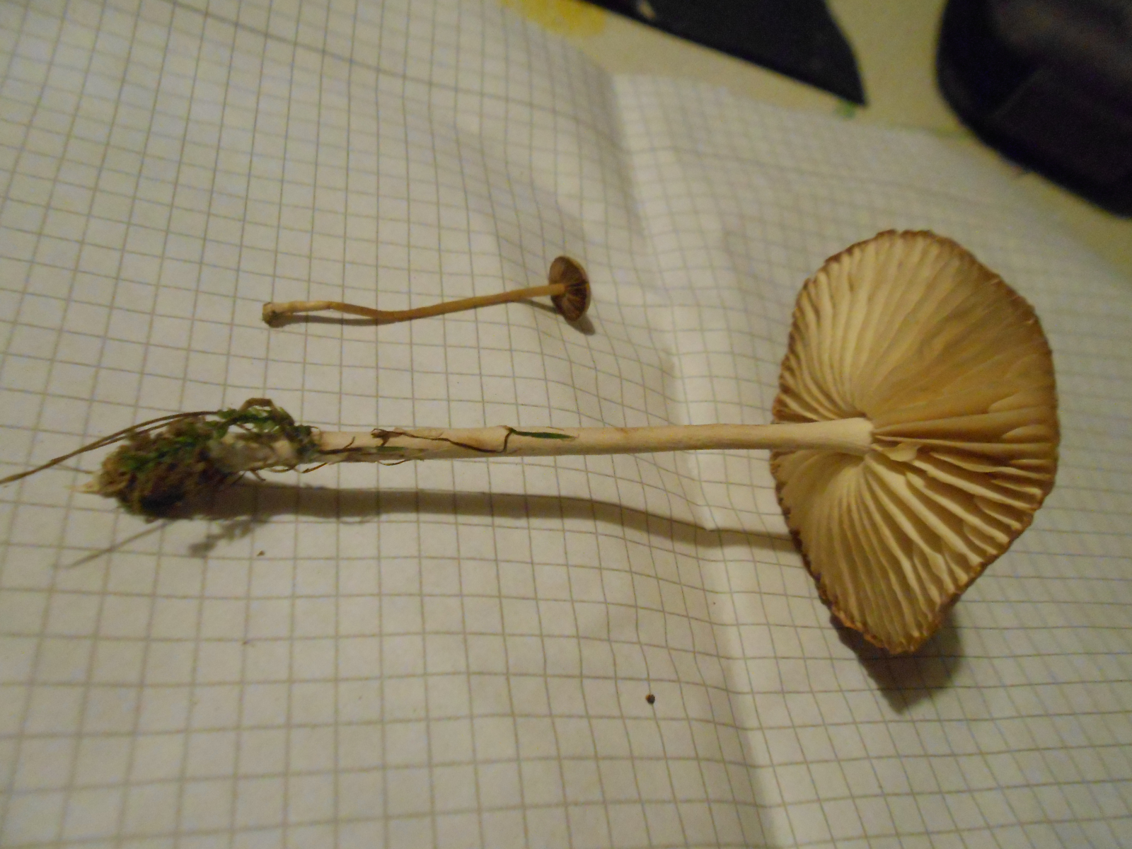 Dem kleineren FK konnte ich kein Sporenpulver entlocken. Die Lamellen wurden beim Trocknen bräunlich, er schirmte auch nicht weiter auf. Die Kleinen wuchsen in einer Gruppe mit den Großen. Sie sind eher gelblich-bräunlich in allen Teilen. Vielleicht sehr junge Exemplare der Größeren, vielleicht was Anderes? ==Gnolm11