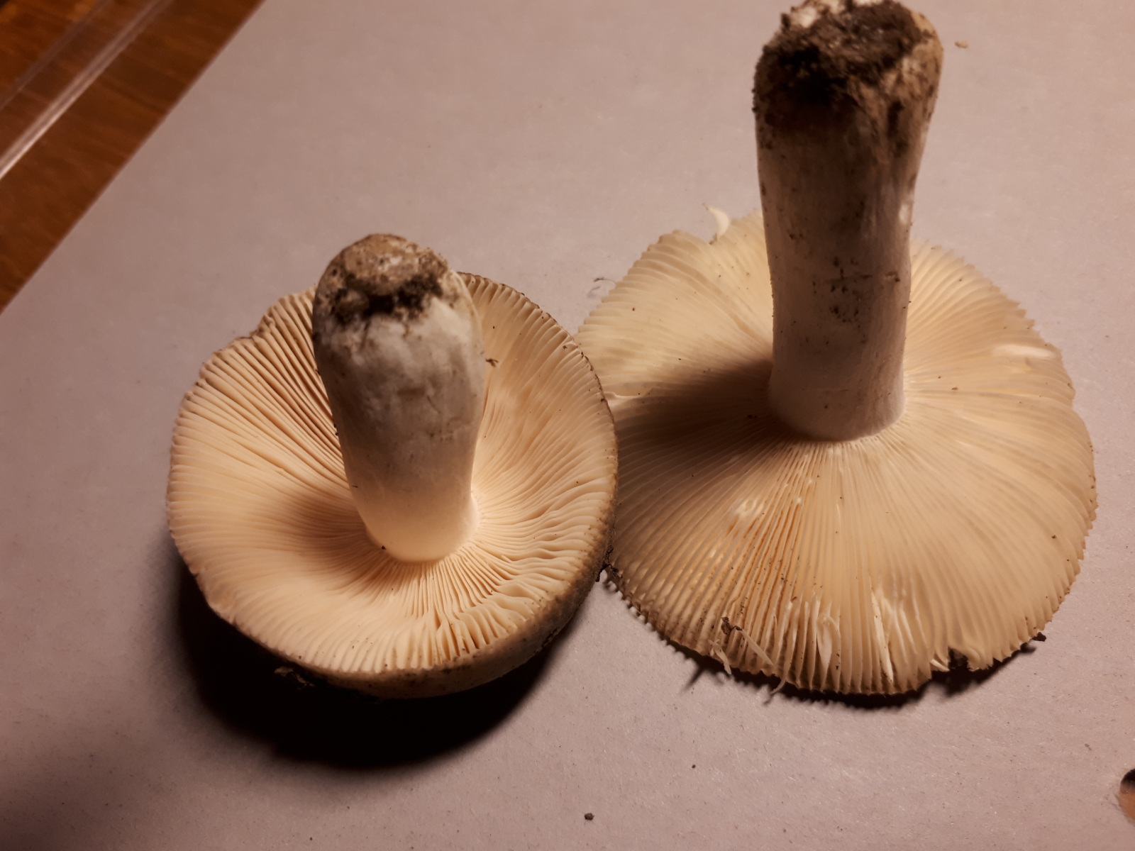 Nr. 2 kommt aus dem Buchenwald. Aufgrund der leicht hochgezogenen Huthaut und der Färbung vermute ich den Speisetäubling (R. vesca). In der Mitte der Huthaut meine ich fadenförmige Gebilde gefunden zu haben, was das unterstützen würde.