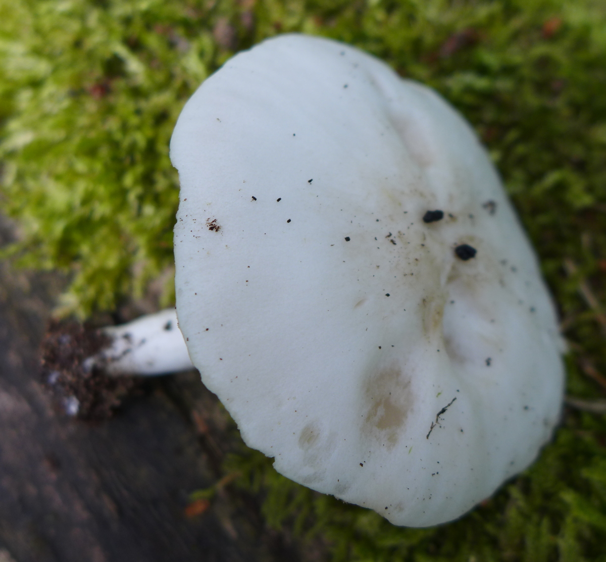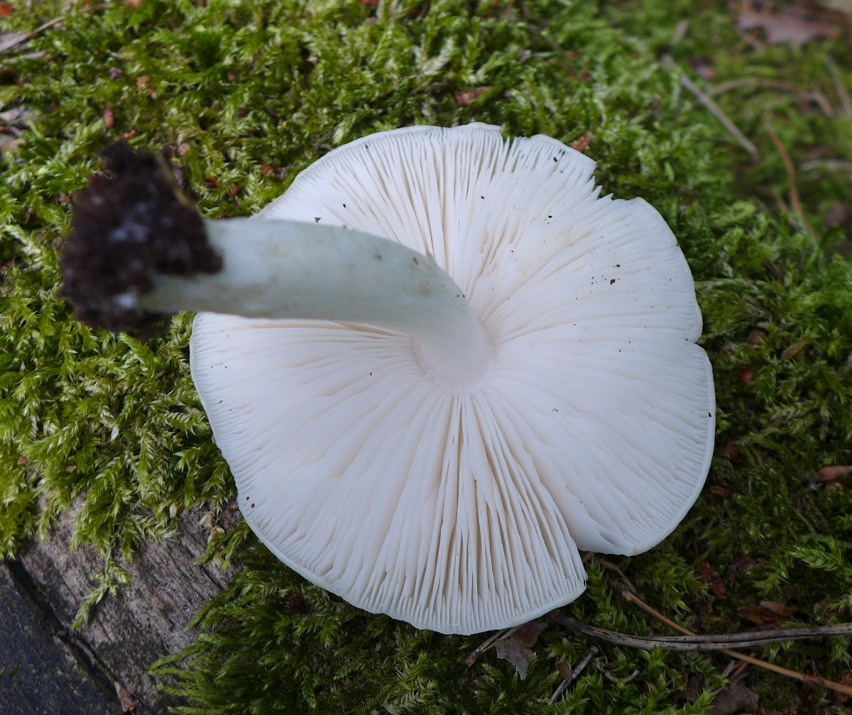 Dachpilz, 8 cm Hutdurchmesser, Habitus eines rehbraunen, Hut und Stiel weiß, deutlicher Rettichgeruch, auf liegendem, noch nicht übermäßig stark vermorschtem Laubholzstamm gewachsen.