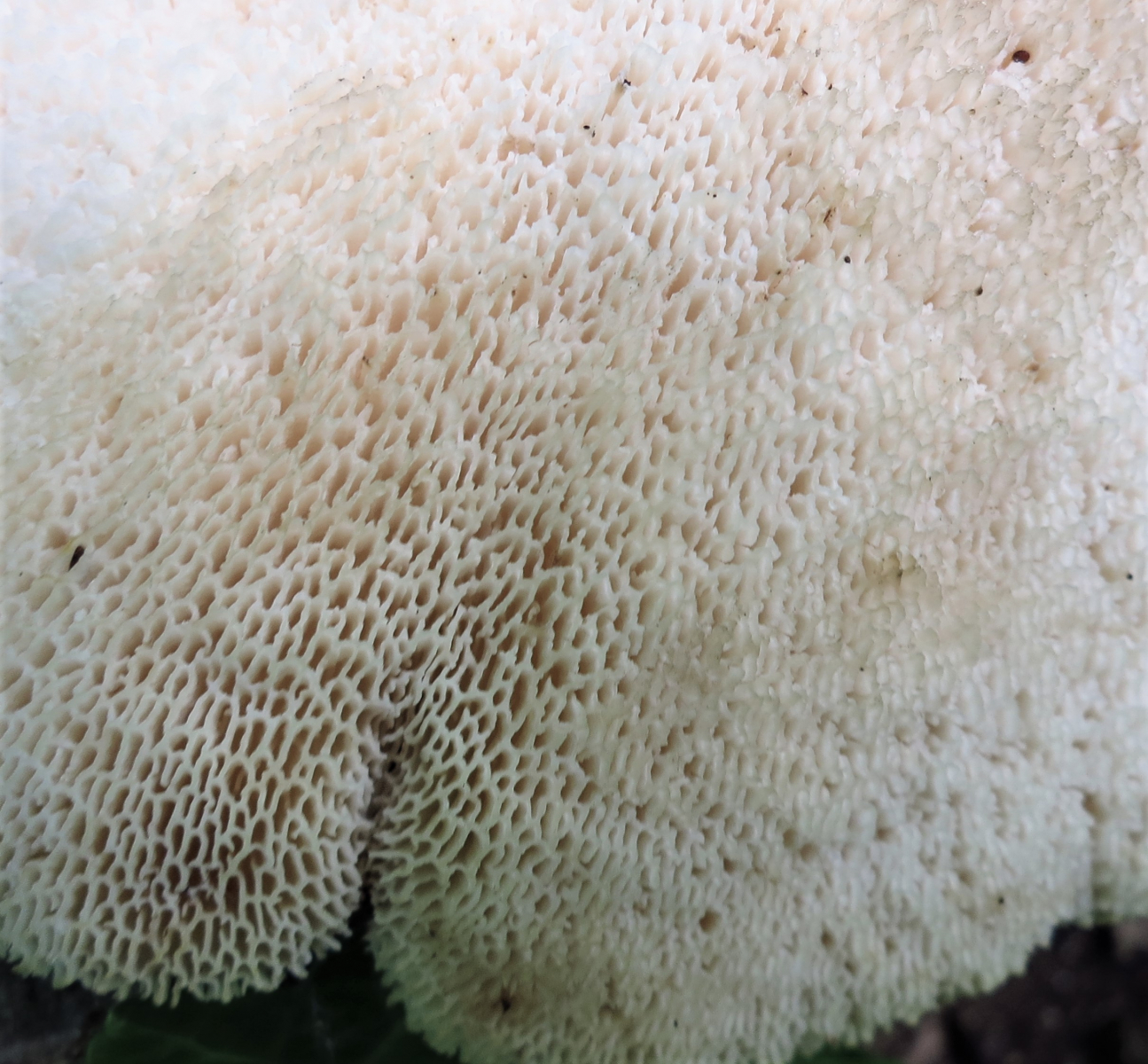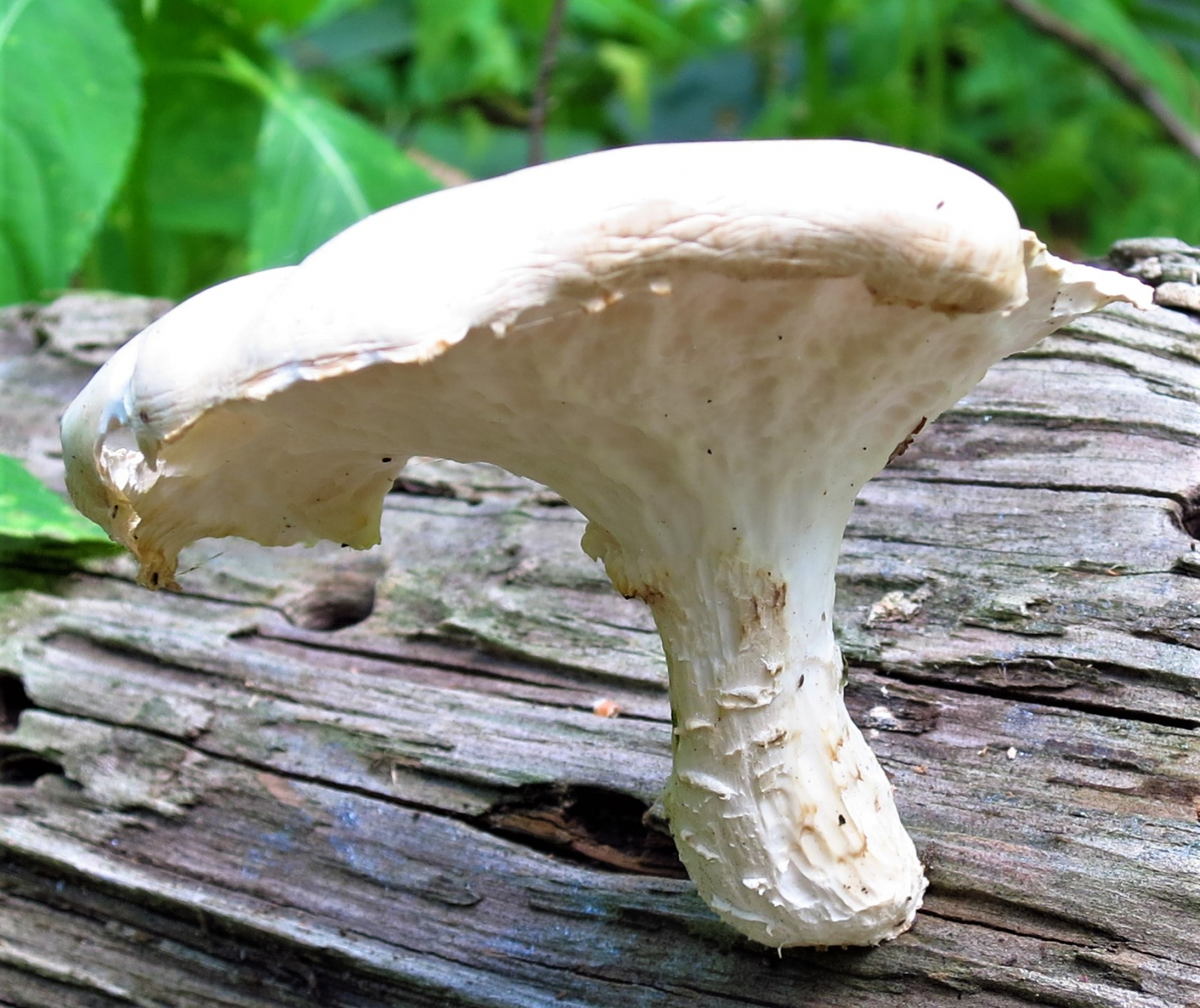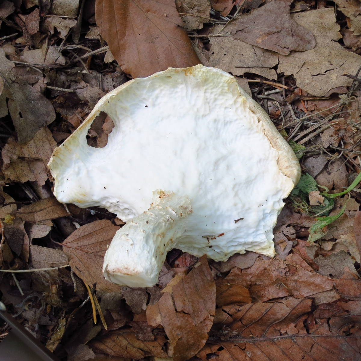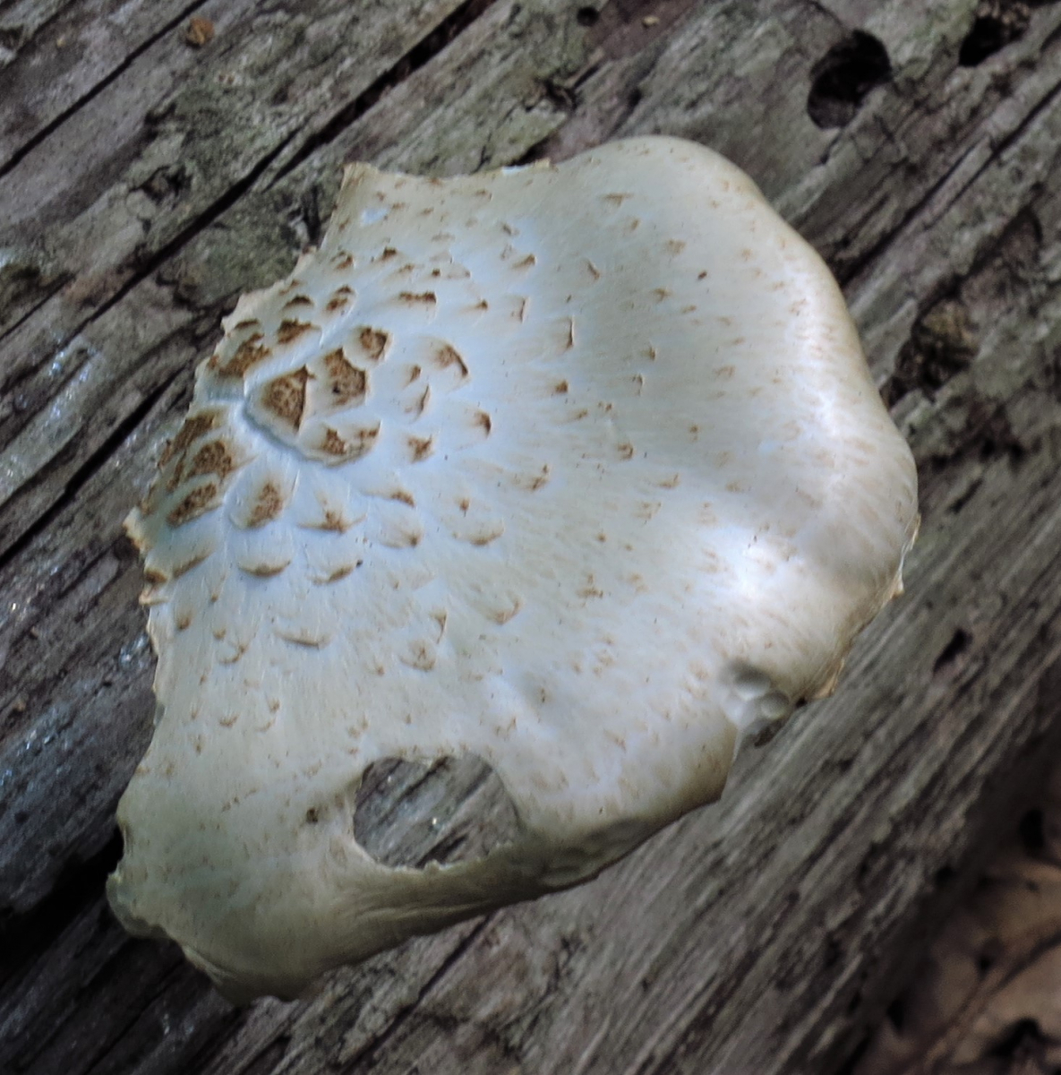 Farbe: Hut hell cremefarbig bis weiß mit wenig bräunlichen Schüppchen, Stiel ebenso ohne Schüppchen