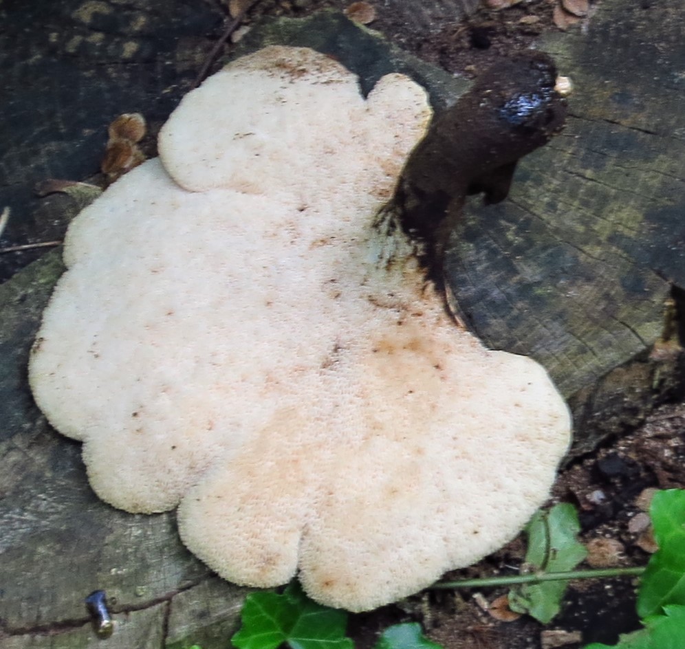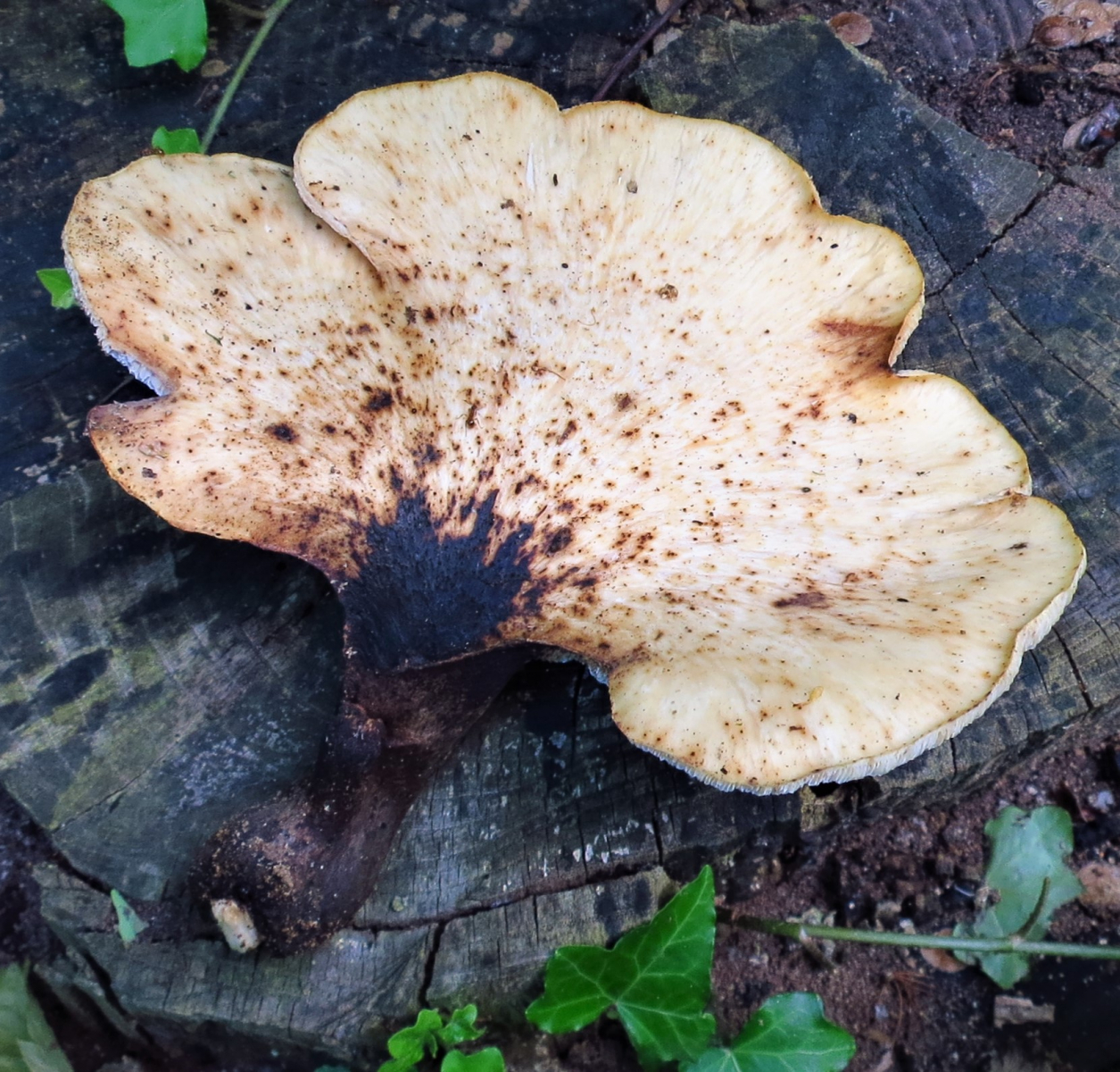Farbe: cremefarbig mit dunkel braunen Schüppchen, Stiel schwarz, Poren cremefarbig bis weiß