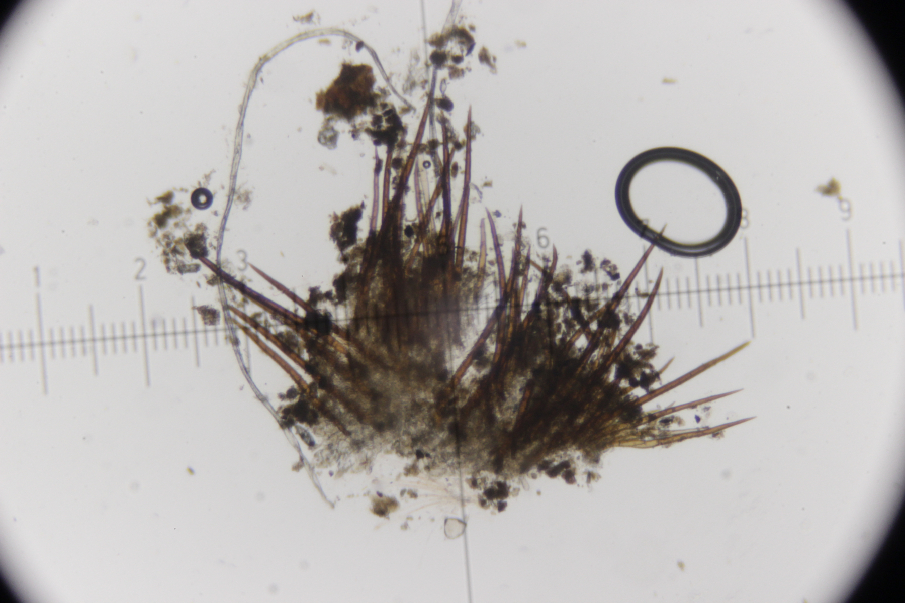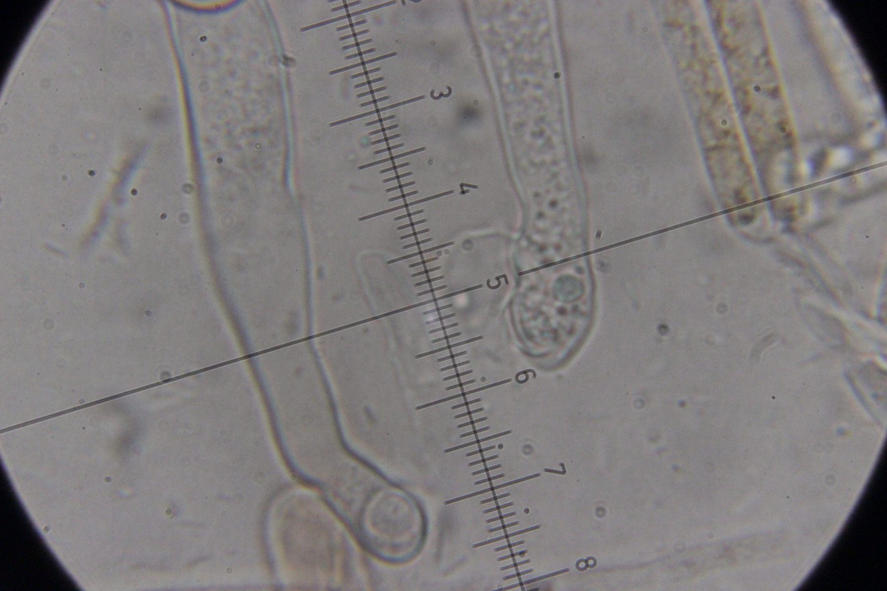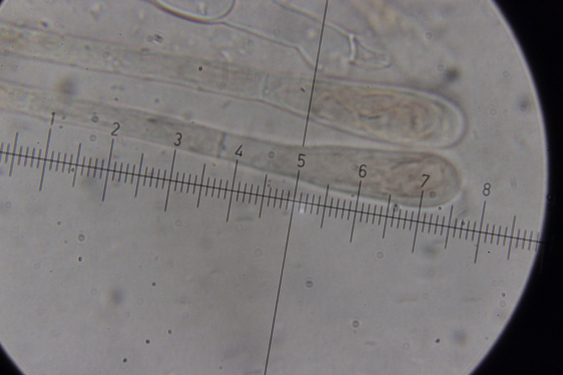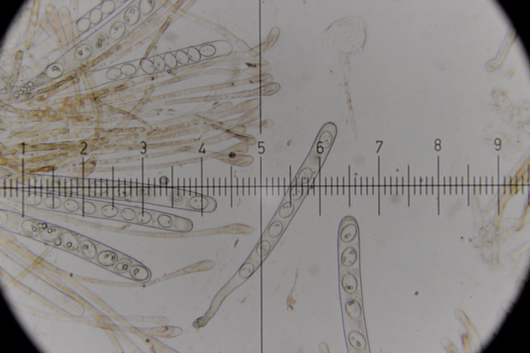6. Eine Scutellinia. Sporengröße (19.4 +- 0.7 ) x (13.3 +- 0.5) µm, Asci 195-220 µm lang und 16-23 µm breit. Randhaare 400-470 µm lang, 23 µm breit, Wanddicke 4-5 µm. Sporen warzig und mit vielen Öltröpfchen. Auffällig die geteilten Paraphysen. Fruchtkörper waren sehr groß (geschätzt >1 cm Durchmesser) und wuchsen im Morast auf totem organischen Material wie Eicheln, Stöckchen und Blättern.