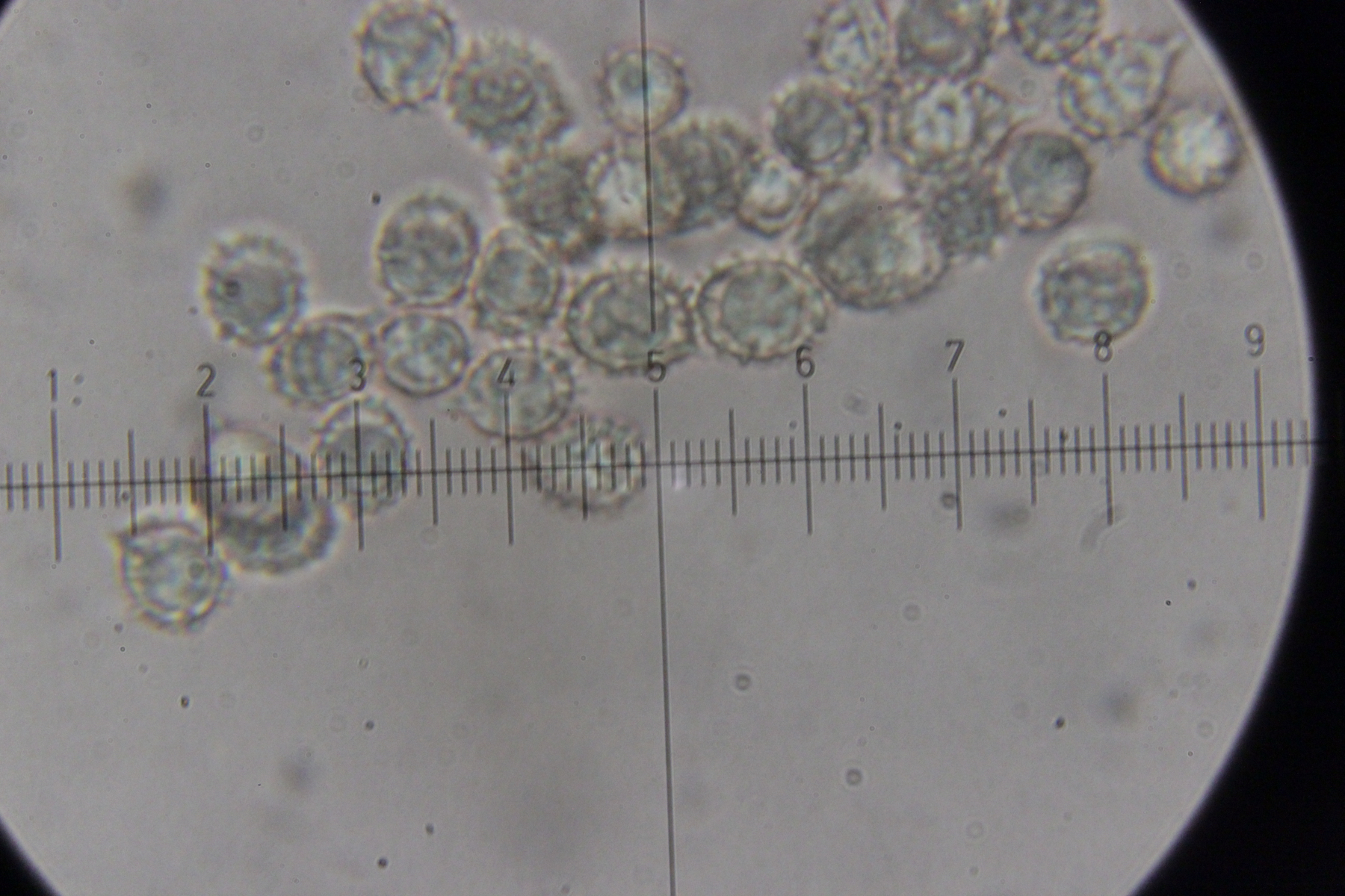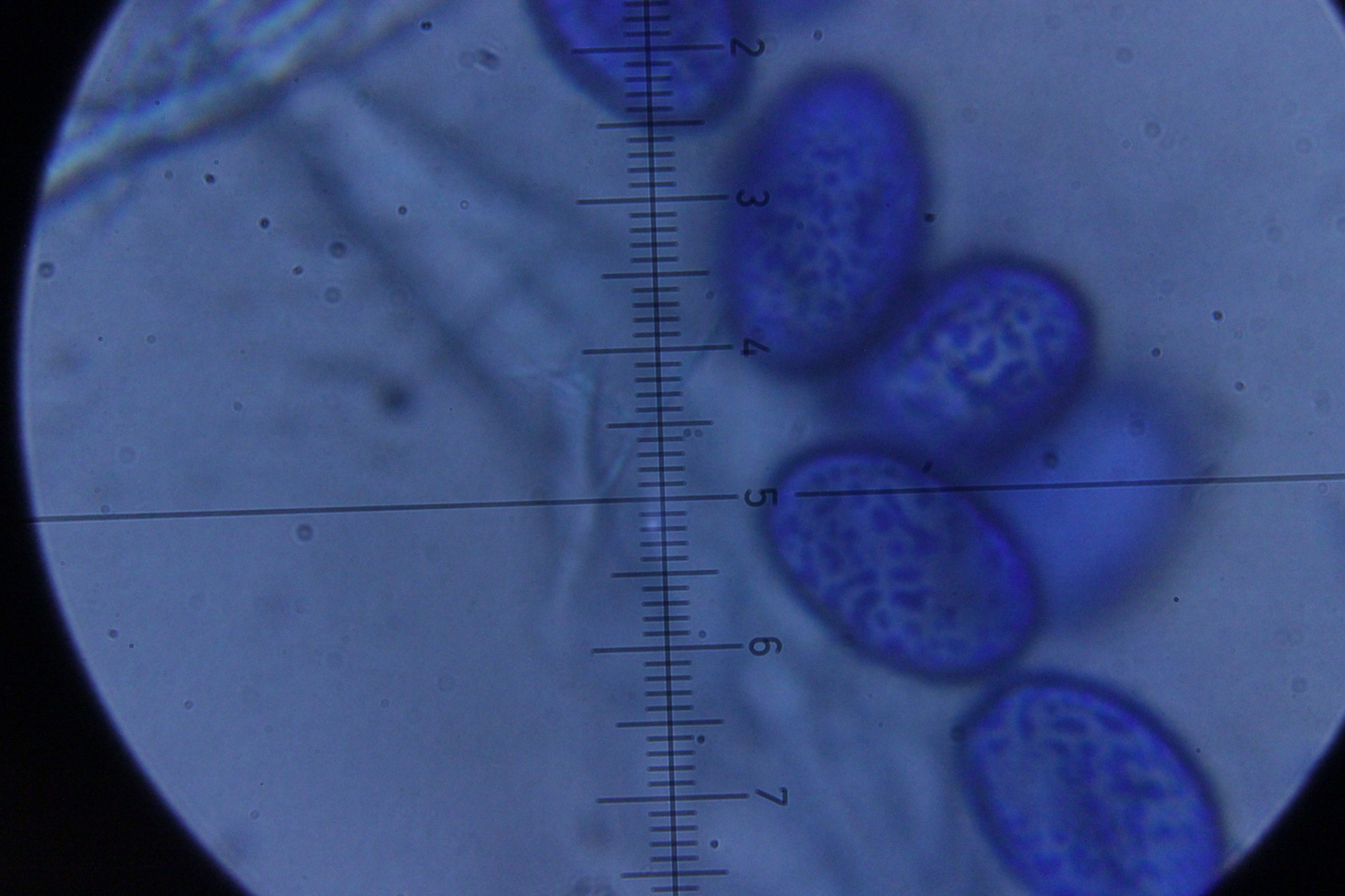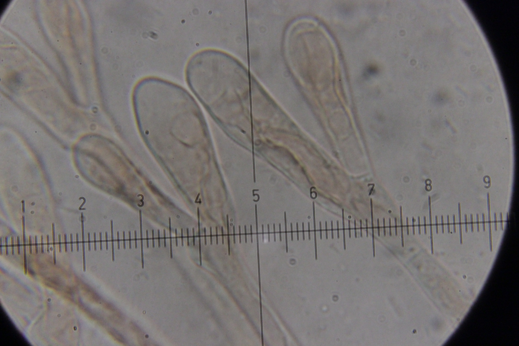 6. Eine Scutellinia. Sporengröße (19.4 +- 0.7 ) x (13.3 +- 0.5) µm, Asci 195-220 µm lang und 16-23 µm breit. Randhaare 400-470 µm lang, 23 µm breit, Wanddicke 4-5 µm. Sporen warzig und mit vielen Öltröpfchen. Auffällig die geteilten Paraphysen. Fruchtkörper waren sehr groß (geschätzt >1 cm Durchmesser) und wuchsen im Morast auf totem organischen Material wie Eicheln, Stöckchen und Blättern.